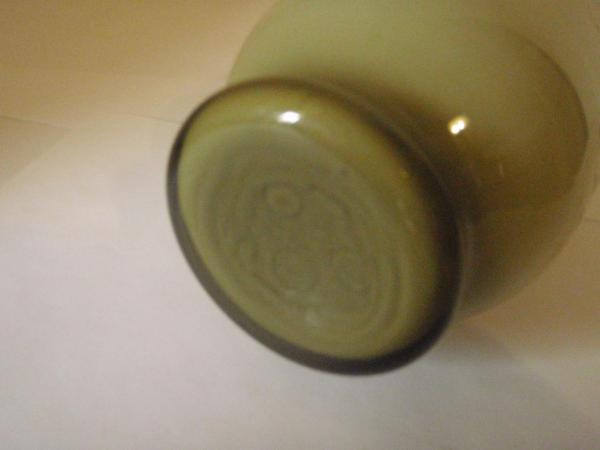 This vase is olive green on the outside and white on the inside it has a gold trim on the lip of the top with a picture of a peacock and flowers on both sides.It is hard to tell if it is glass or porcelain I think it is porcelain with a coloured glaze on the outside.It has three circle marks on the bottom from the machine it was made on other than that no other marks.I have searched everywhere but can not seem to find what it is or put a value on it.