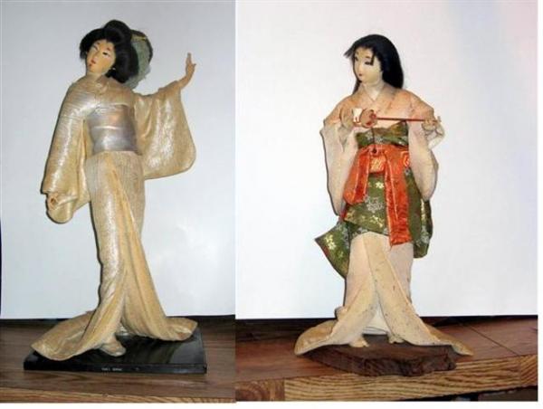 These geisha dolls (and one samurai) were part of a rather large collection of dolls left in a vacant house my son bought to restore and rent. He was told by neighbors that the collection was owned by a 95 year old gentleman who was stationed in Japan during and after WW2.  He and his wife made several trips back to Japan and bought these back as souvenirs. The dolls were kept in a glass cabinet for many years. But when the old gentleman became sick, a relative wanted the cabinet but not the dolls, and just left the dolls out, some on a table, some on the floor.  Most were in good shape, just a little dusty - a couple did not fare so well. My son wanted to just throw them away but they were so unique, so detailed and unusual I felt someone would love to have them. Fortunately the couple had labeled most of them so I could research and ID them. One was a geisha courtesan stepping out of a taxi or paladin(?), I think there is a story concerning that. Another was the Wisteria Maiden, and another was Yuki-onna, the Snow Maiden spirit, but she sadly is one that is in bad condition. I'm posting a photo of the entire collection - I have sold most of them locally for $20-$30. I had several out-of-town inquiries, but didn't want to risk damage by shipping them. I feel that they were worth much more but just wanted someone to have them who would appreciate them.  The ones I have left are individually pictured: the Maiko and her onesan or mentor; the Geisha playing the shamisen or lute; and the ones in bad shape in the last picture - Yuki-onna and one with long hair. I would appreciate anything you could tell me about the dolls. Thanks.
