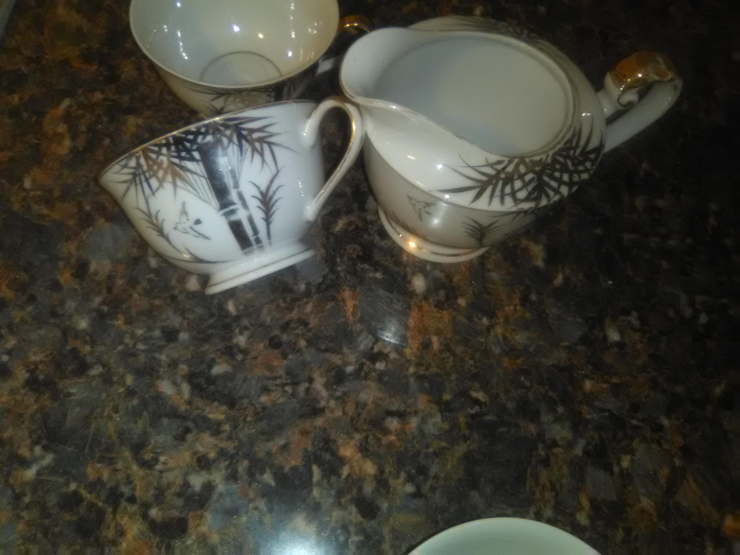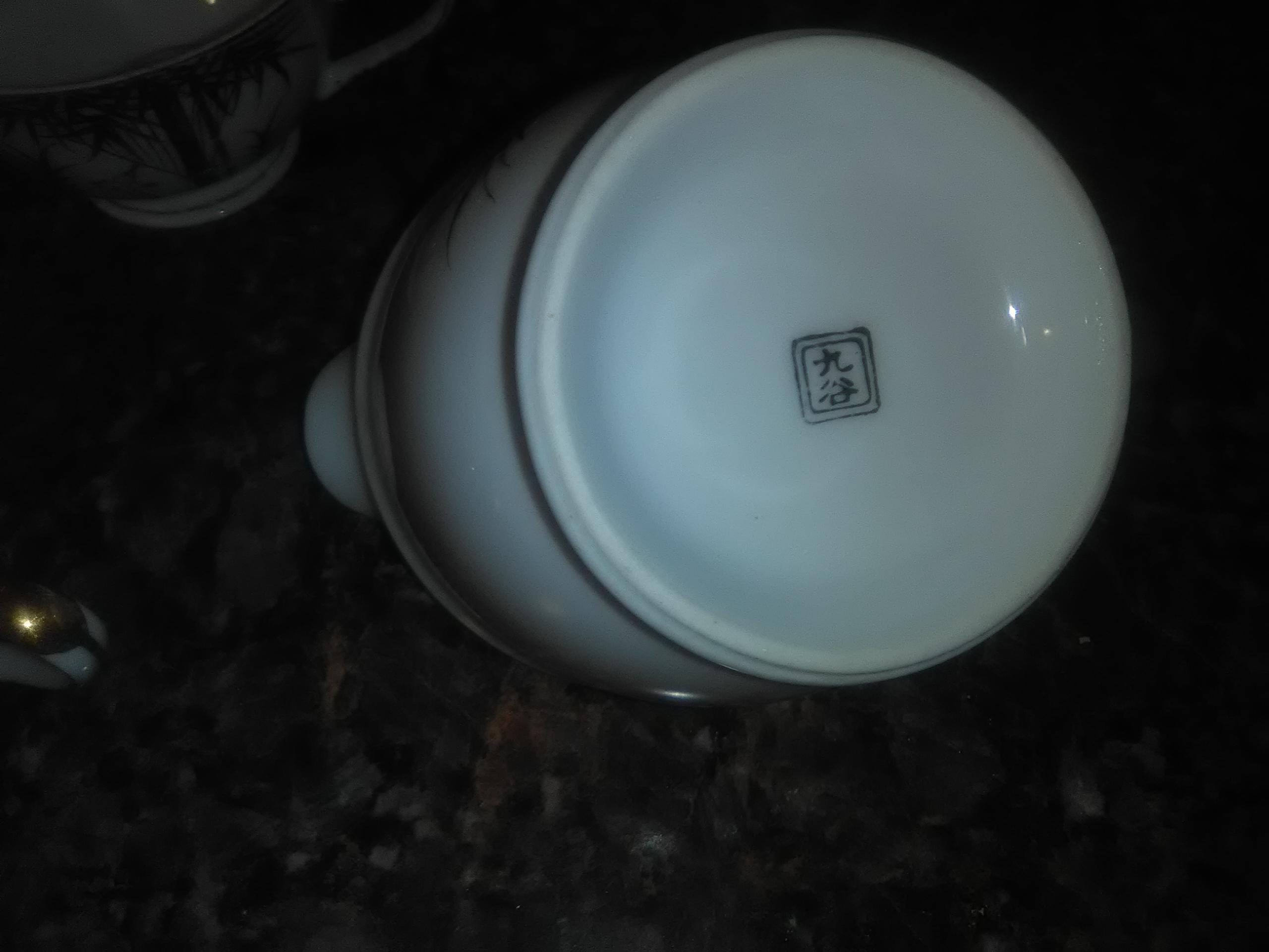 Geisha imprint in the bottom of cups and hieroglyphics on the bottom of tea server