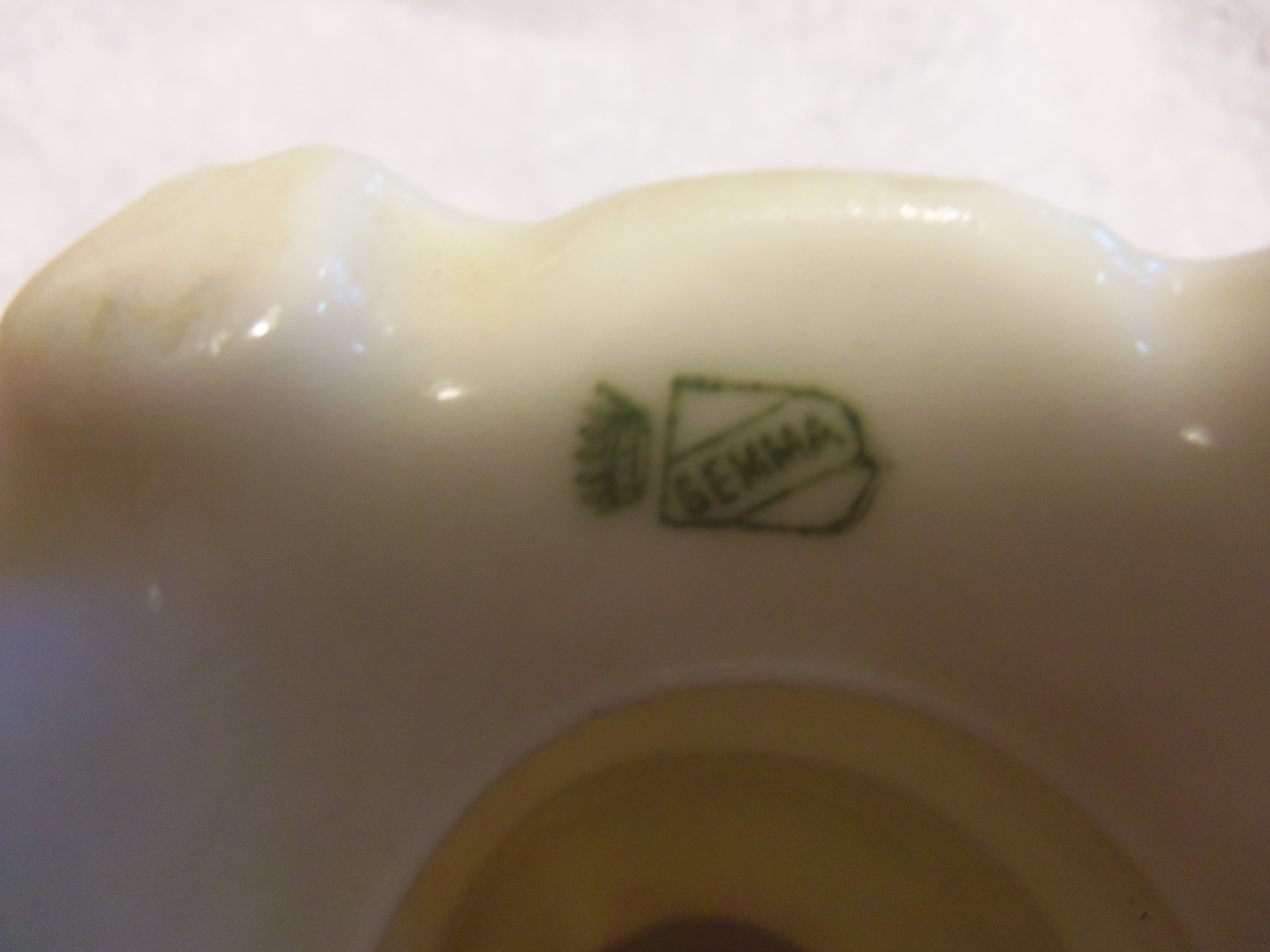 This appears to be a porcelain candle holder with a pink flower on one side. Not sure what type of flower. There is a gold painted (hand painted?) bow on the front and back near the top. Some gold paint down at the bottom of the front. I really know nothing about this.