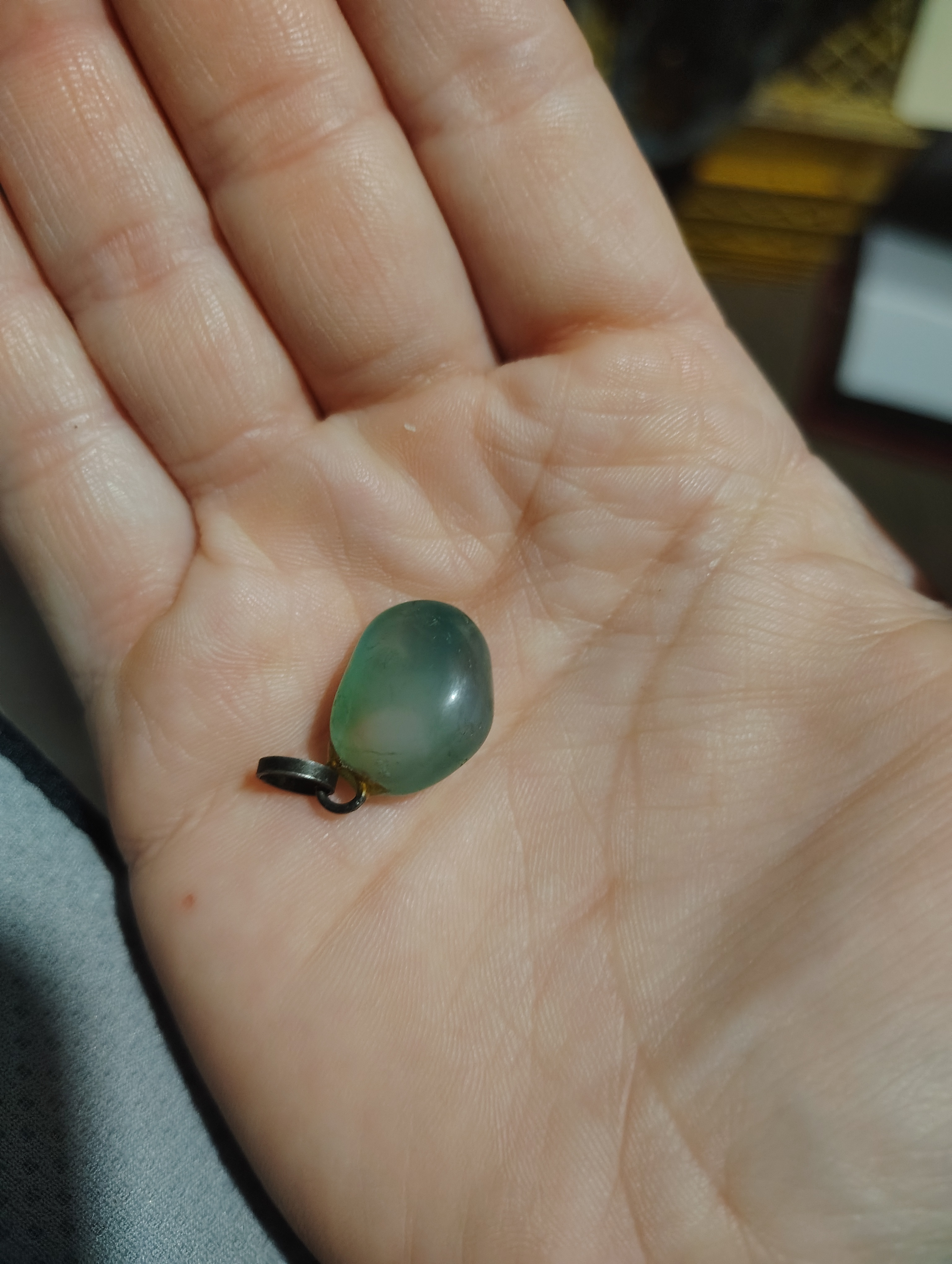Physical Description: This item is a small gemstone pendant, approximately 1 inch in length and 0.5 inches in width. The stone exhibits a translucent quality with a greenish hue, possibly indicating it is a type of chalcedony or agate. The pendant is attached to a metal bail, which appears to be silver, though the exact metal composition is not confirmed.