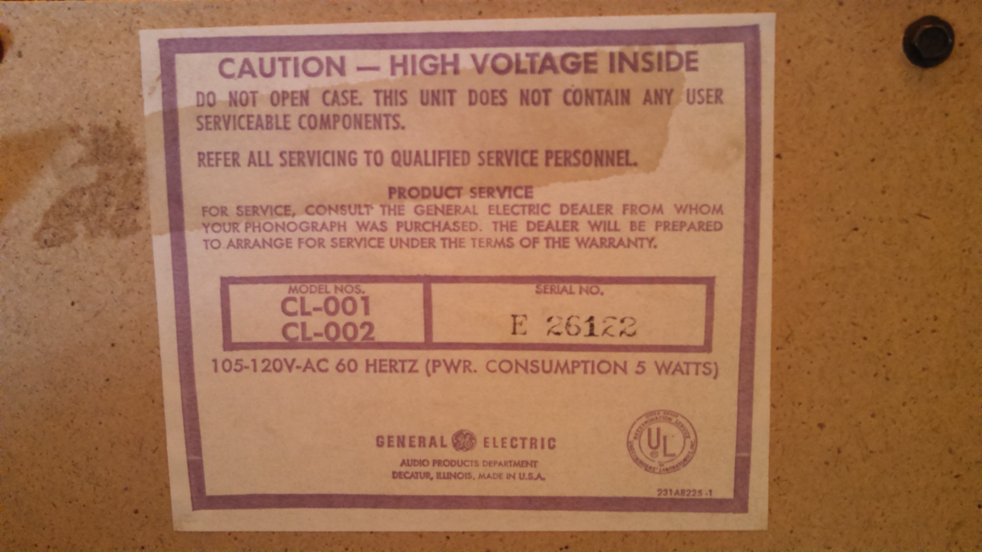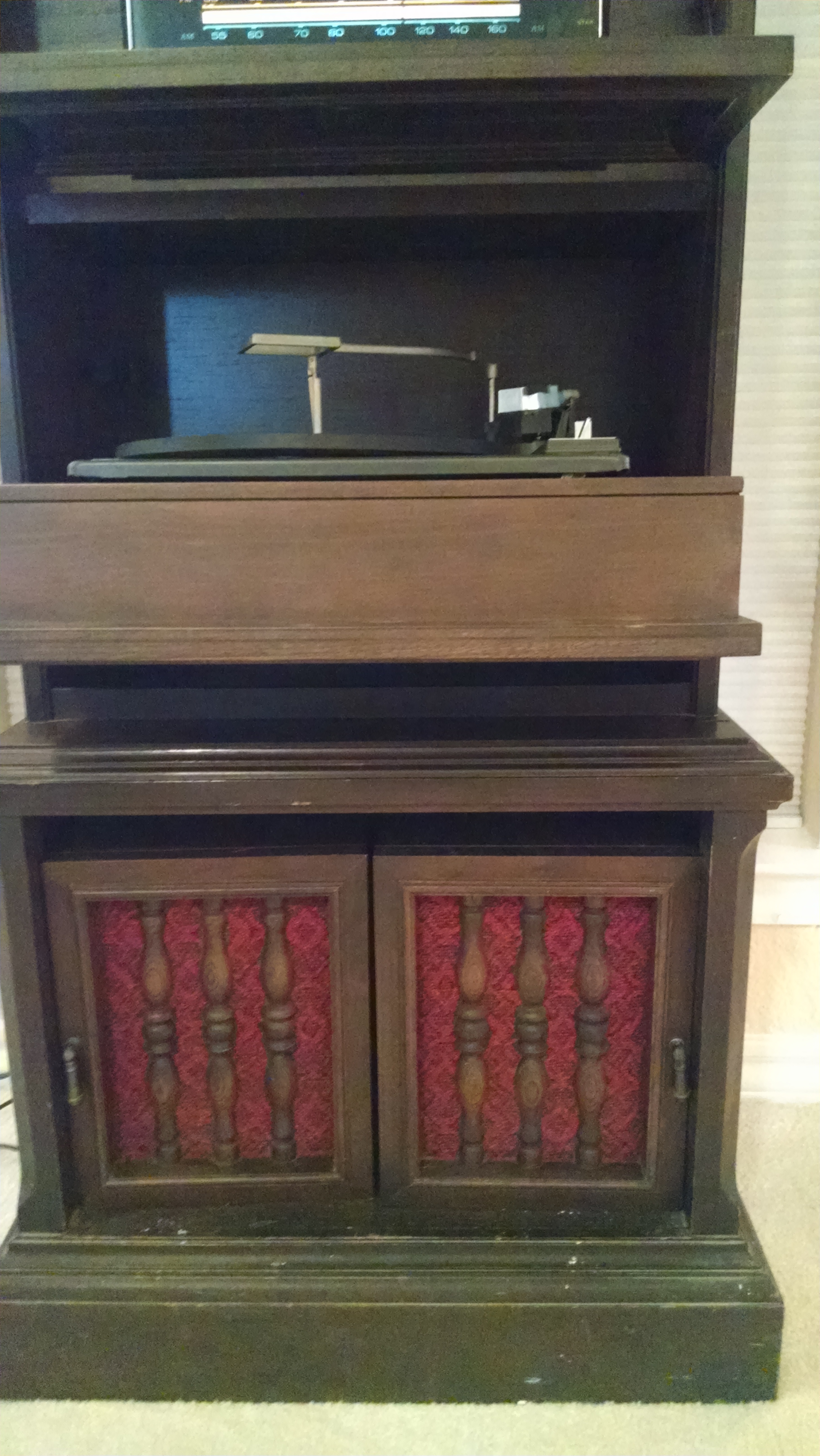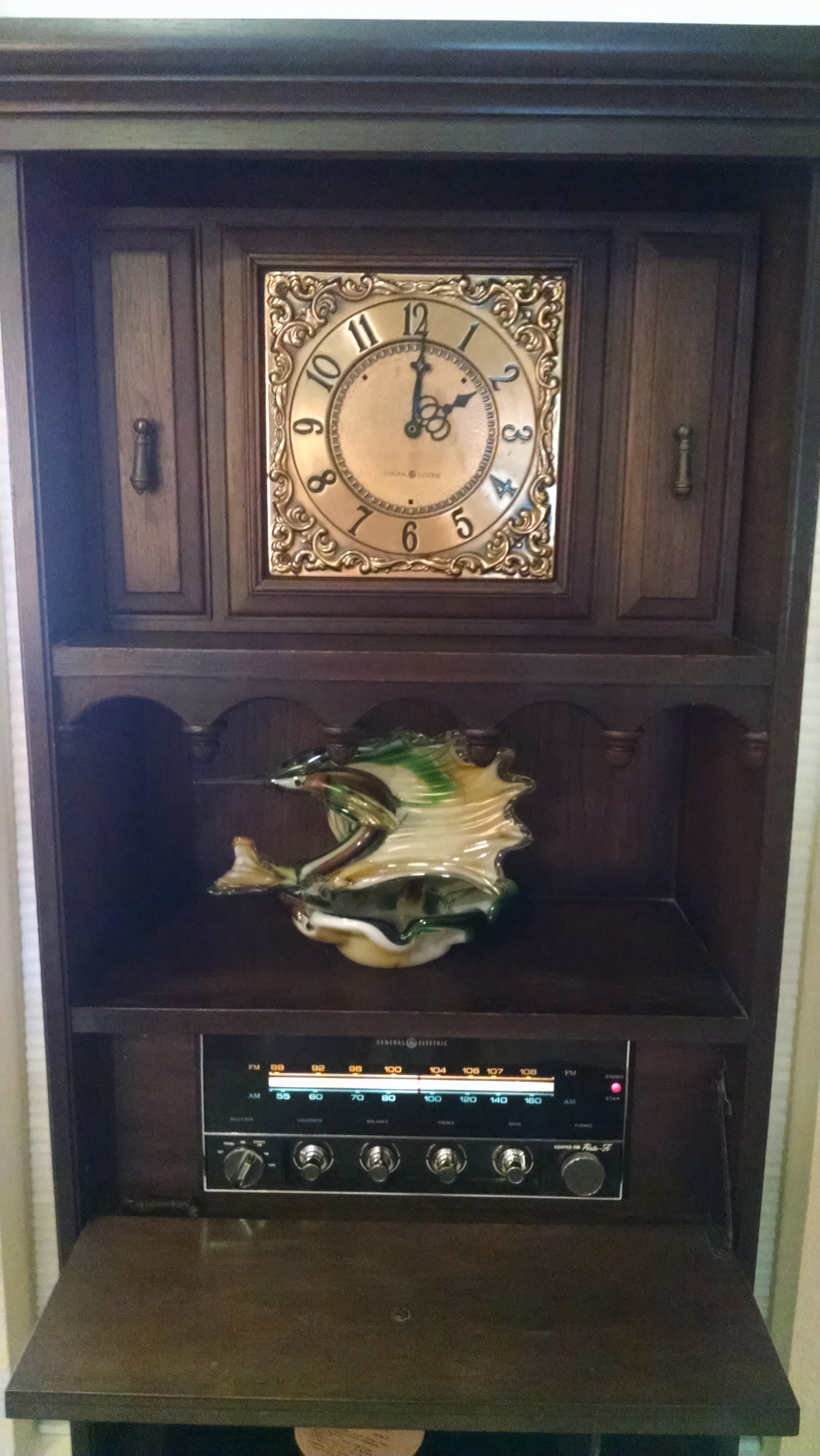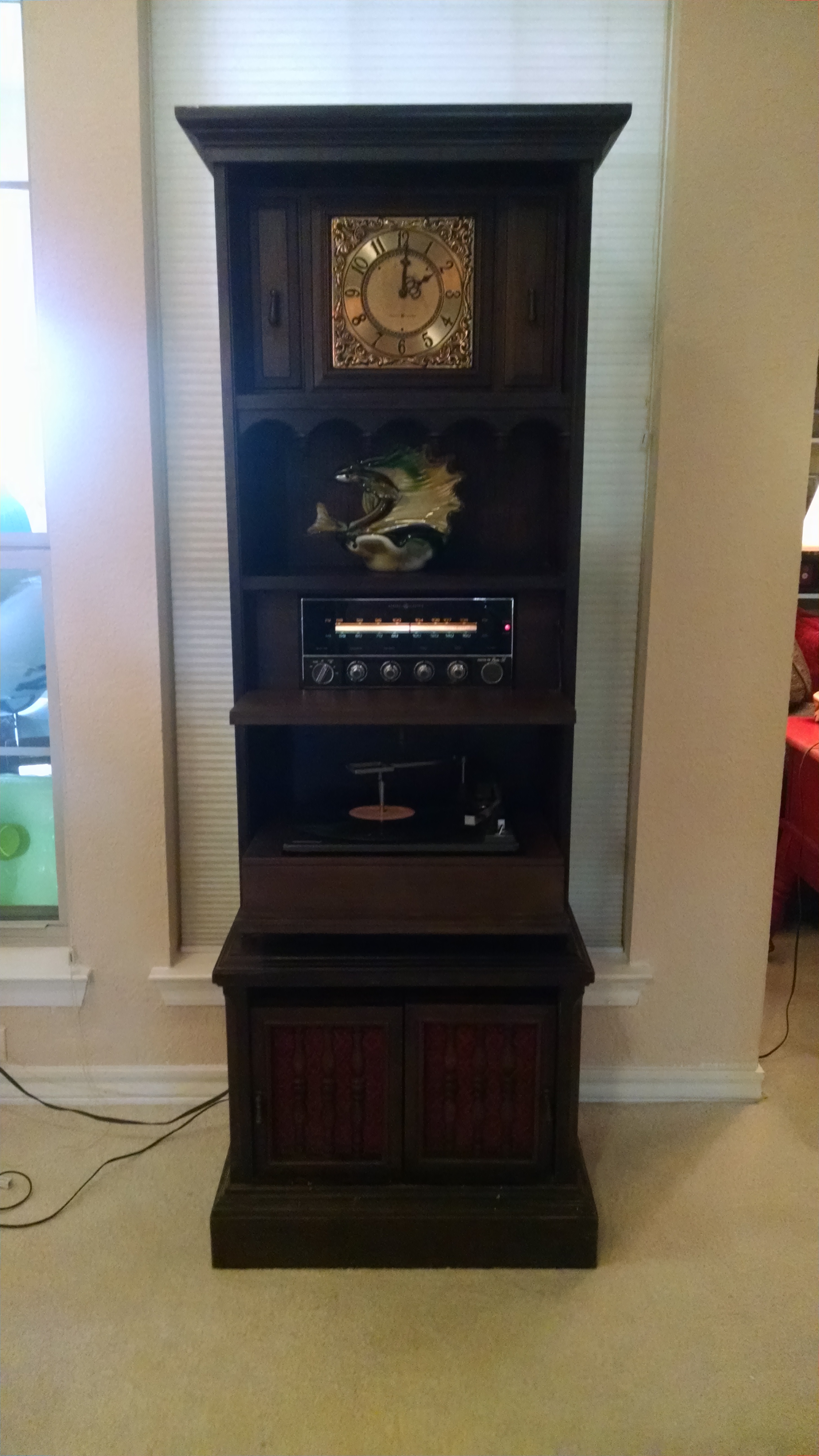 This is an unusual 1969 (?) General Electric Stereo Console. It is 53" tall and 25" wide. The clock and the speakers come out of the case. The stereo and the turntable fold up into the case, which is made of solid wood. It has brass pull-down handles.