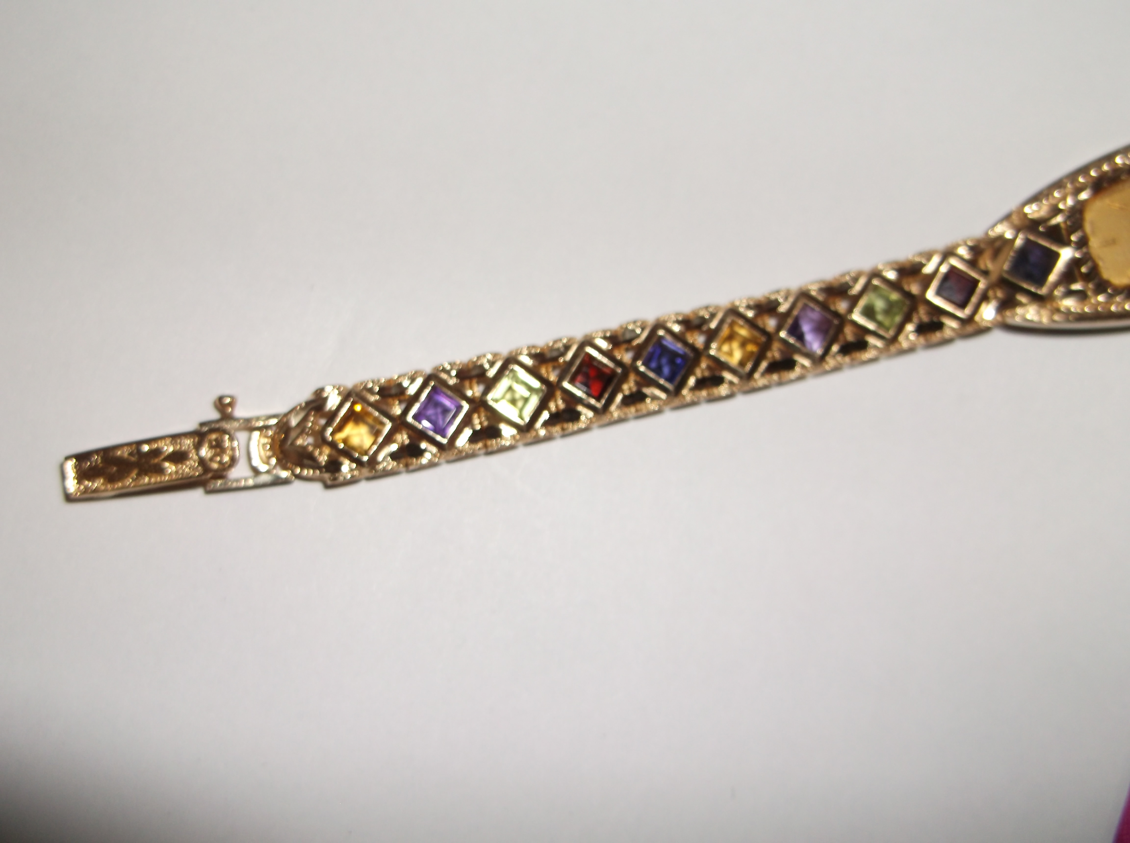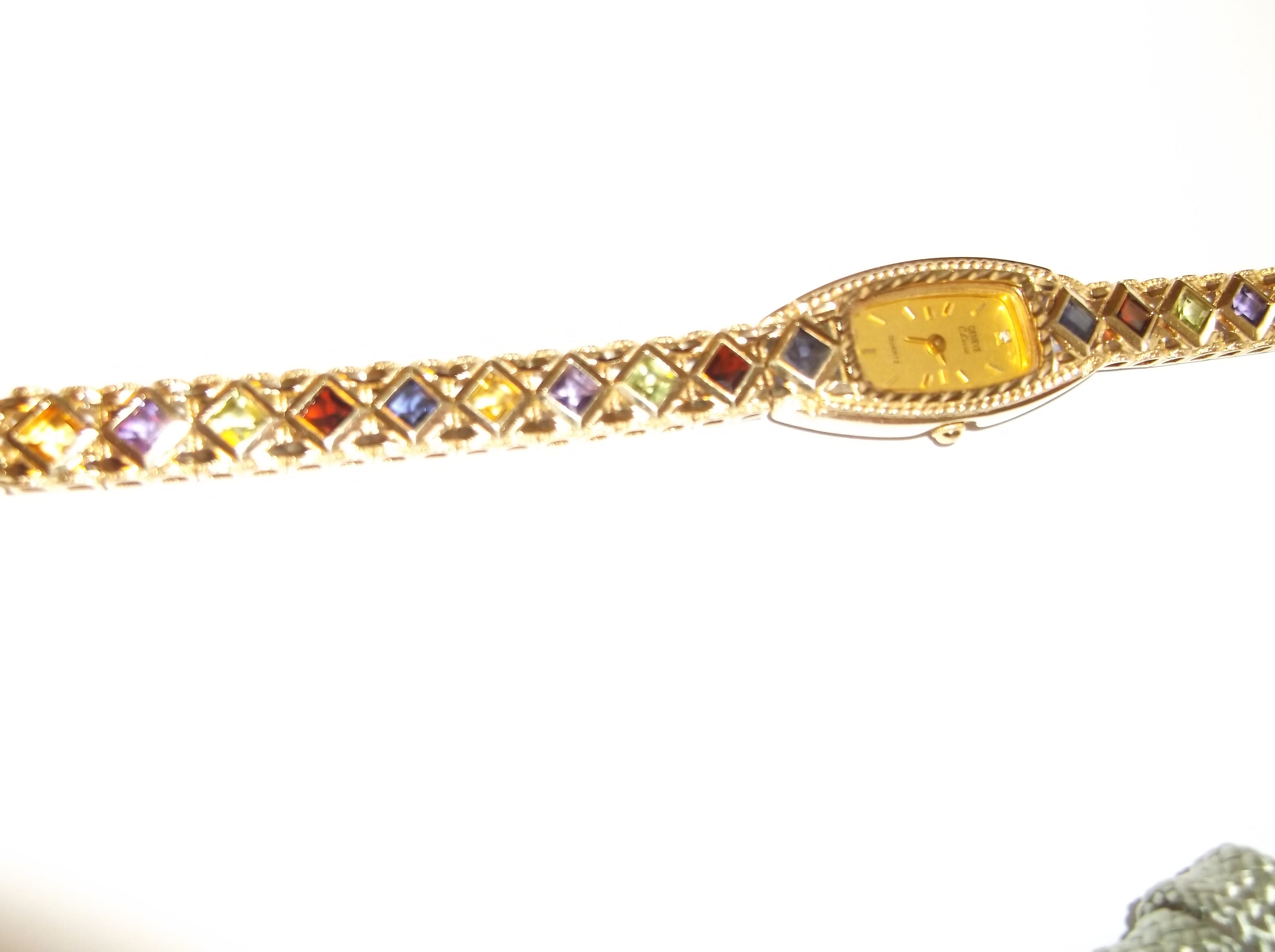 I can't find this watch anywhere. I don't know what all the gemstones are. I know there's amethyst and garnet. Not sure about the blue, green, and yellow. Or todays value, thinking about selling it. It says Japanese movement.