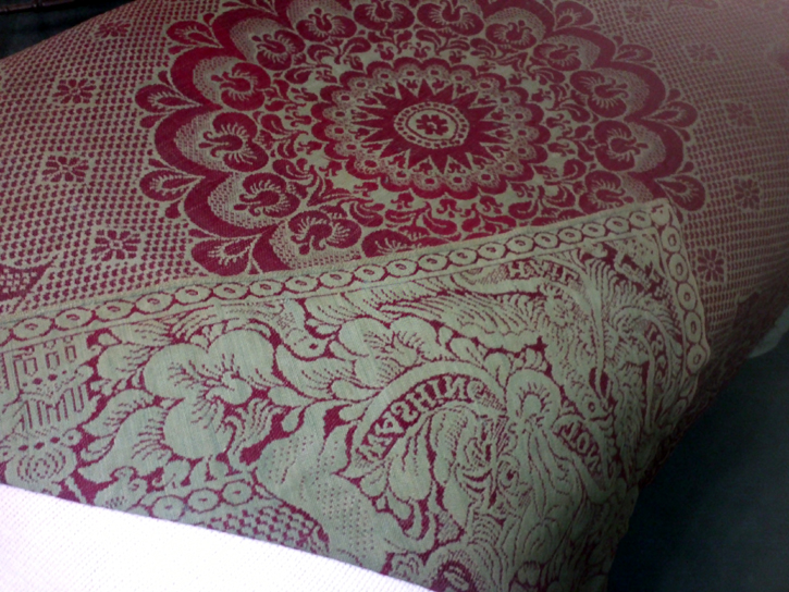 HAND WOVEN TURKEY RED AND TAN COVERLET PURCHASED ATTHE HERSHEY ESTATE IN PENNSYLVANIA