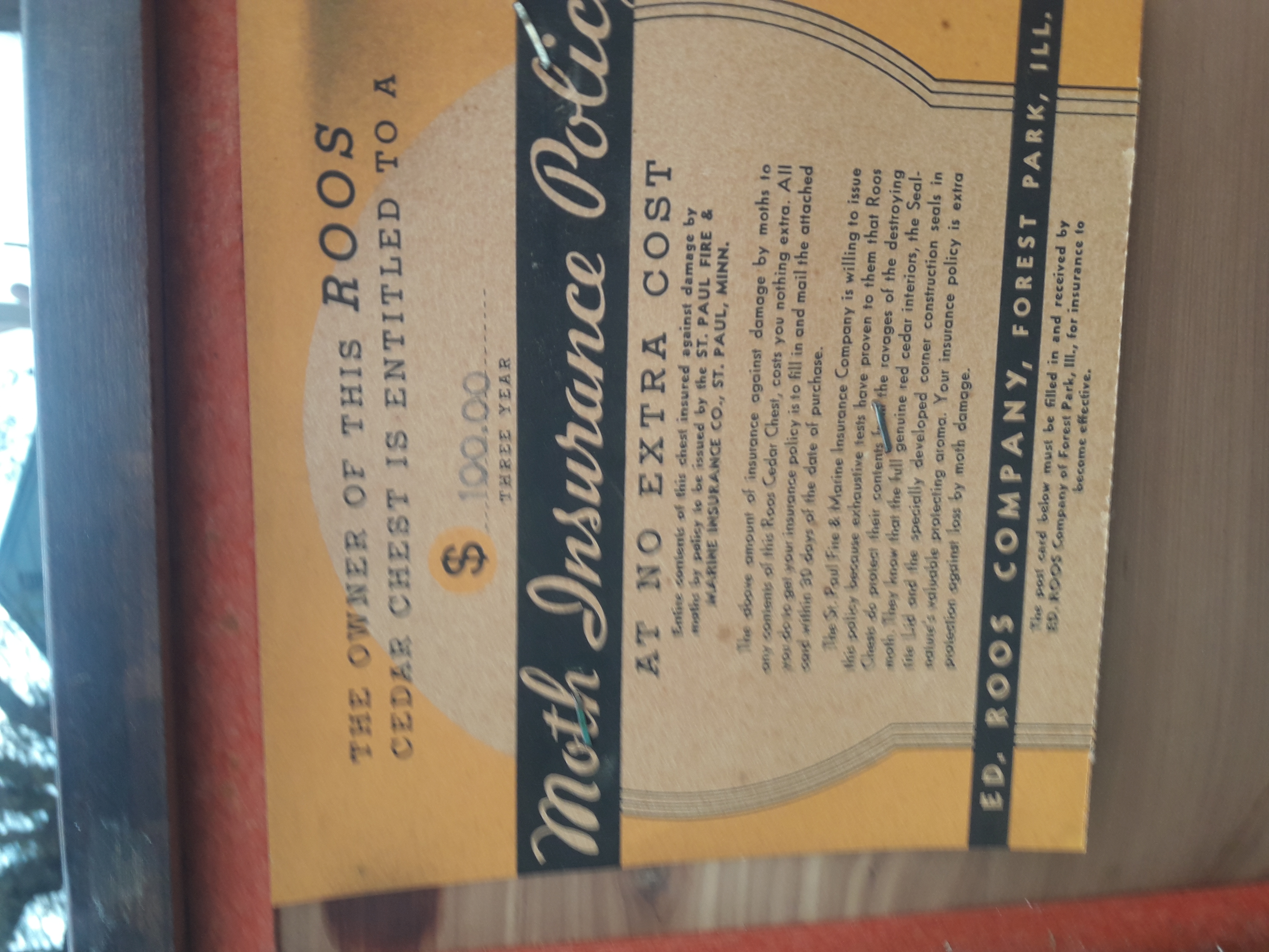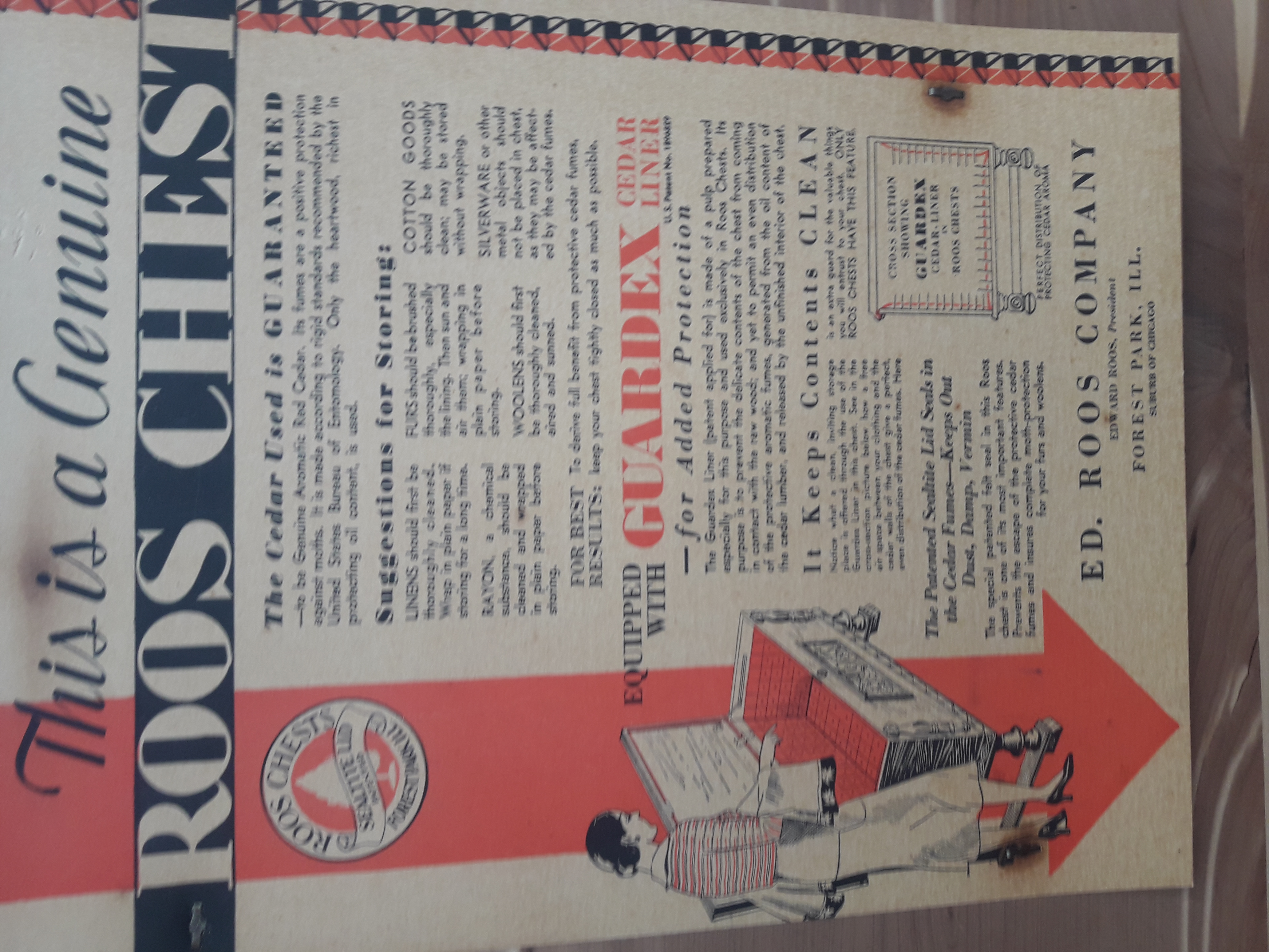 The Roos Cedar Chest factory was established in 1918, in Forest Park, Ill. a suburb of Chicago. By 1928 their brick building on Harrison Street exceeded 85,000 square feet. It was at one time the largest industrial concern in Forest Park, employing 400 people. Three million feet of cedar a year were used by the roos factory, which which required 1,200 trees per day to be cut. The production of Roos Chest were second only to the Lane company, which is also best known for its cedar chests. The Roos company ceased production in 1951. Cedar Chest like this were mass produced items, none of them are considered rare or particularly valuable in the current market. At auction comparable examples to this one often sell at auction for less than $150.00.