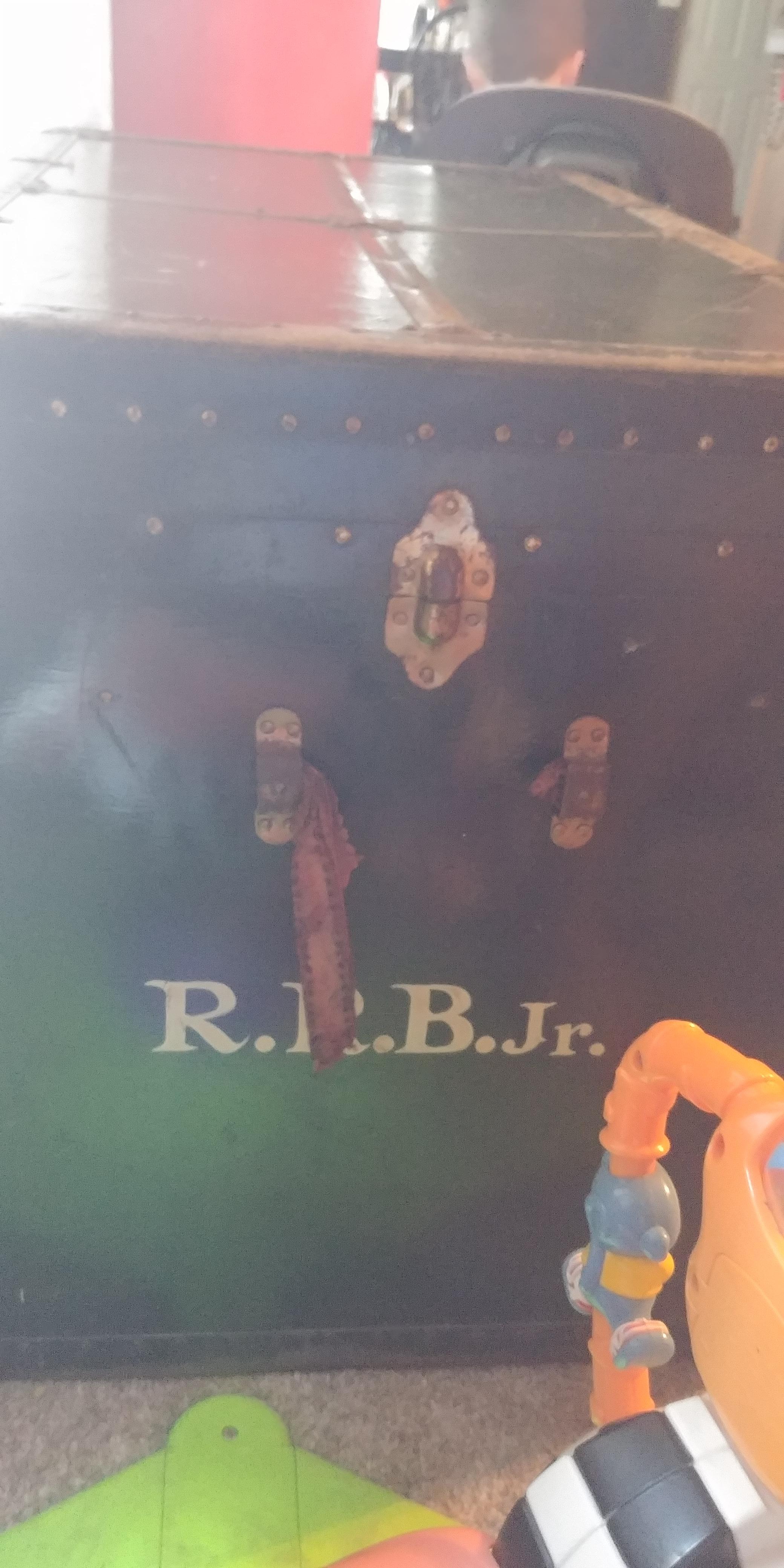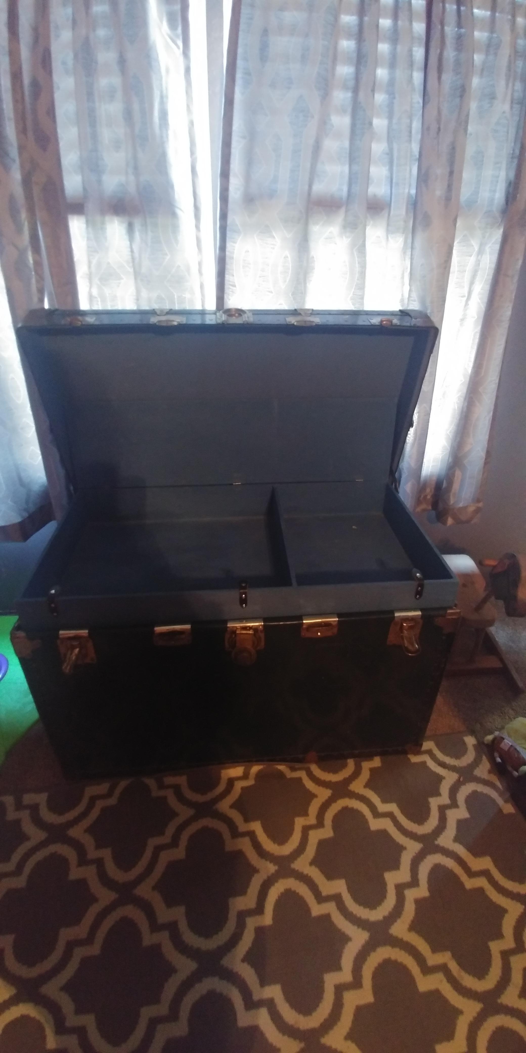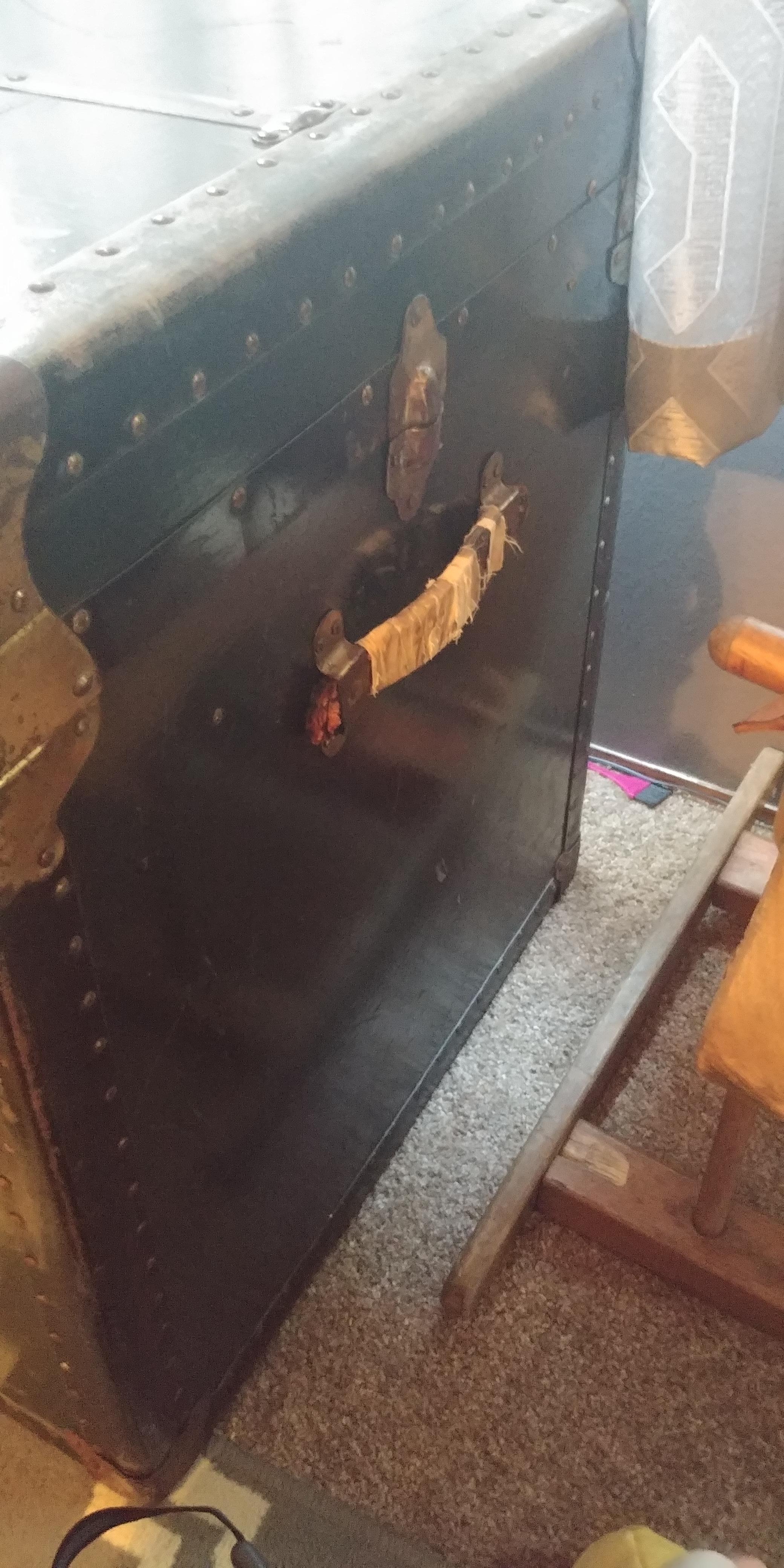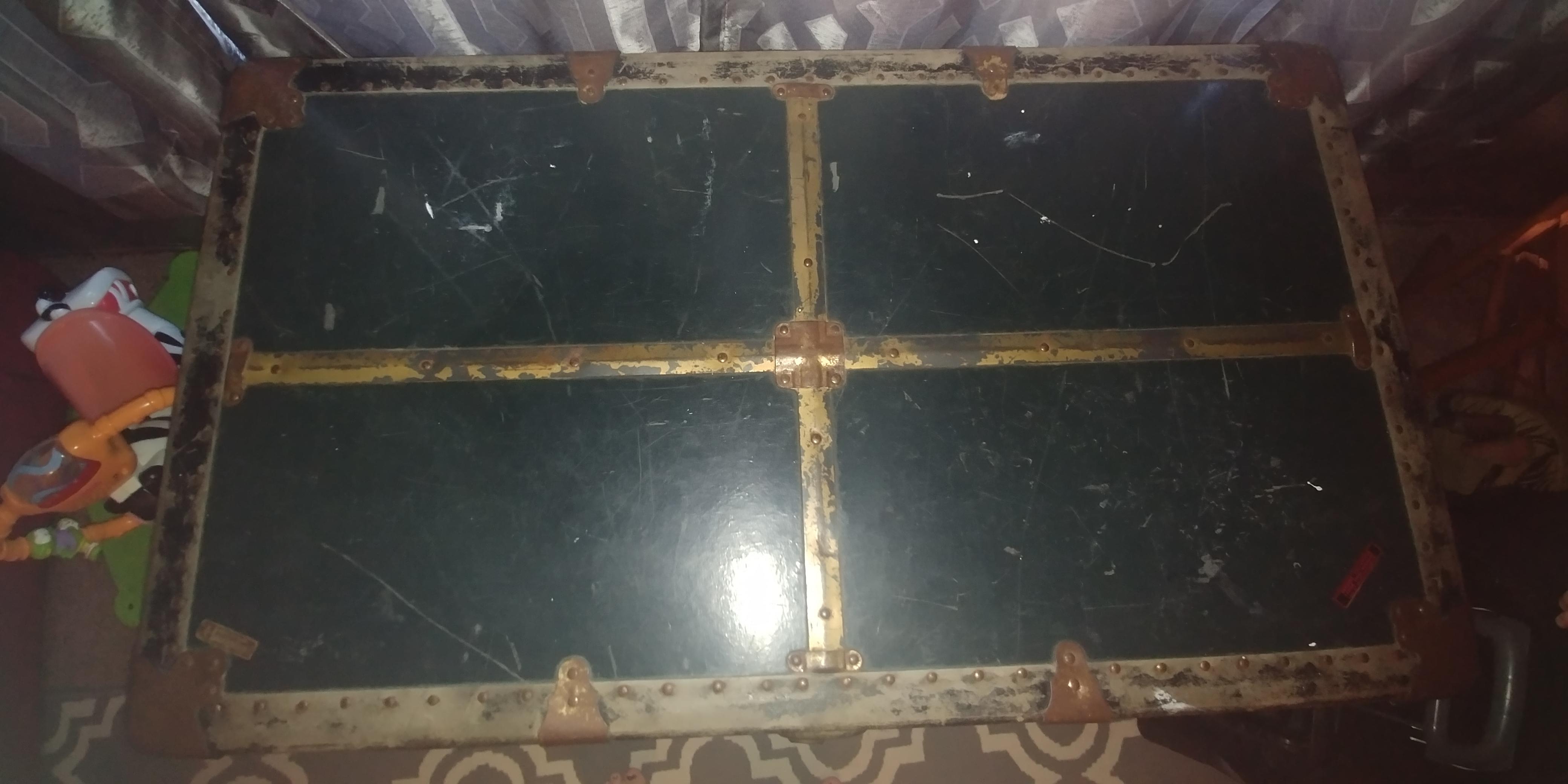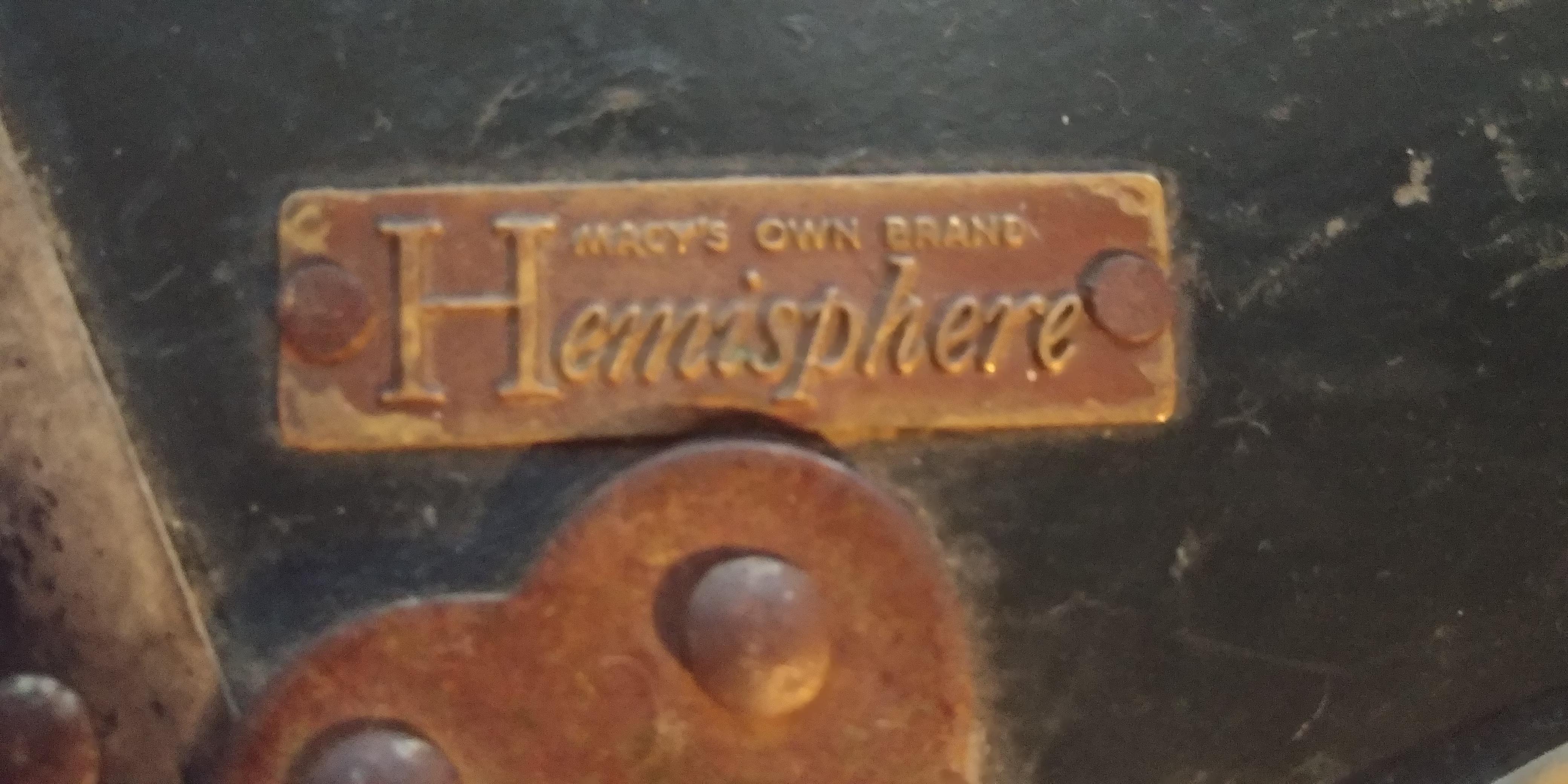 In the bottom right corner on the top it has a sticker that reads Genuine Vulcanized Trunk Fibre Binding by Taylor Corporation. In the bottom left corner it has something that says Hemisphere a Macy's own brand. It is dark green in color. It is pretty big in size. I'm wondering about what year it is from and of course what it's worth.