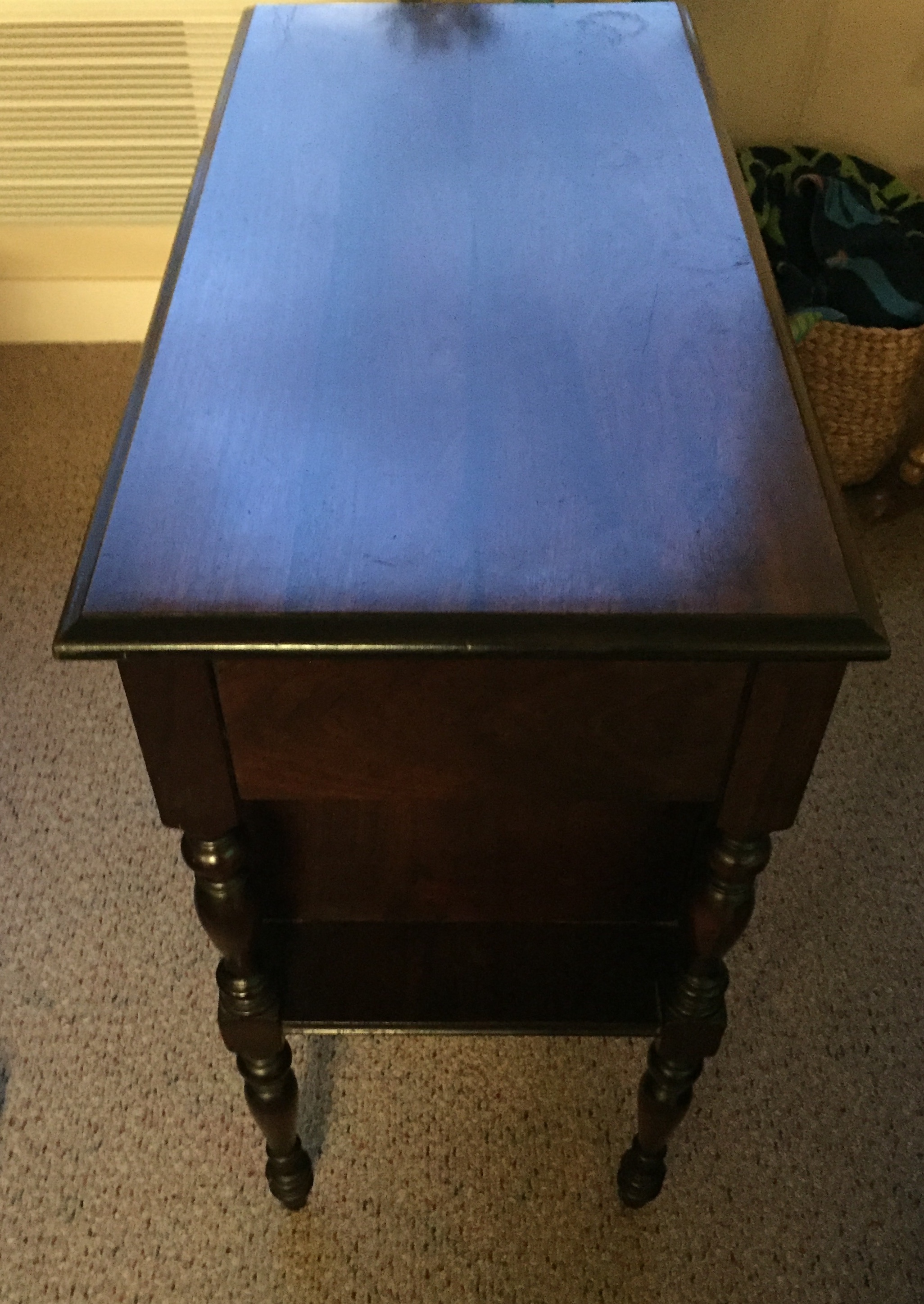 it is solid wood. Paper markers mark (see photo). It measures 32” wide x 16” deep x 30” high.
