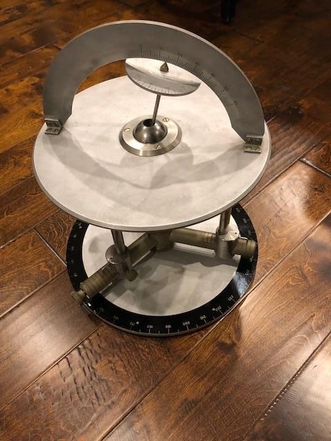 This item was from my grandfather who worked with Exxon/United Geophysical. Its described as a "dip strike resolver". Family lore is that my grandfather had a hand in designing it. Any information would be great. There is also an additional base and wooden box that contains plastic plates with angles etc. printed on them.