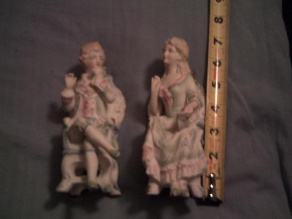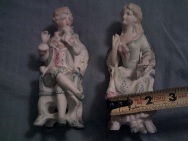 george and martha washington statues sitting in king chairs. they are lightly painted. they are from germany around 1930s to 1950s. they're 6 inches tall and 3 inches wide. pictures available.