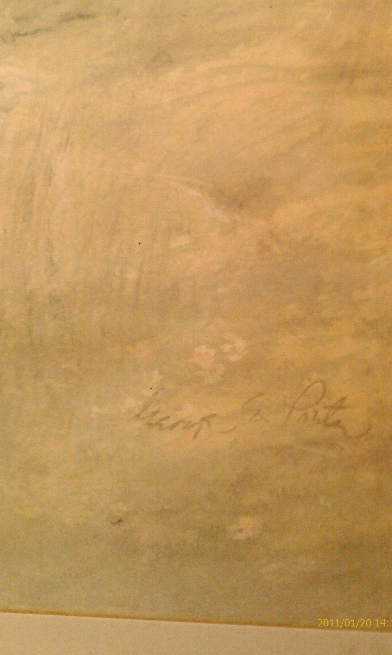 It is a watercolor. Nude in a stream with a small delicate waterfall. In the woods, tall skinny trees. Lots of greens, yellows, and browns and few splashes pink in the tiny patch of flowers in the bottom of painting. Signed George E. Porter. The frame is from Illinois Moulding Company. I have the IBM # for the frame as well.