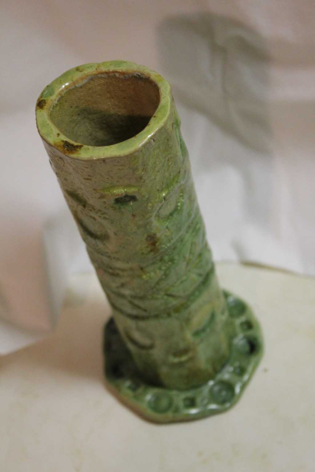 Fern Green Pottery Vase- Very heavy aprox 12 inches high. Appears to be Sculpted by hand.
