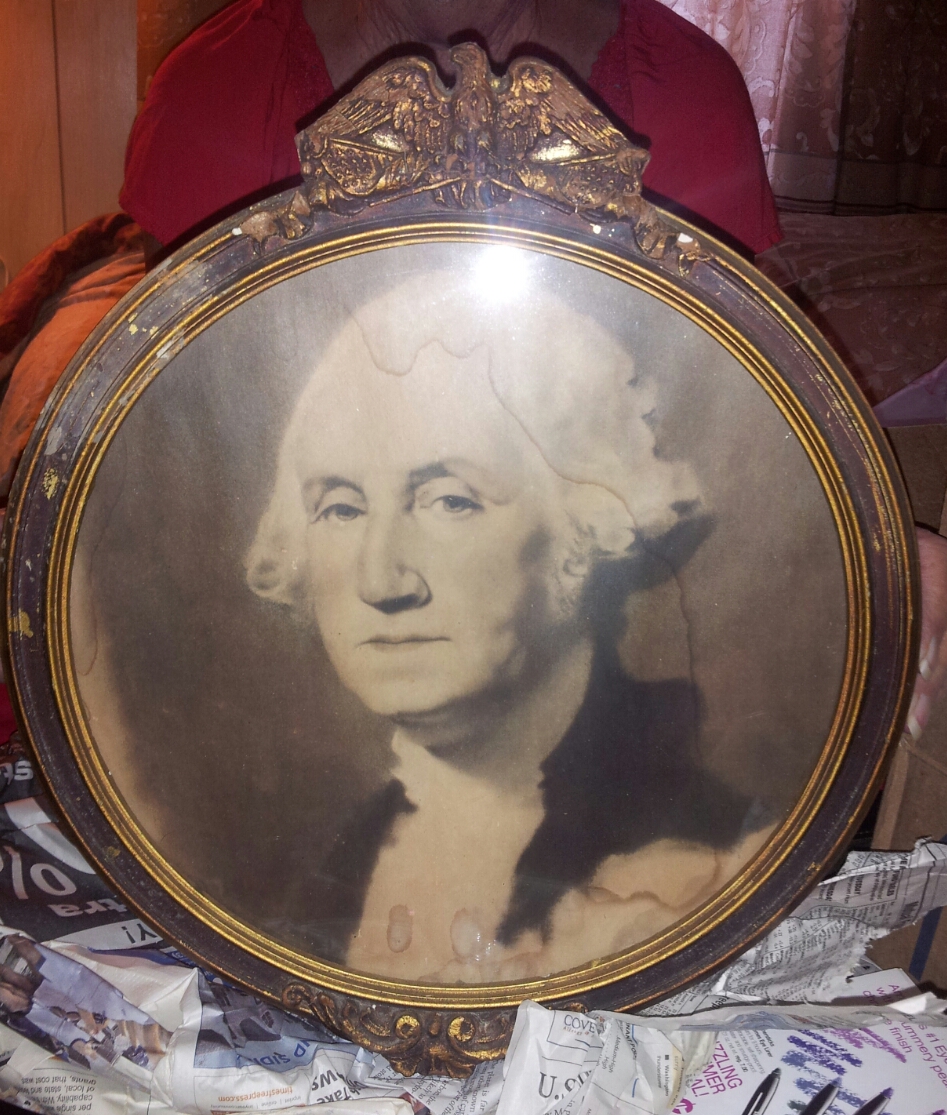 It is a picture of George Washington in a round frame with a bald eagle at the top holding a flag in its claws.