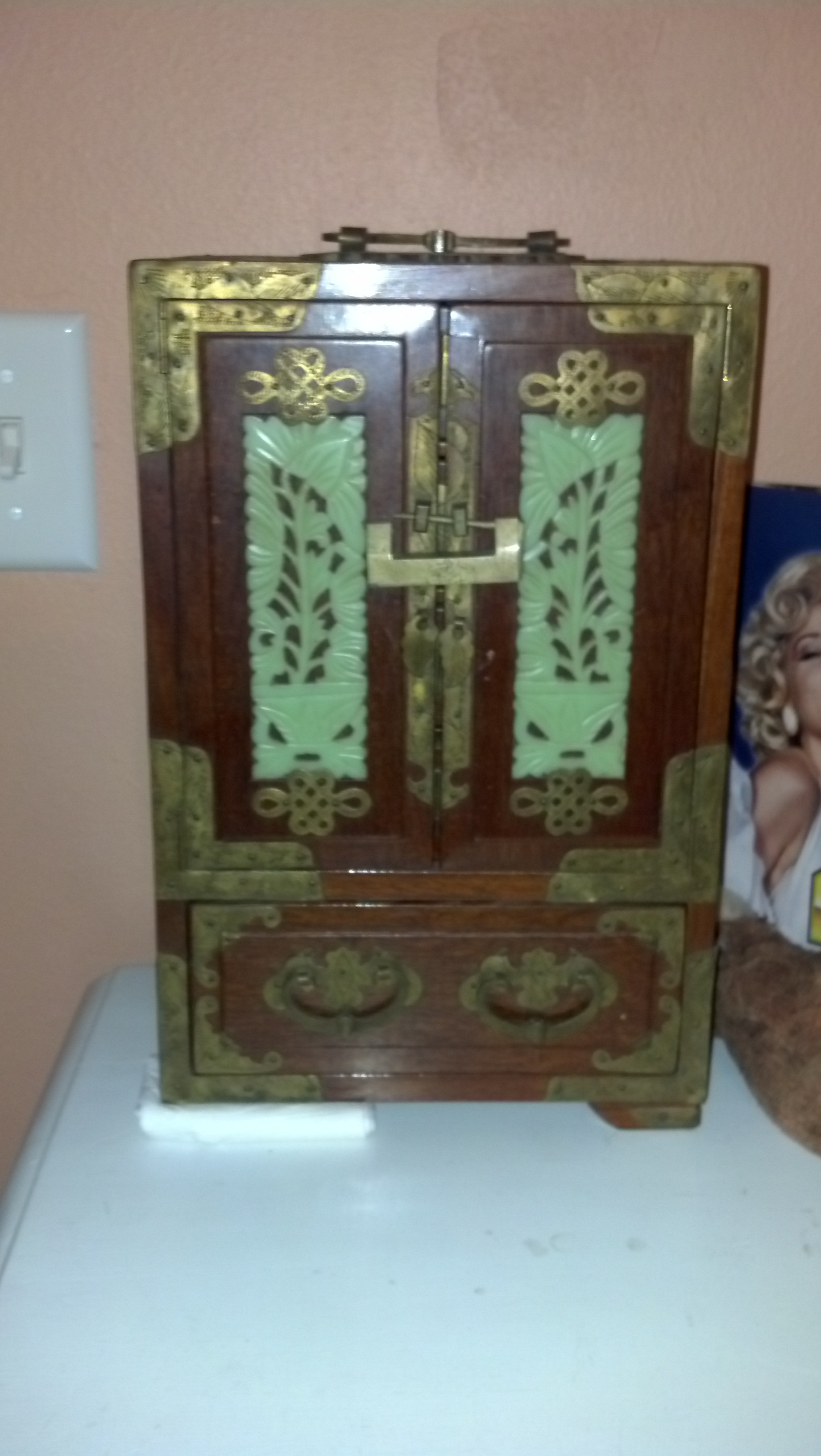 This is a 1 foot tall and 6 in deep. has two doors that open to 4 drawers. has a lock for the outside. the bottom drawer has a removable tray. it is lined with feels like silk has asian artwork on it. looks like jade on the piece. does have the front leg piece missing. on the bottom has a metal plate with George Zee & Co Z-976 made in Hong Kong