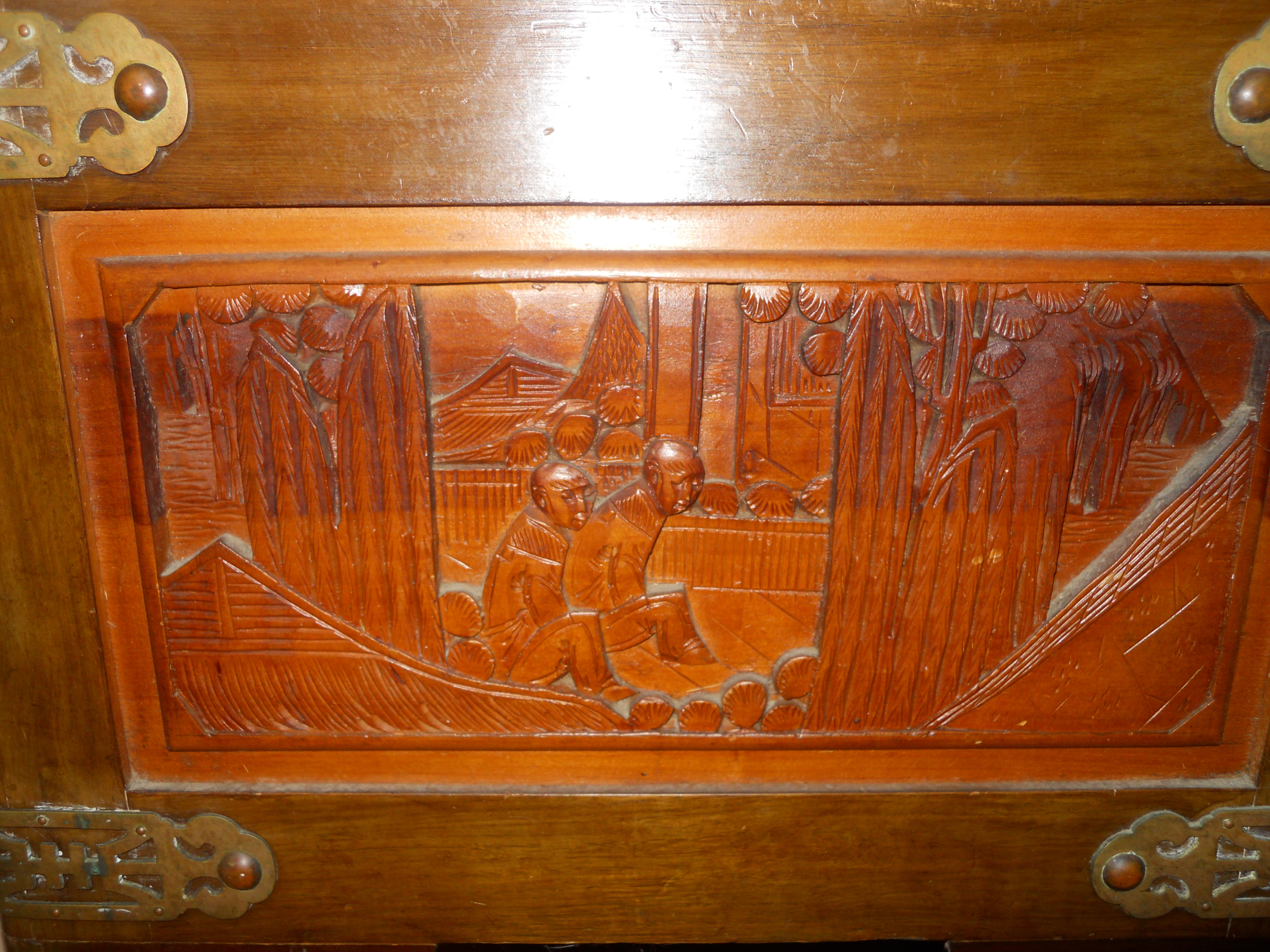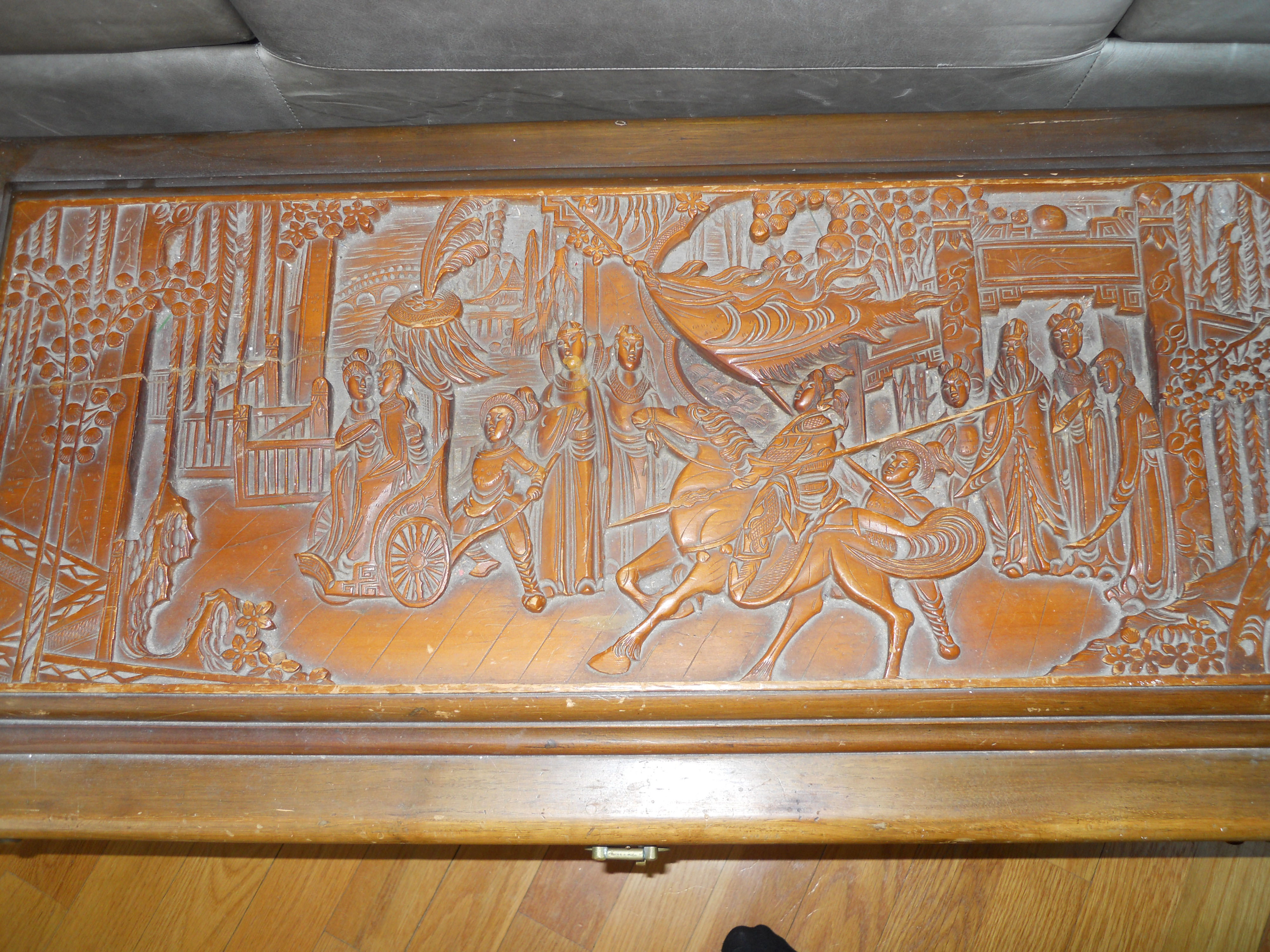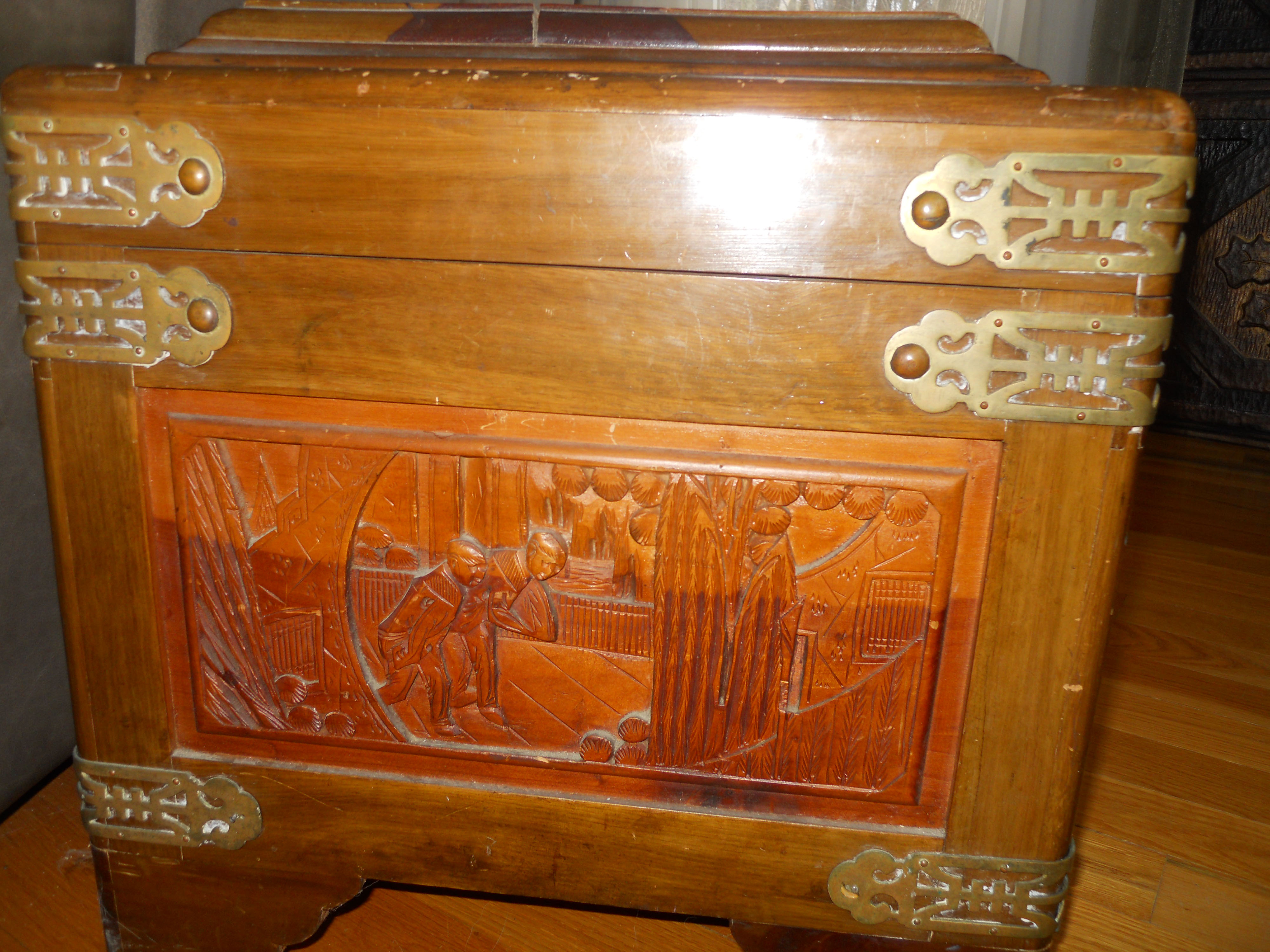 I have a wooden chest with the label George Zee & Co. 142 Nanking Rd. Eastern Shanghai Cable Address "Georgze" Made in China The top of the chest is carved as well as the four sides. The top is carved with Gardens, men pushing people in rickshaws and a man on a horse with a sword dangling by his side. On one end of the chest it looks like people bowing before a shrine. It has original brass hinges and closure. I don't know the wood type as I don't know teak or Camphorwood. Does anyone know the difference? I know the chest was made before or possibly around 1946. I am interested in knowing more about this. I believe I was told as a child that this chest was toe carved but am not sure of the other history. Does anyone know value of this item. Many George Zee items listed have been made in Hong Kong this chest label reads Made in China. It has no serial # listed as it may be possible Mr. Zee made this before moving to Hong Kong and adding serial #'s to his labels. Please respond if you know any info about this item. Thank you so much.