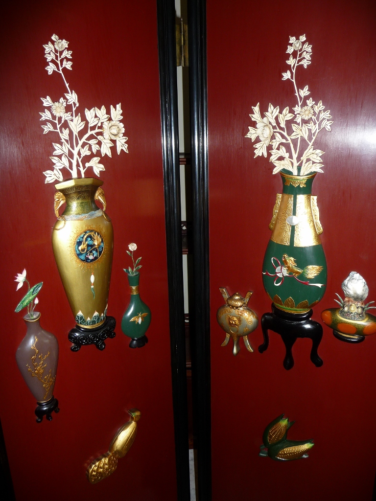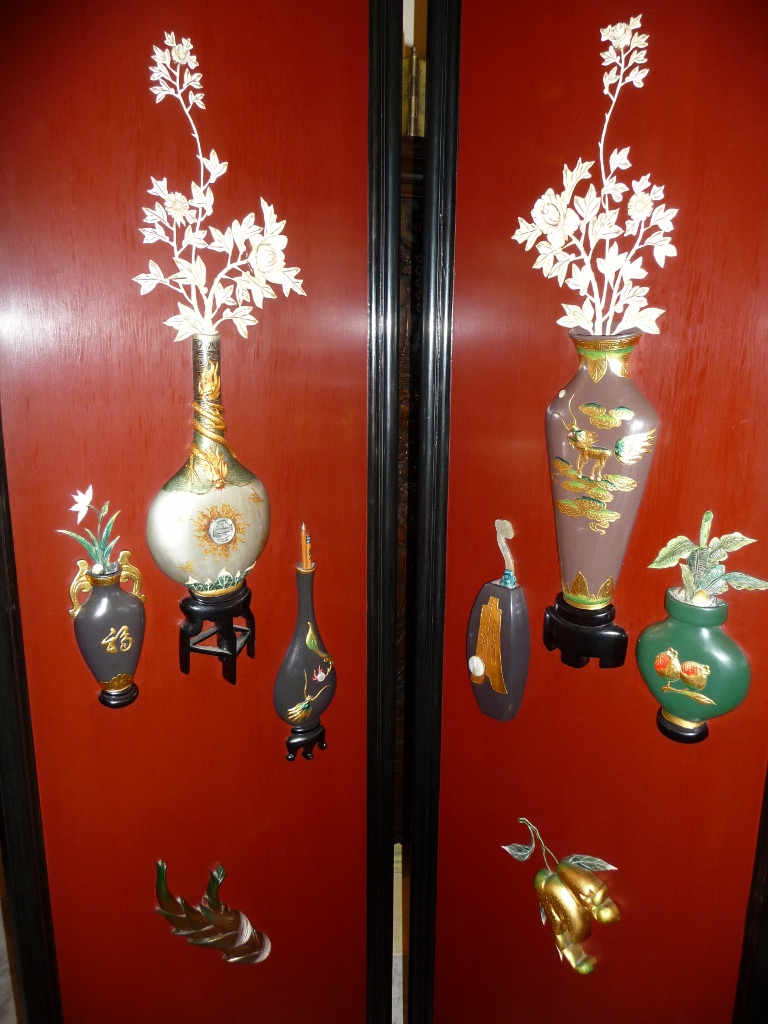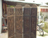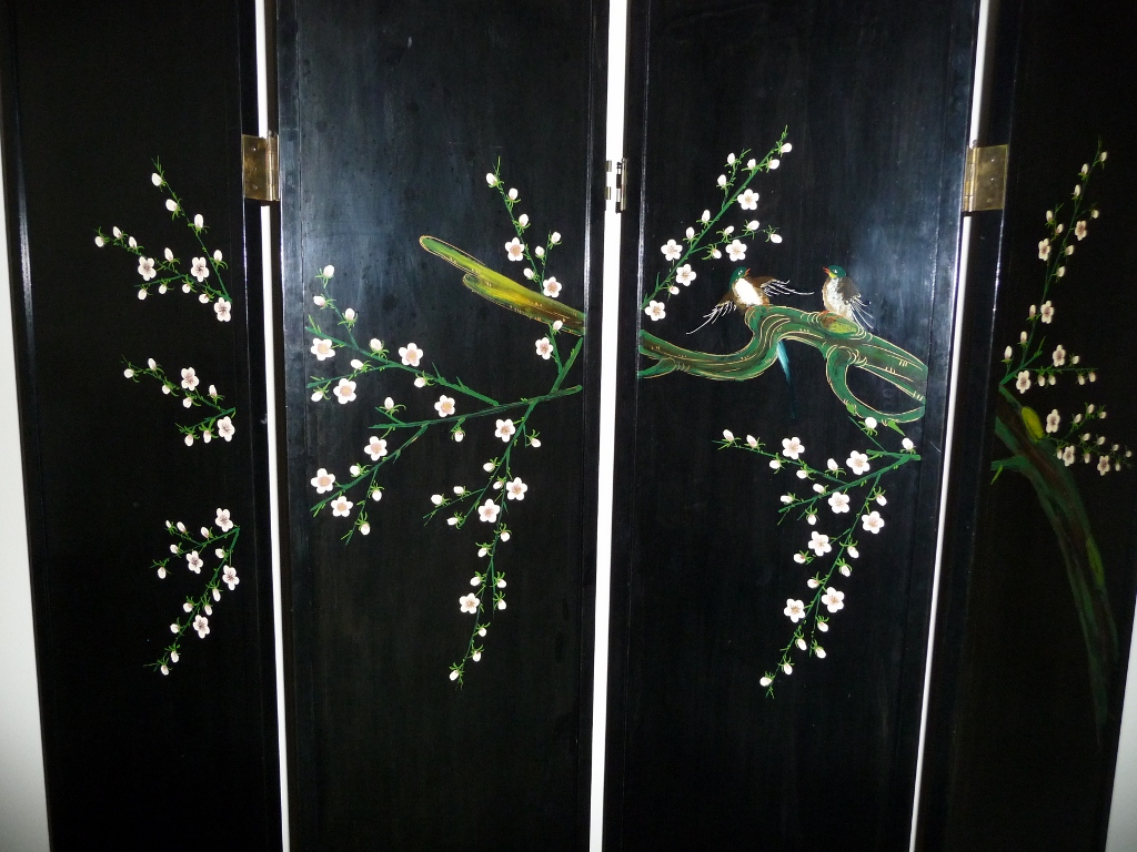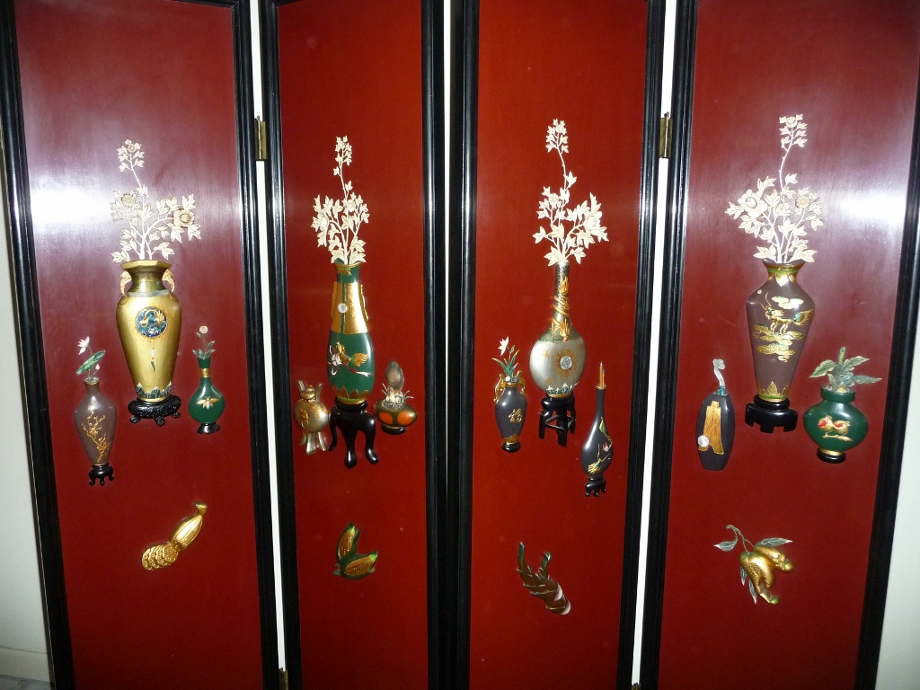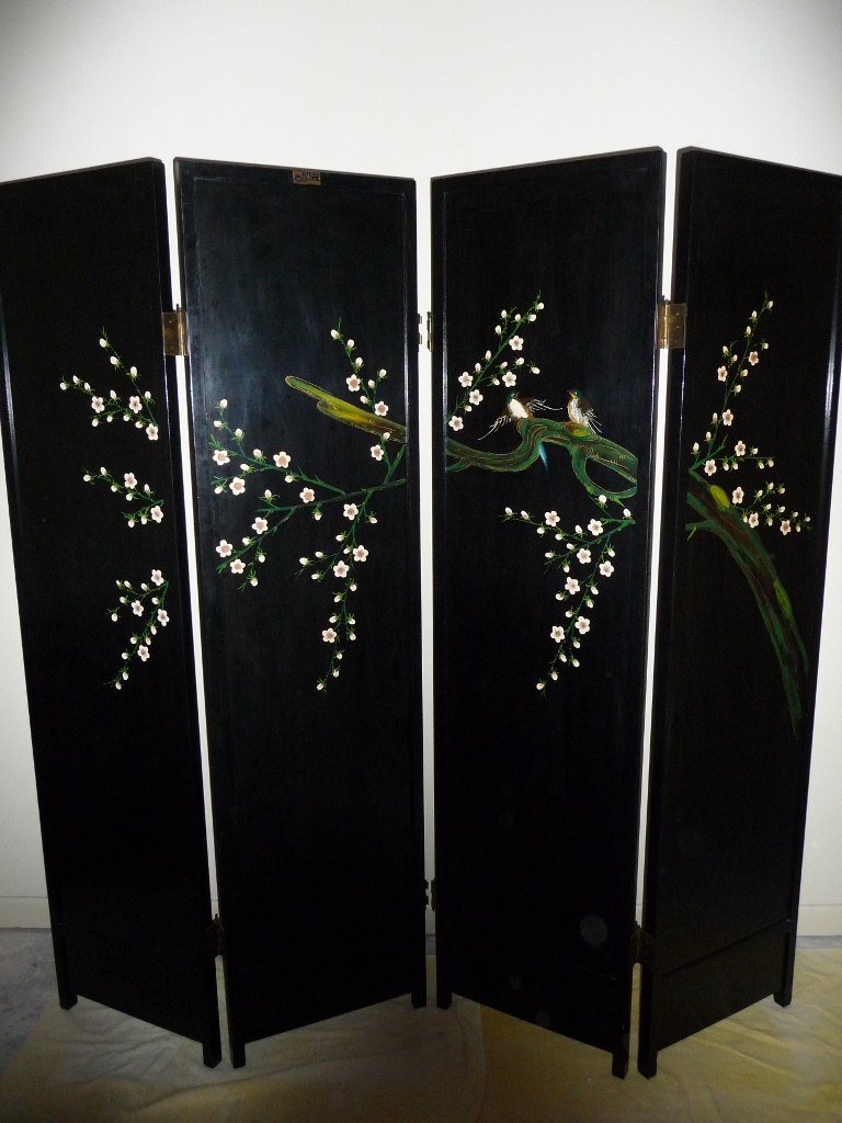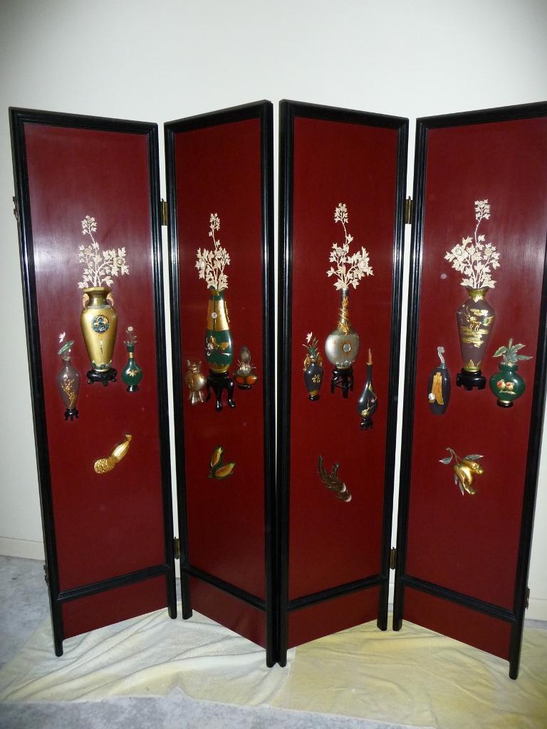This George Zee & Co. oriental wood screen is in excellent condition.  There is an authentication plate on the back with #129302.  The screen is double-sided and has four panels.  One side of the screen is burgundy with black trim and has raised oriental artwork on it.  The other side is black with a painted mural.