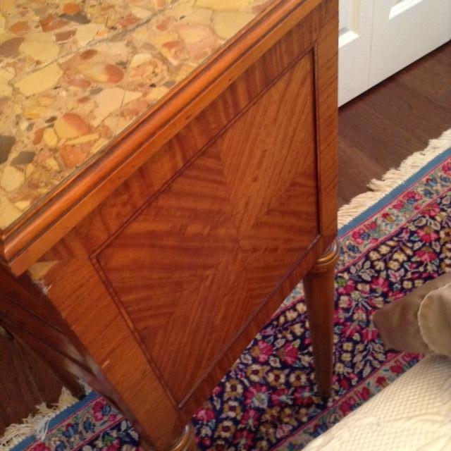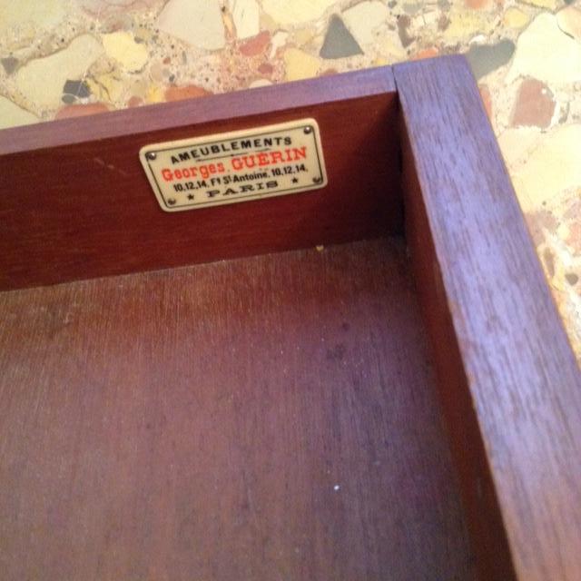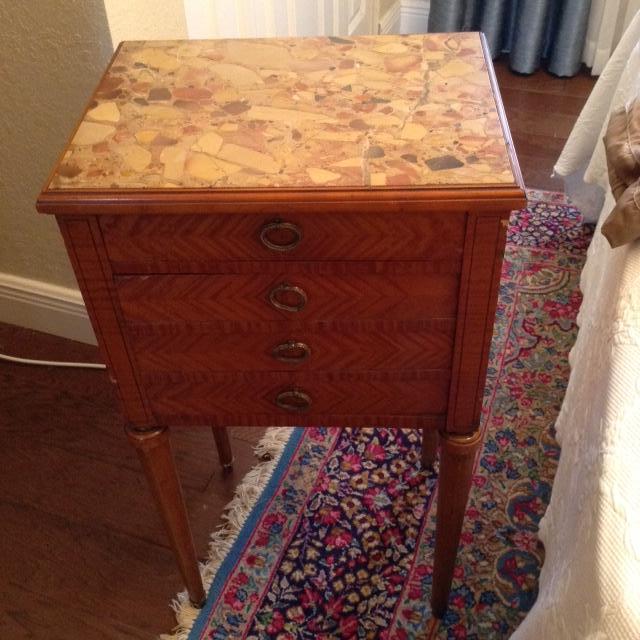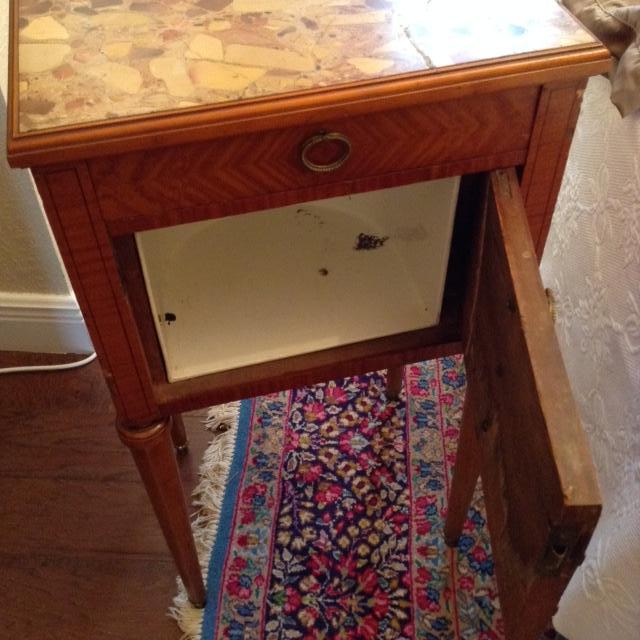 I would like to know the value of my bedside table or perhaps chamber pot or commode made by Georges Guerin Paris, France. The table is pretty heavy due to the stone work on the top and the enameled cast iron that is inside the table where the pee pee pot would have sat. I have researched a lot on the internet about Georges Guerin and everything from furniture to paintings show up but no chamber pots or commodes. The pictures are of the front, inside, side view and back. I don't know if the veneer is called tiger wood ?? I do not have the pot, which is OK, believe me. I will like to sell it so any estimates of value will be greatly appreciated.
