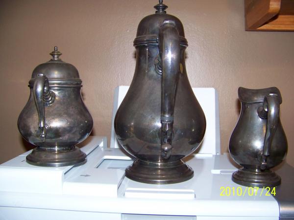 this is a silver teas service, made by georgian castle international silver company. each piece is numbered 1402,1403,0404