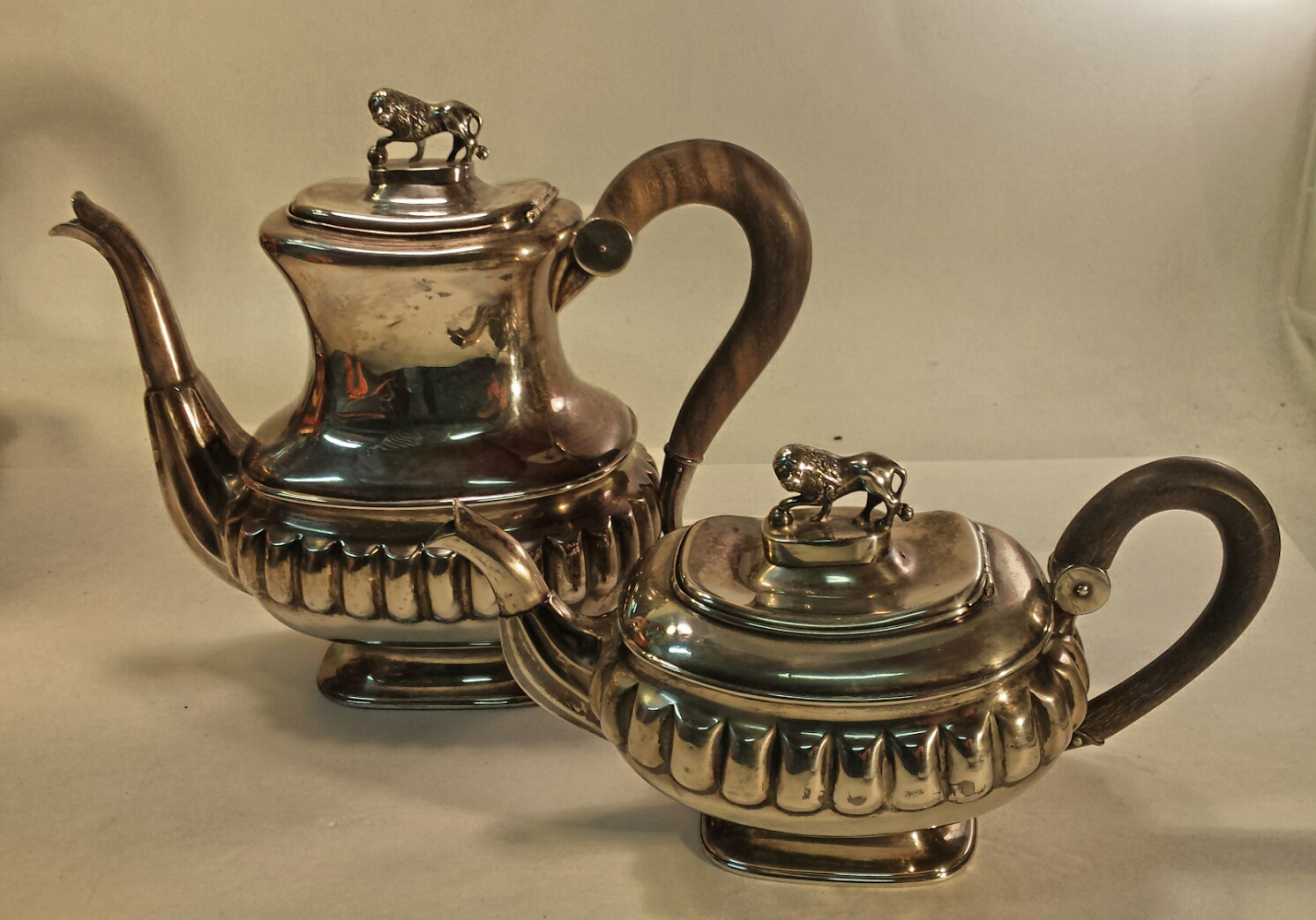 Each piece engraved with family monogram on reverse side. Horn handles. One repair at the side wall at area of fluting.