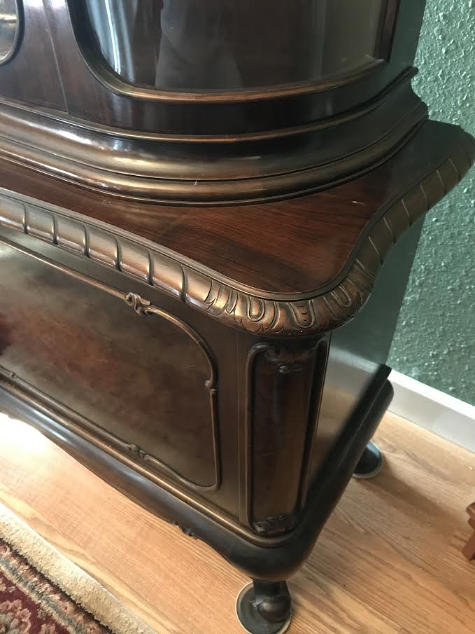 I have from my family estate, 3 pieces of furniture from Germany. I am unable to find any information as to the maker or value of these pieces. This first one I am inquiring about is a Buffet cabinet. I do know these pieces were shipped here from Heidelberg Germany approx. 20 years ago. They belonged to my grandparents in Heidelberg since the late 1940's I am told. All 3 pieces appear to be a set. There is this Buffet, a Sideboard, and a Dining Table with 6 chairs. I remember these pieces when I visited as a child in the 70's and 80's. The only real distinquishing mark I have found is on the back of some drawers in the Sideboard. I am including a picture of that Mark. Also, the pieces have writing on the back of them (some not distinquishable) in an un-stained area.