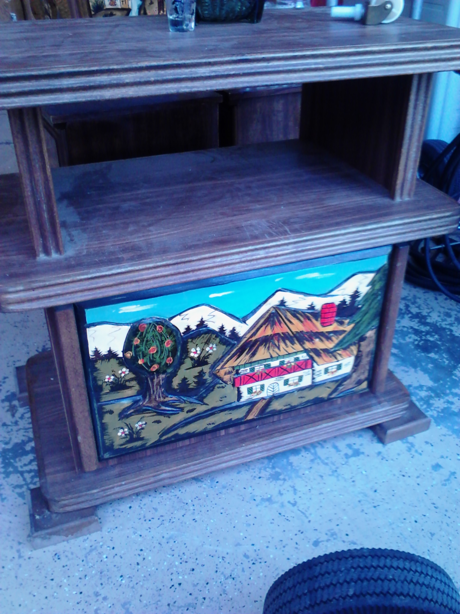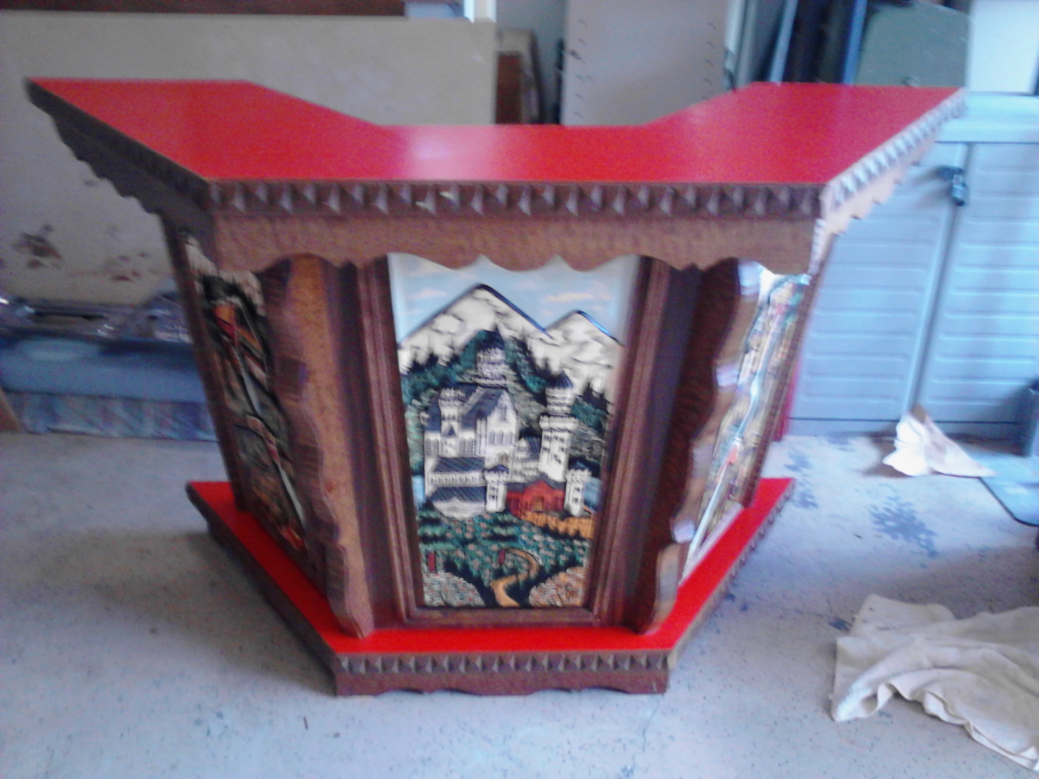 This is actually a pretty Unique piece as I cant find ANYTHING on the net close to this. The hand carved pictures are raised so its like 2D and then its hand painted. It actually would look Great as a Hostess counter for any German Establishment. It also has the small table that goes with it that has the same type carved pic and painted. None of the pictures are the same. All of different views from somewhere in Germany. Still has the German power plug on it to plug in the 6 lights that are on it.