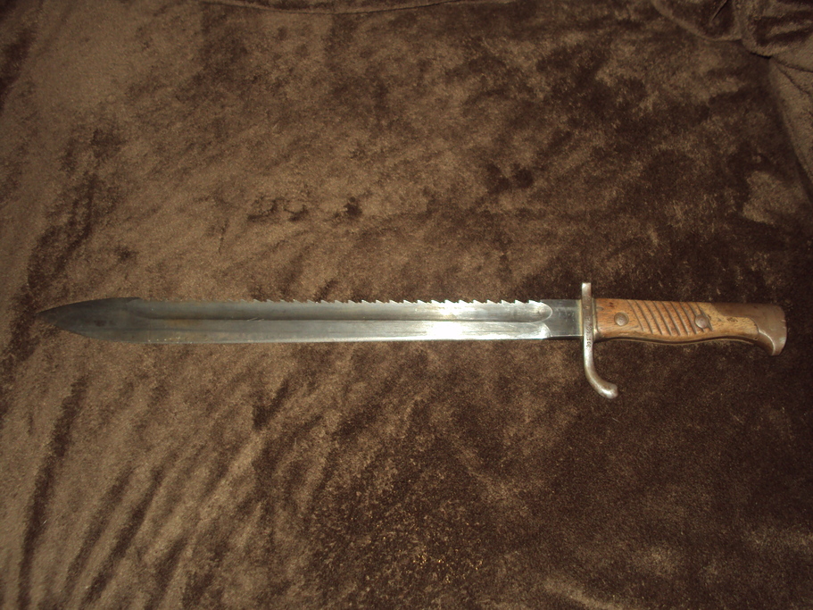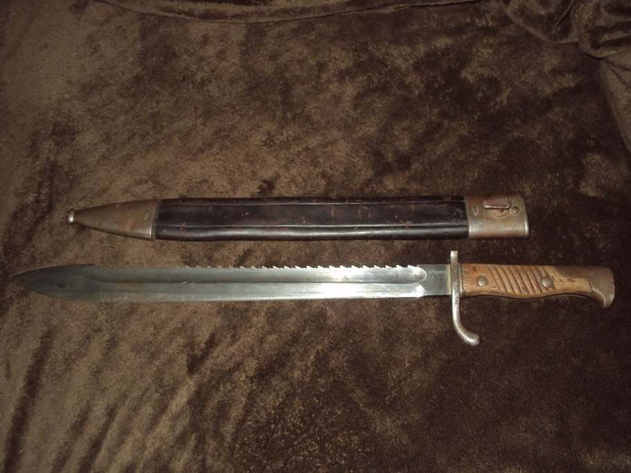an excellent looking bayonet pre wwi made in 1908 all stamps are visible and the blade has slight sharpening, handle is in excellent condition, locking mechanism is fully operational, no loose parts has leather scabbard, which is in decent shape for the age... it was made at the armament depot in erfurt, germany under the ruling of keiser willhelm, sorry if its misspelled thats all i really know about t his bayonet.