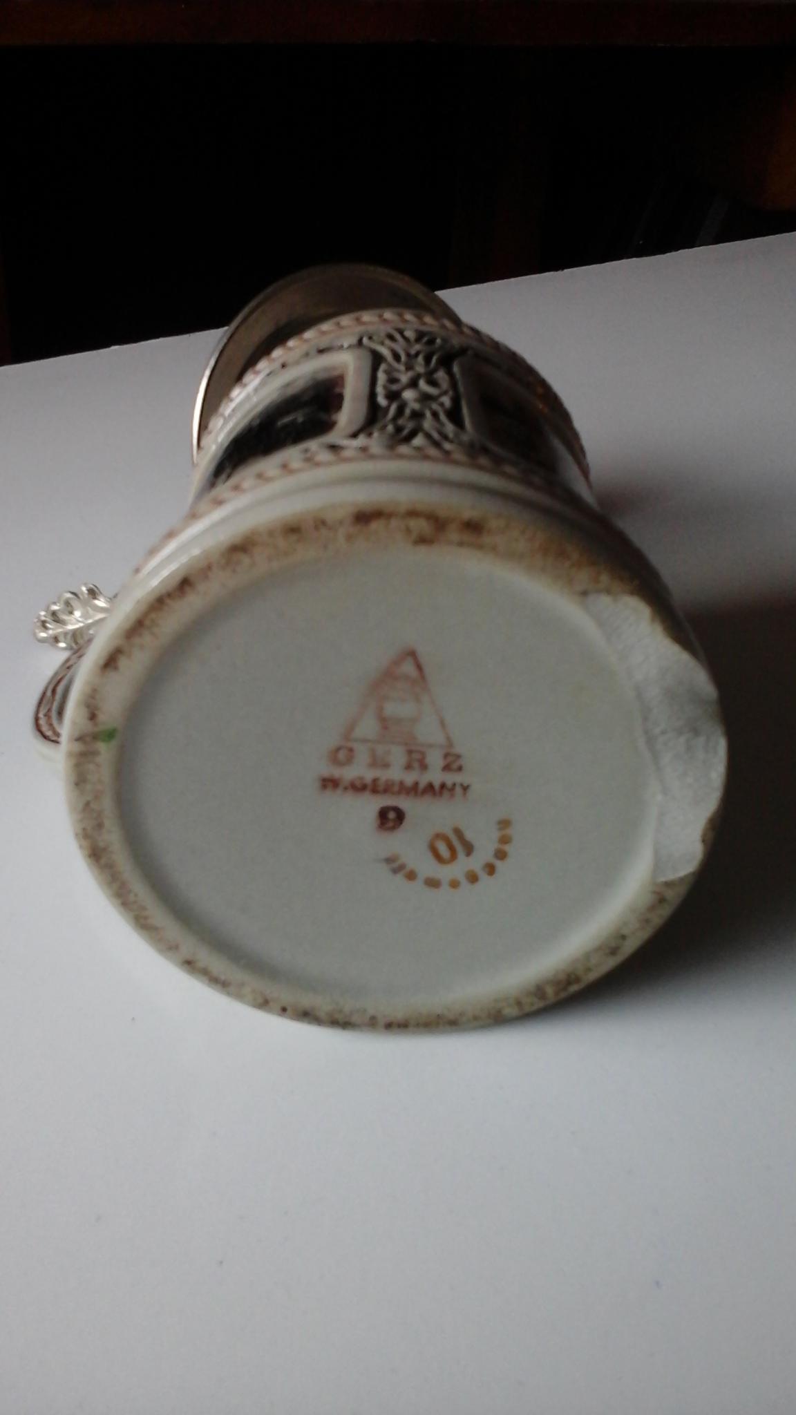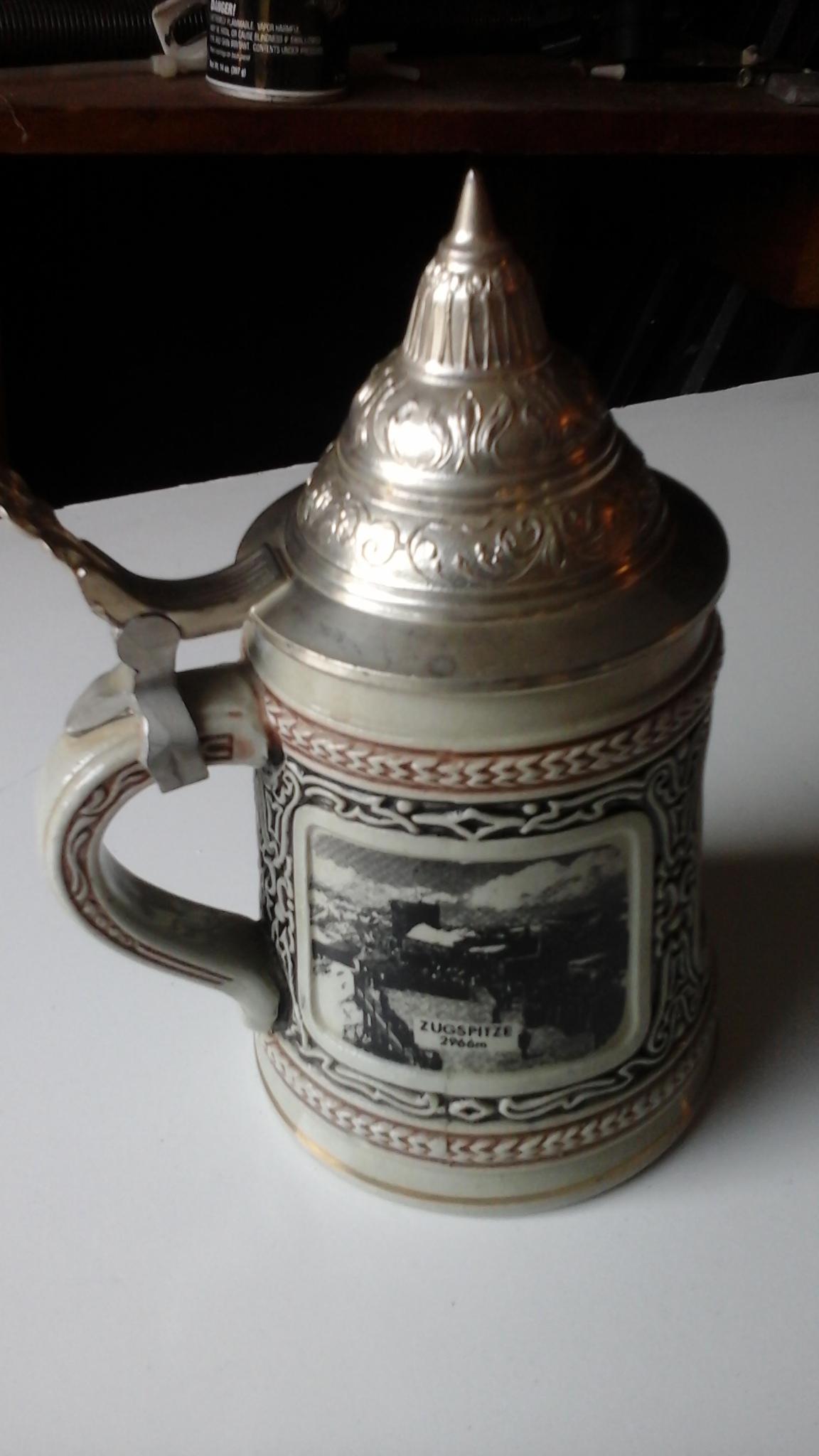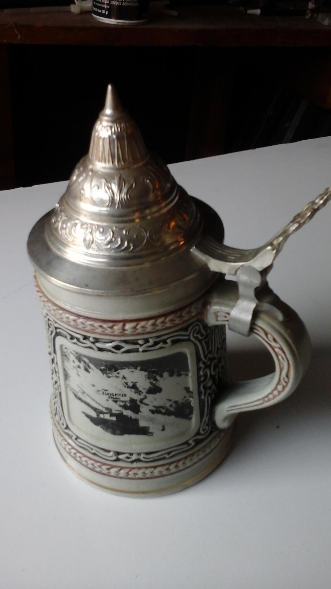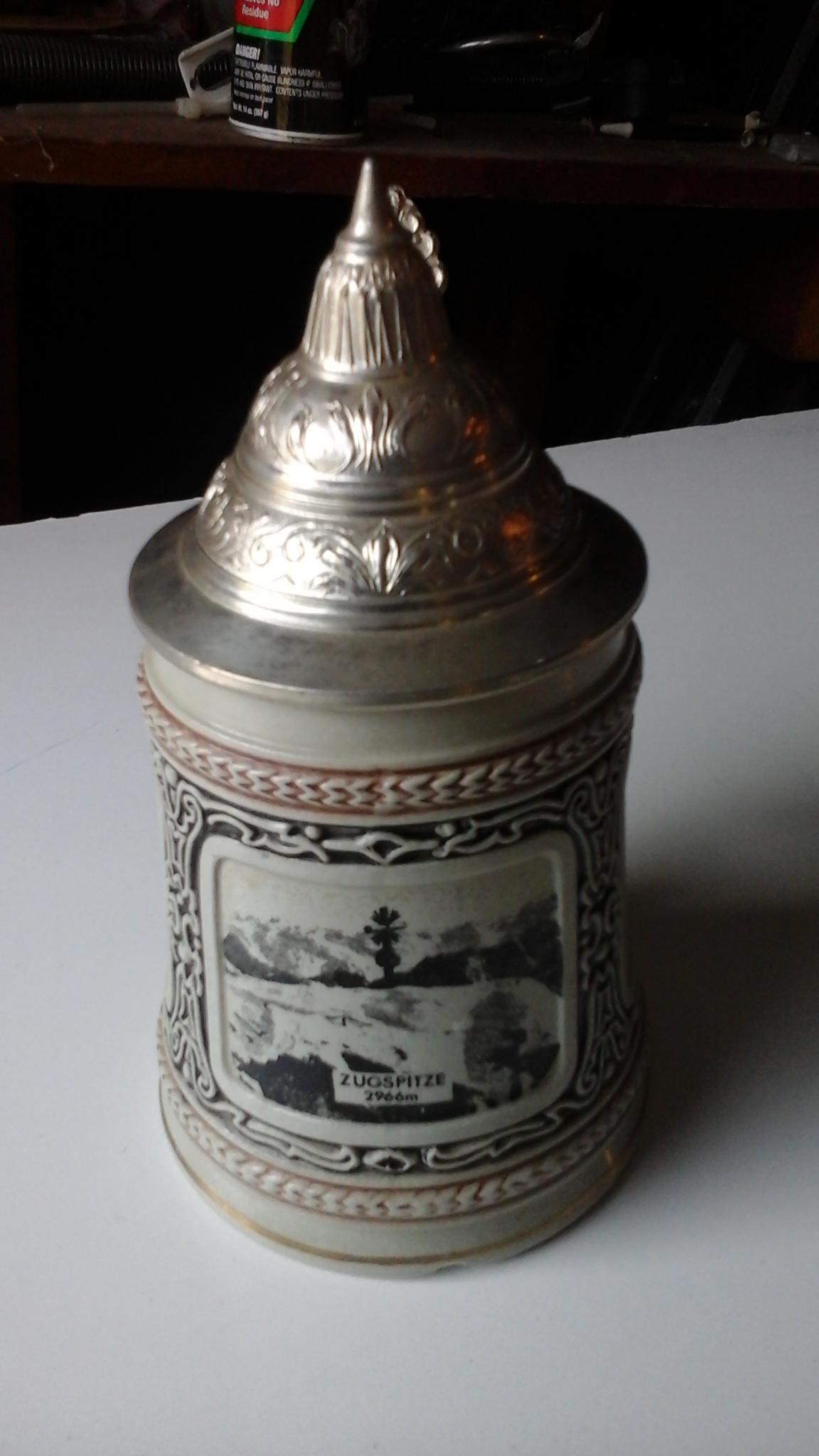 Silver lid beer stein says gerz w.germany on bottom three pictures on stein all have zugspitze 2966m written on all three