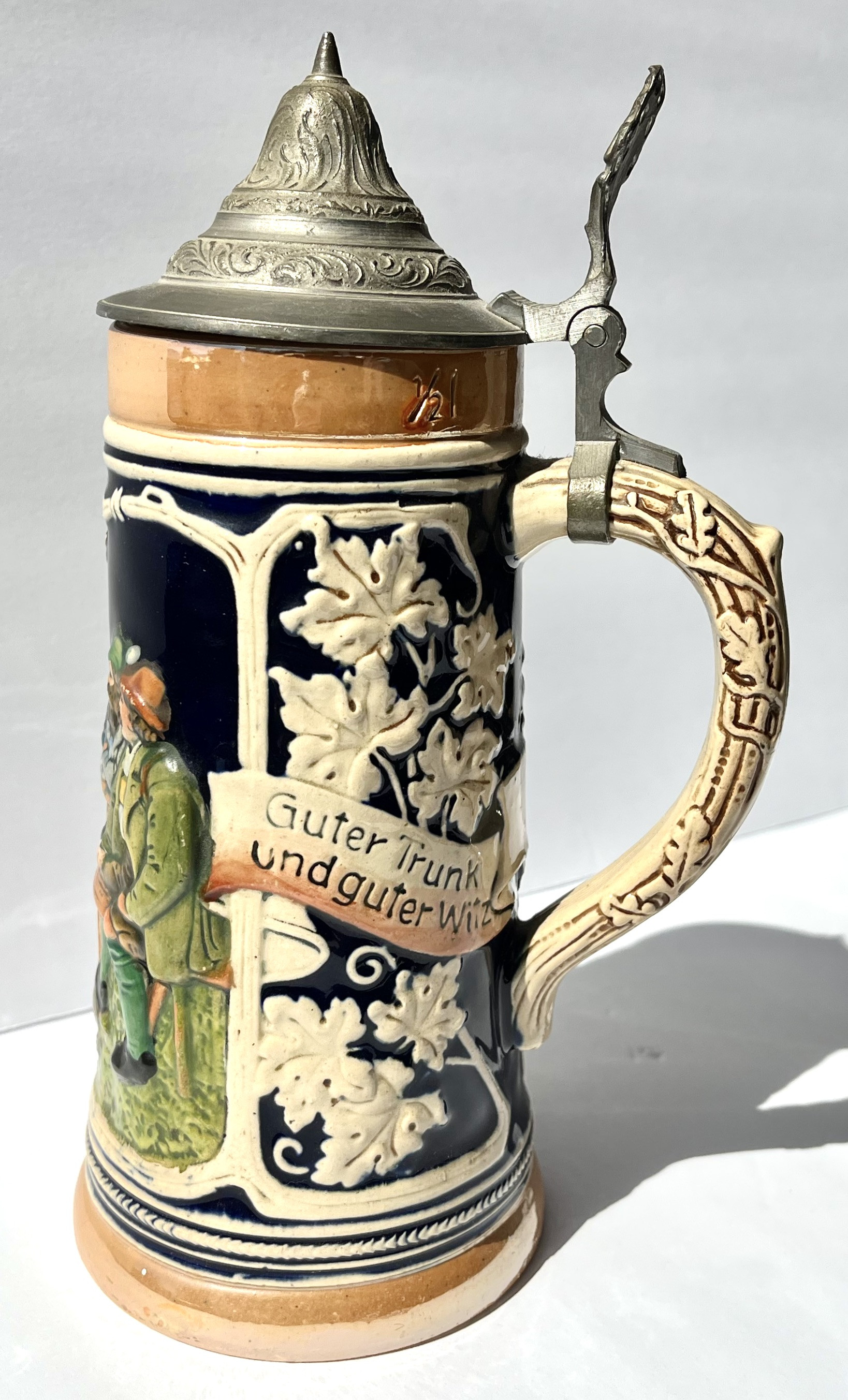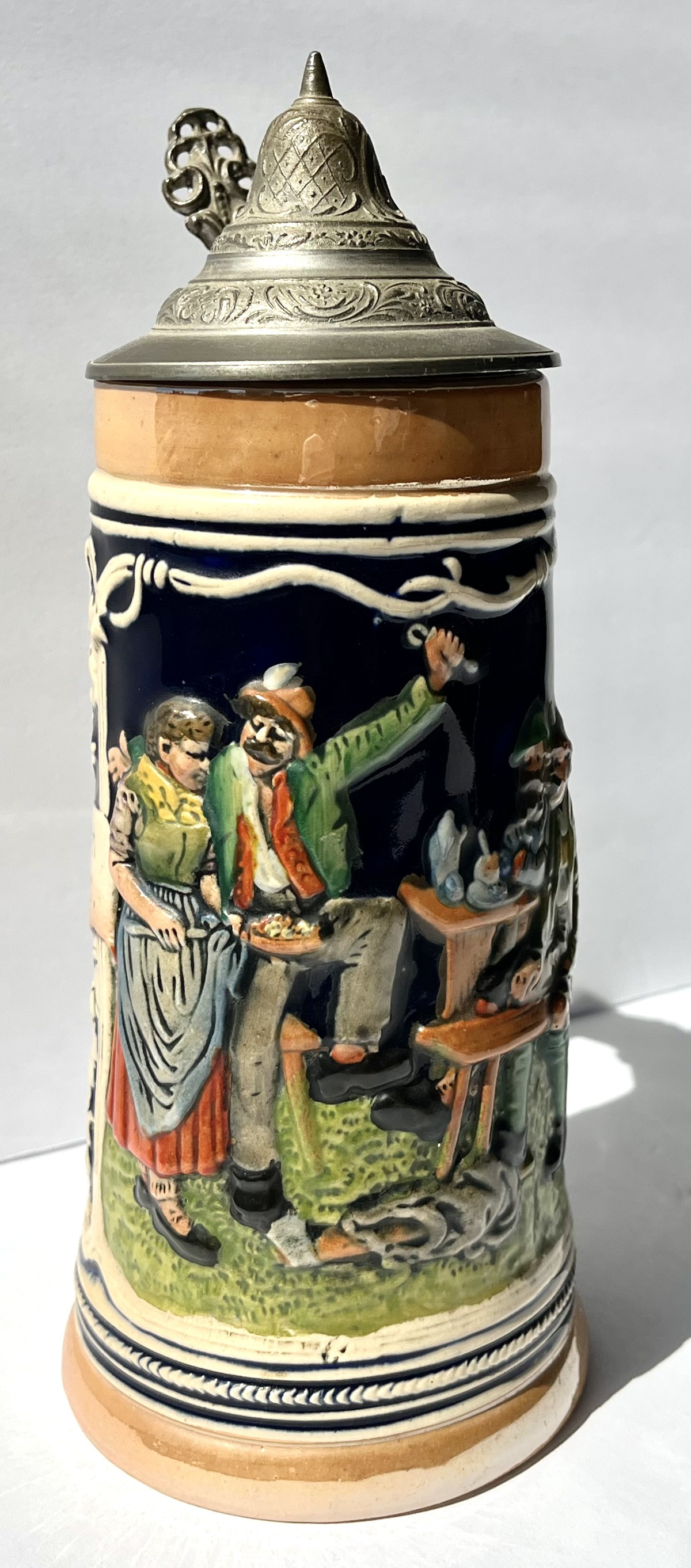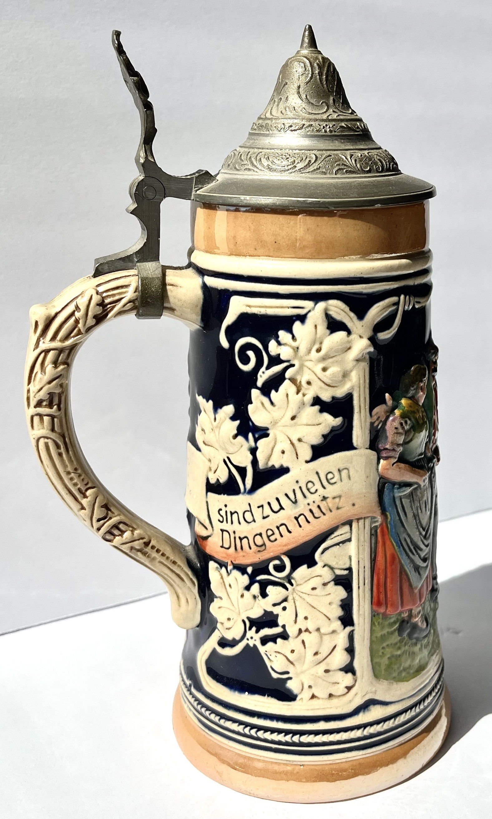 Type: Relief-molded, lidded stein with pewter lid