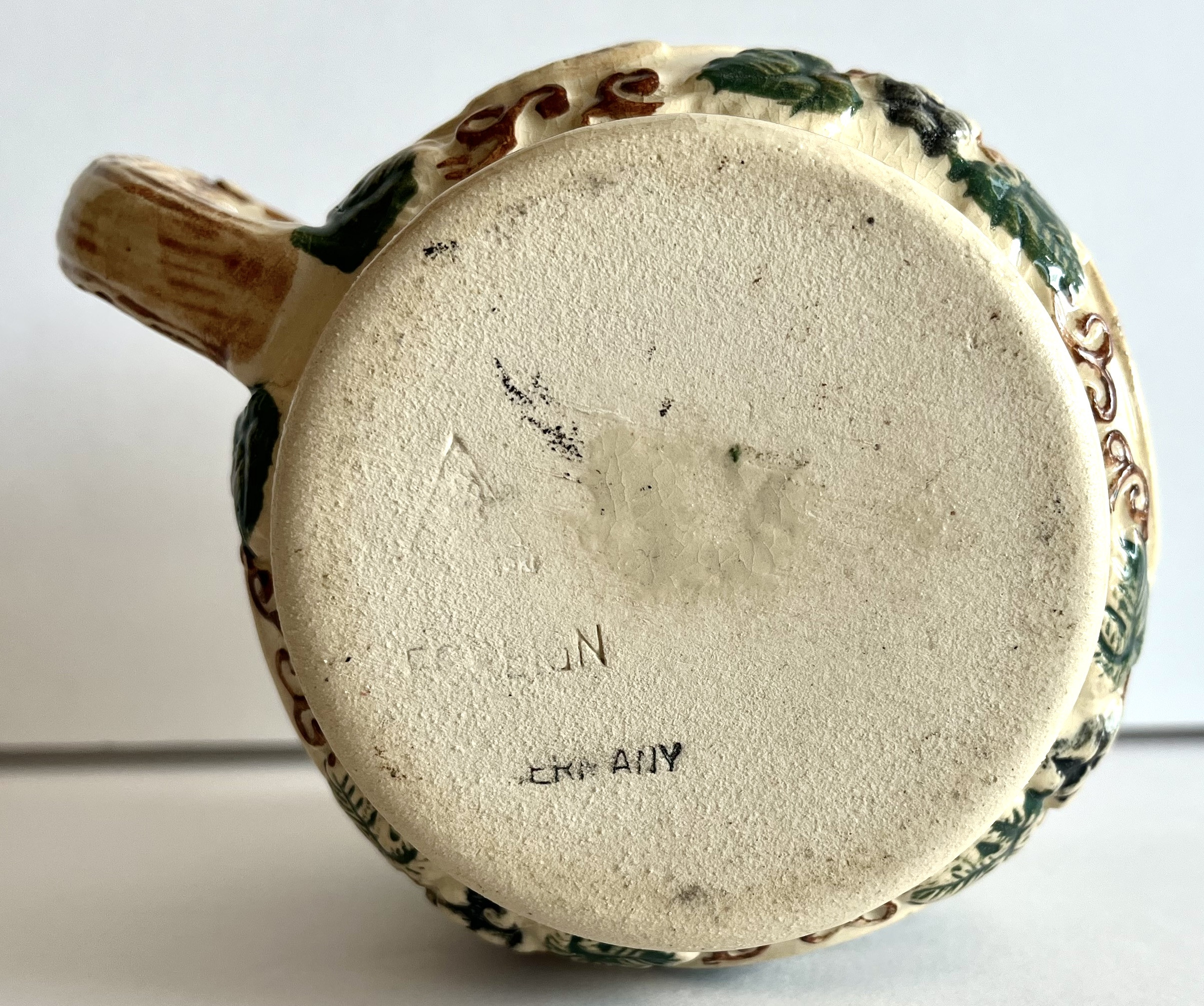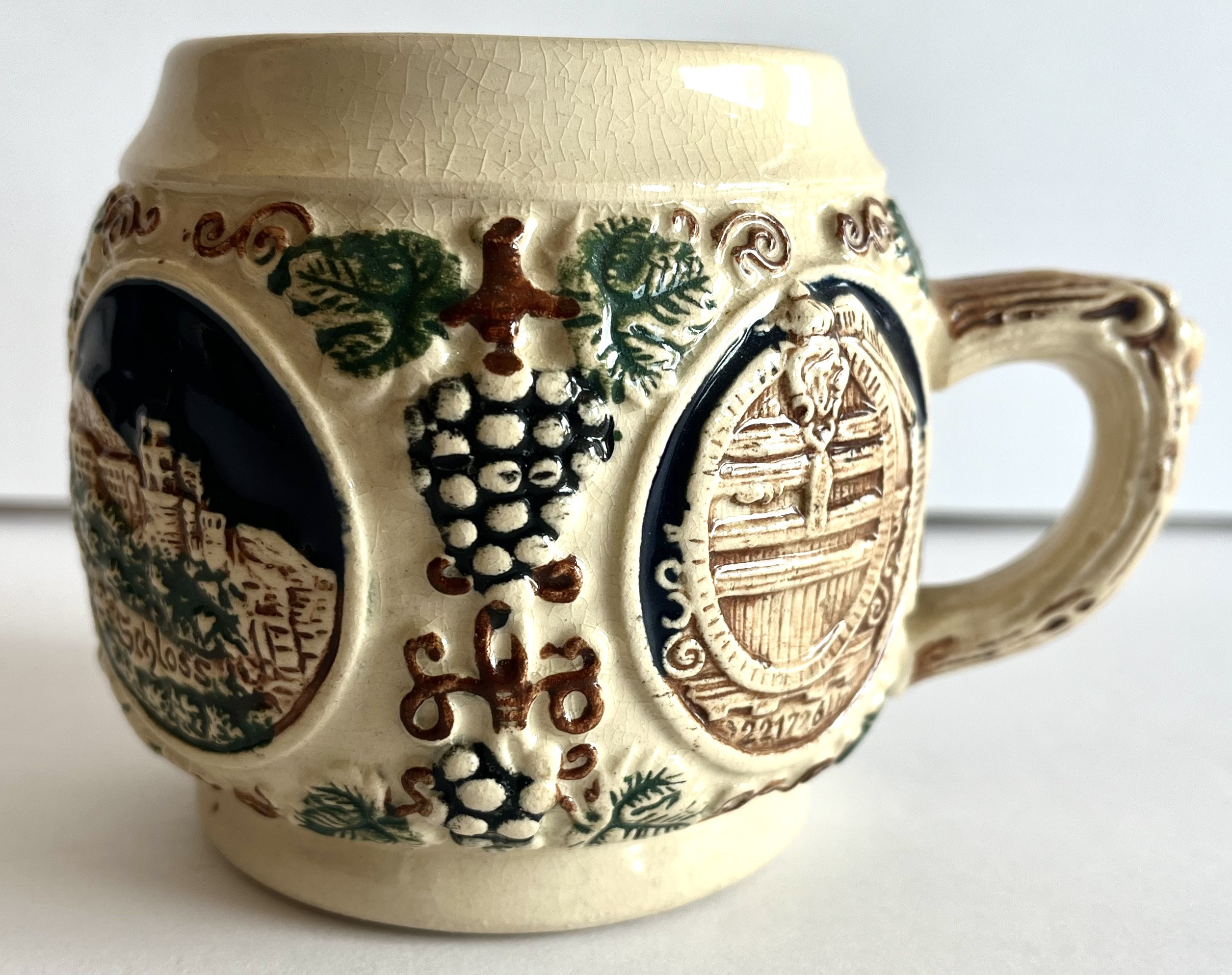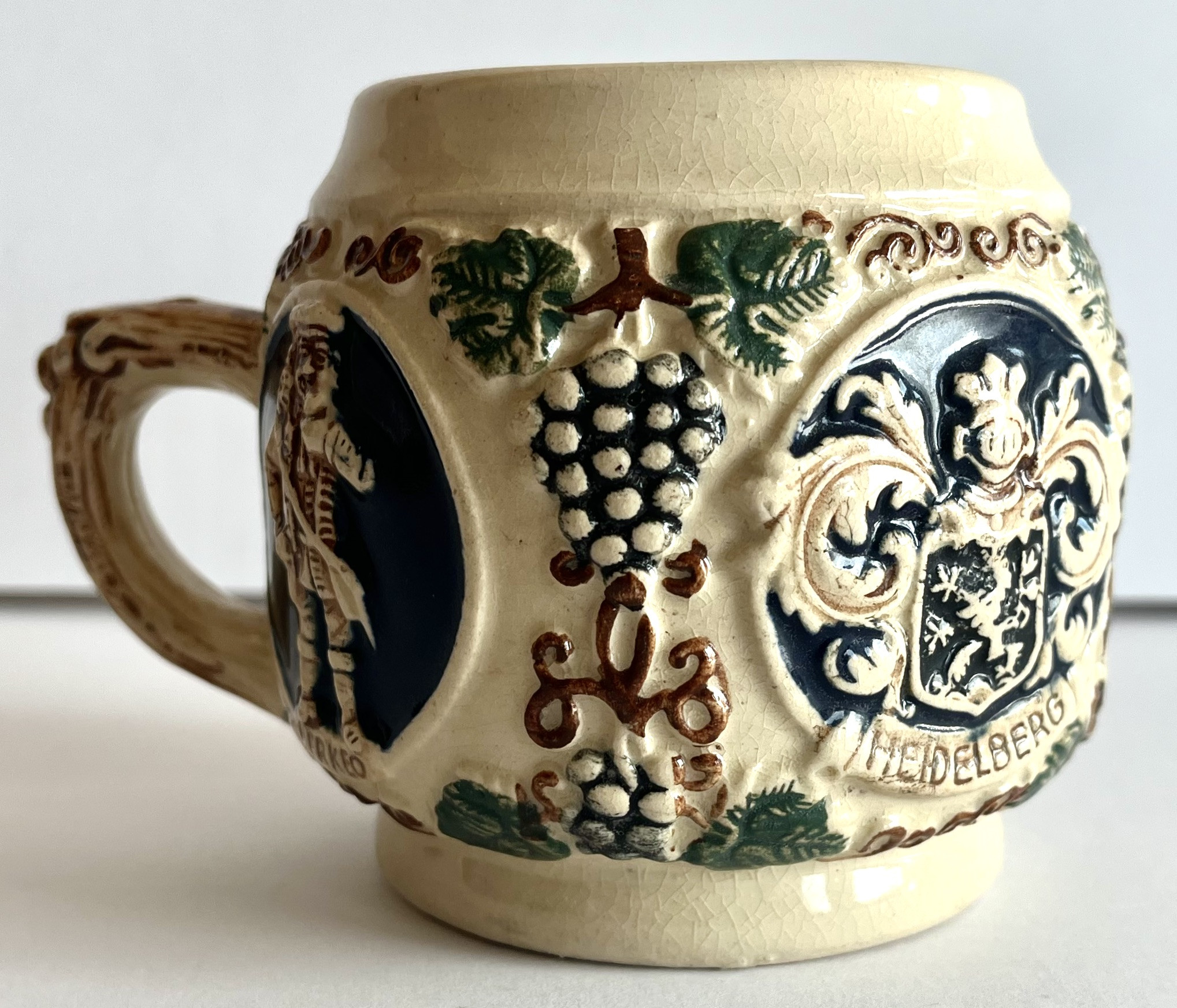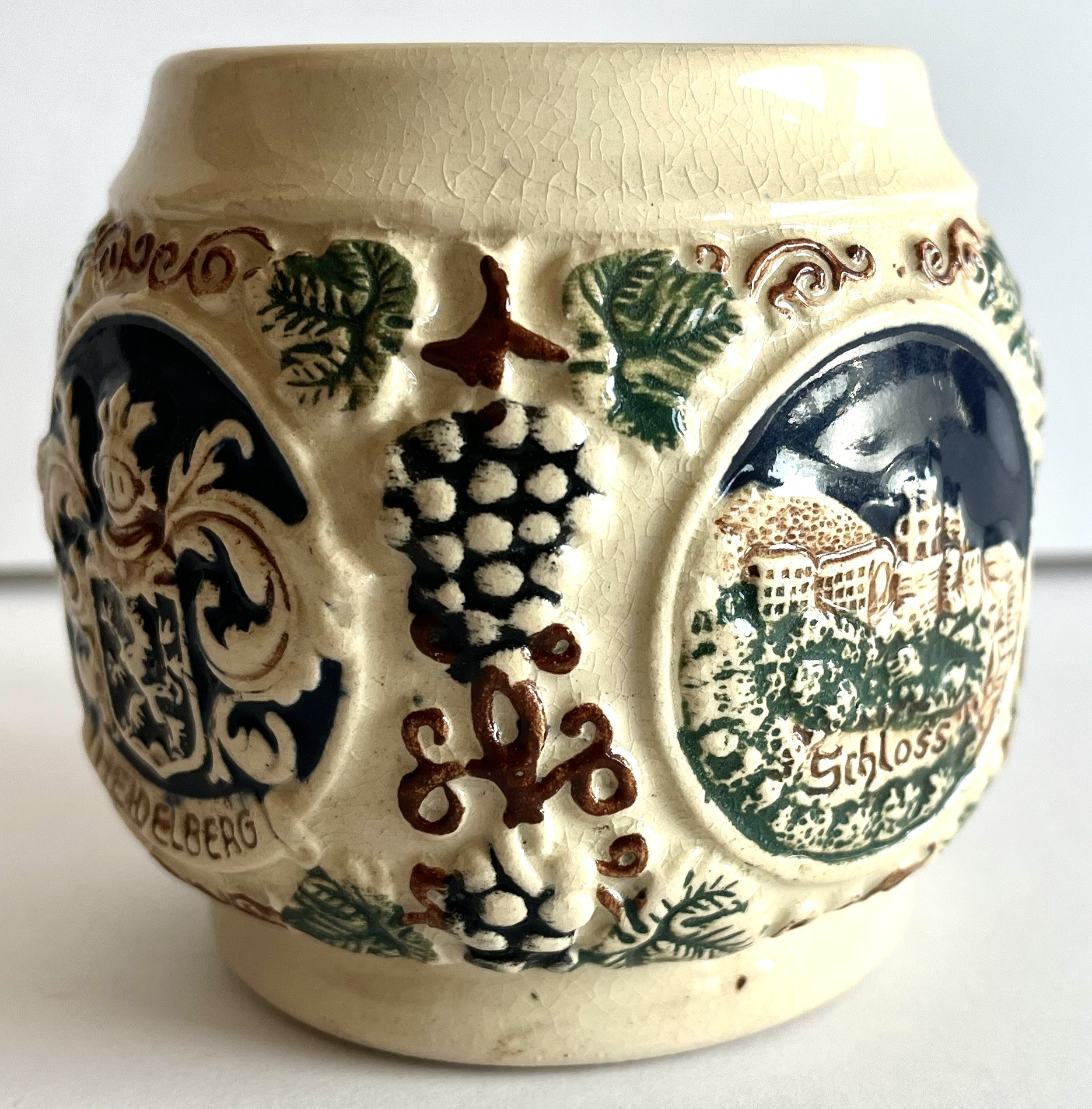 This stein likely dates to the early 20th century, possibly pre-World War II, based on the "GERMANY" export mark (used predominantly between 1891 and 1945 for goods exported to English-speaking countries after the McKinley Tariff Act of 1890). The relief design, subject matter, and crackle glaze are also typical of this time period. Heidelberg-themed steins were popular souvenirs for tourists visiting the city and its famous castle.