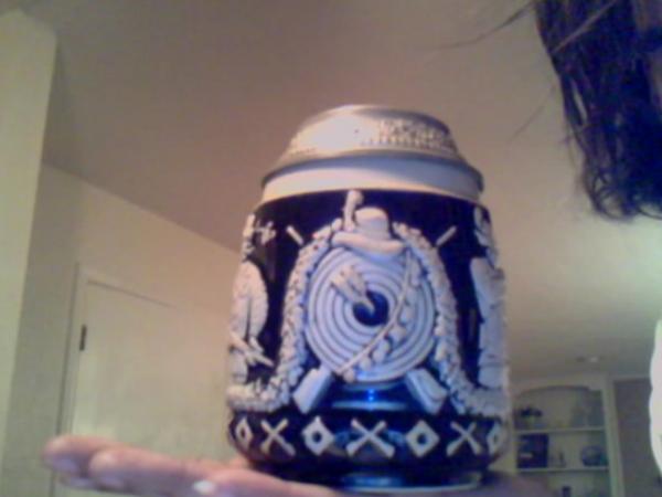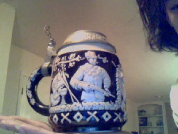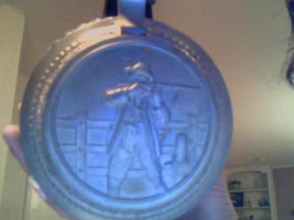 Description has the traditional hunter design with matchlock rifle. the front has a target which has a hunter's hat on top and an arrow dead center, the picture on the right shows a flag with two crossed rifles and a hunter pointing his rifle as if taking aim, the other picture has the hunter holding his rifle down. The lid is embossed with yet another hunter who is also taking aim. the bottom has the numbers 1410 with an oval which appears to contain an I over an H.