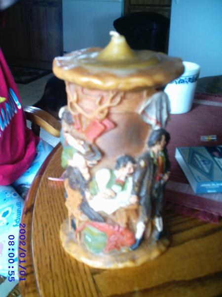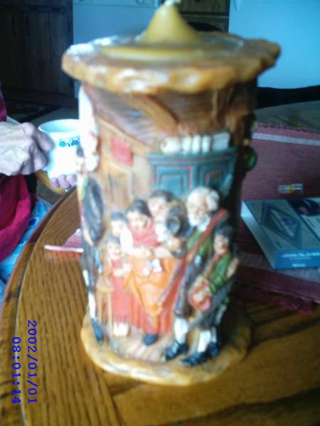 Has never been lit. Has 2 tags on bottom the white one has Diese Kerze ist Geschmacksmuster geschutzt written in german the other is gold and blue and has written GUNTER KERZEN GMBH-WACHSWARENFABRIK D-6968 WALLDURN/BADEN AND SEIT 1924 ON IT