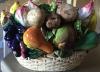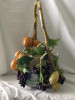 It is 34 cm / 13.5 in. diameter and 10 cm / 4 in. high. It has a raised decor with grapes, grape leaves, and vines. The glaze color is basically brown with beige and a light turquoise. The decor is orange, blue and light turquoise. It has three feet with holes in them, showing that the inside is hollow. "1895" is stamped on the bottom (indented) and there are two brown marks , like little check marks, burned in the ceramic.