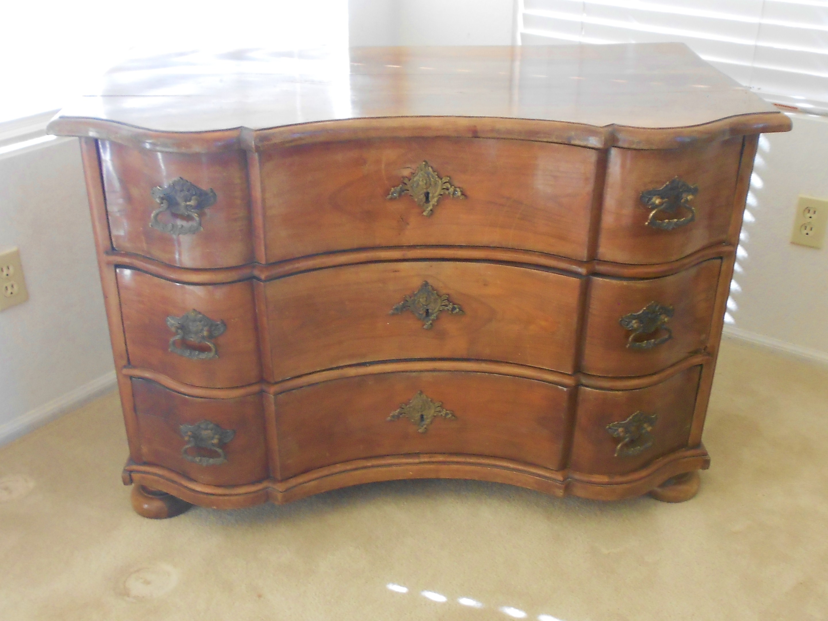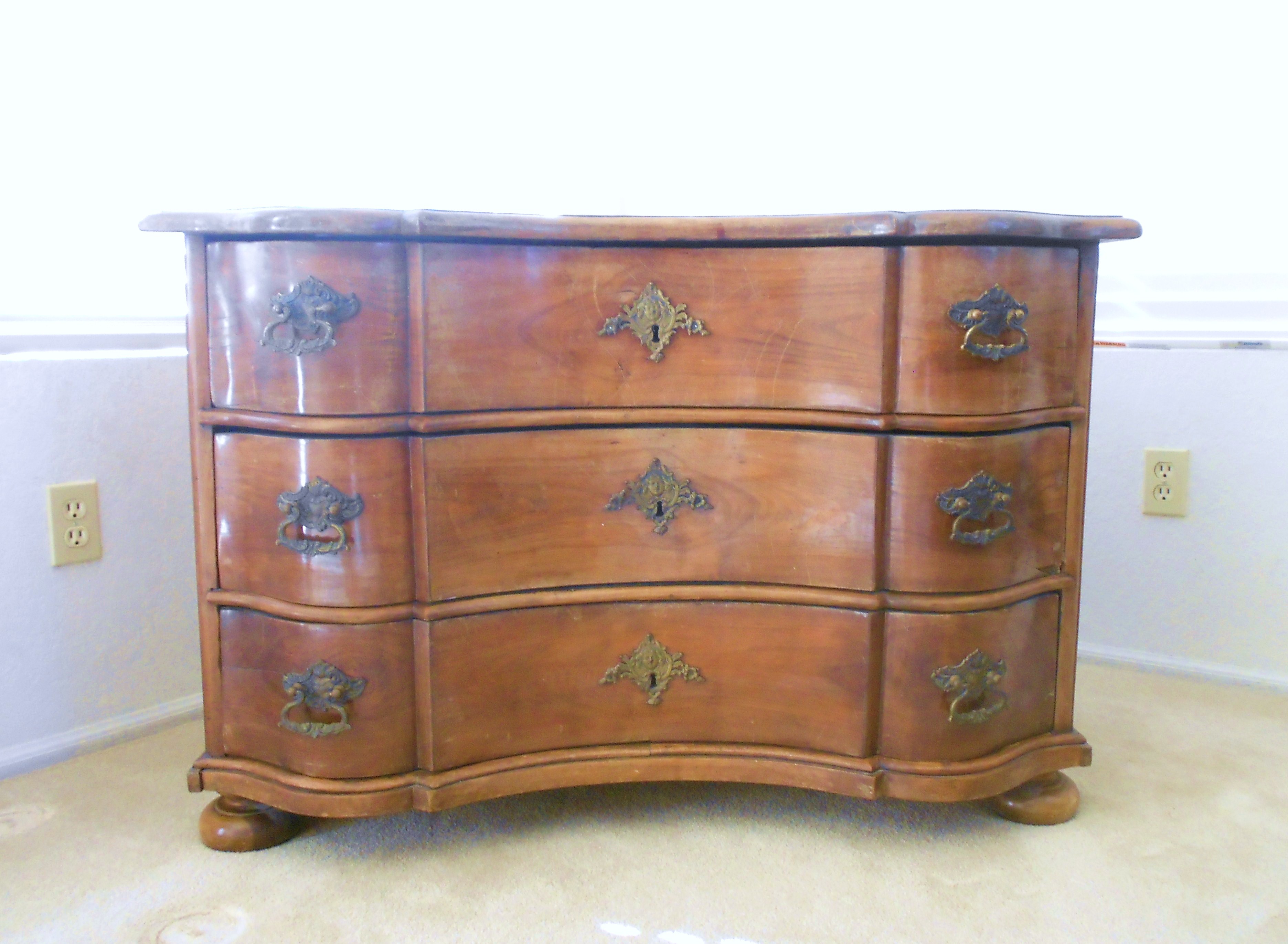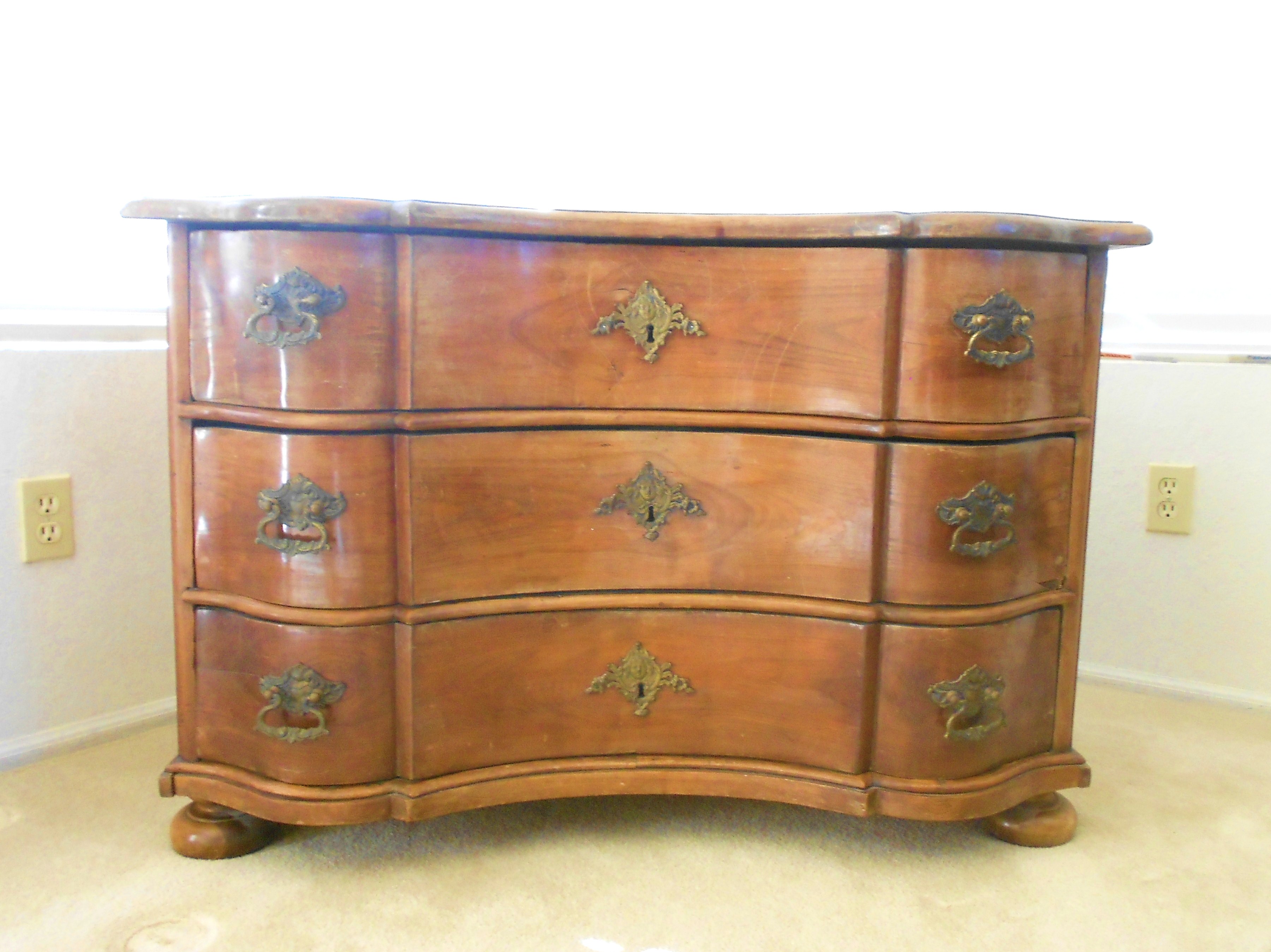 This German chest of drawers was purchased in an antique store in Germany in 1962. It is a very sturdy piece and quite attractive. It measures approximately 29 inches tall, 44 inches long, and 24 inches deep. It has been in my family since it's purchase in 1962.