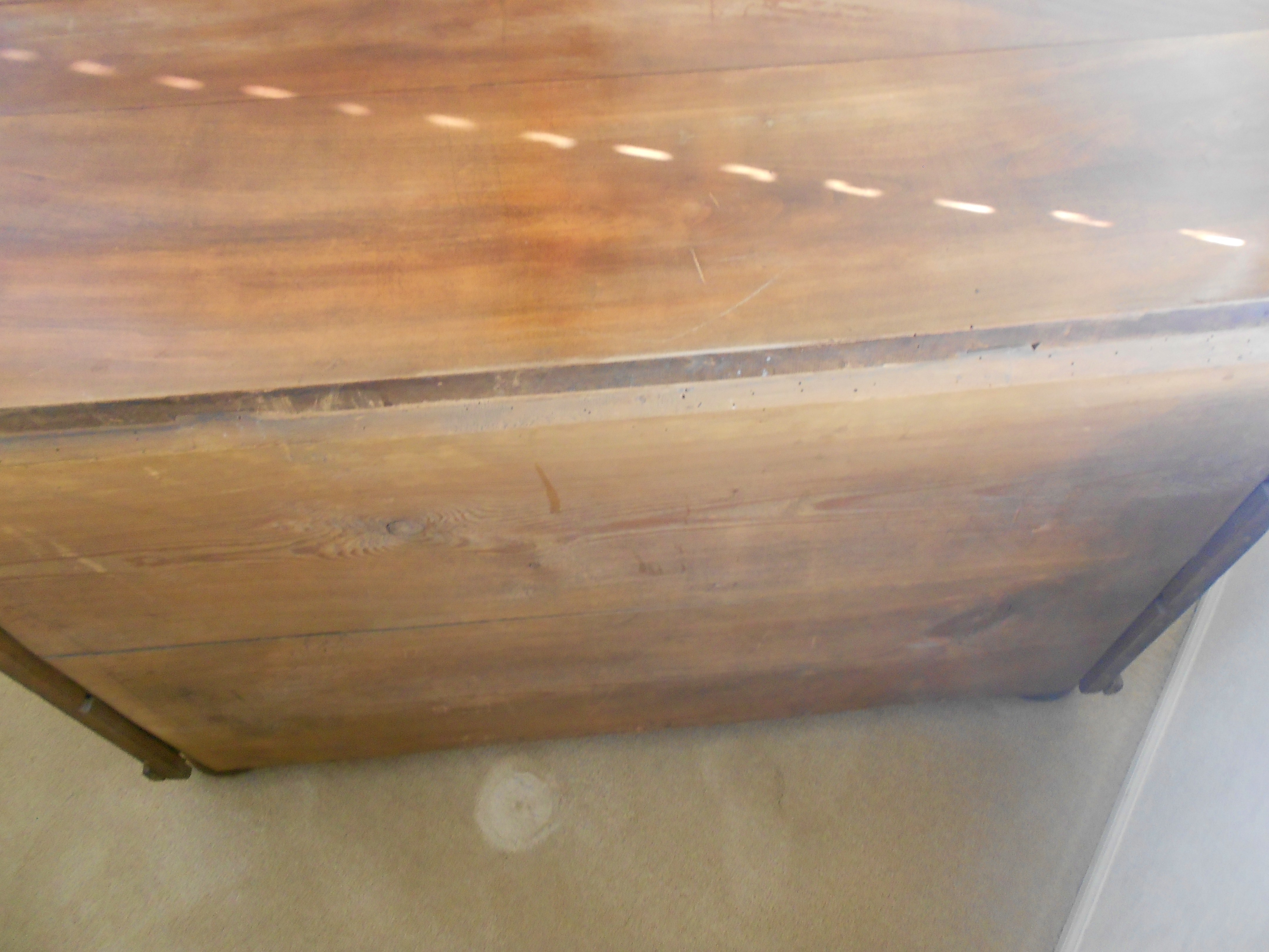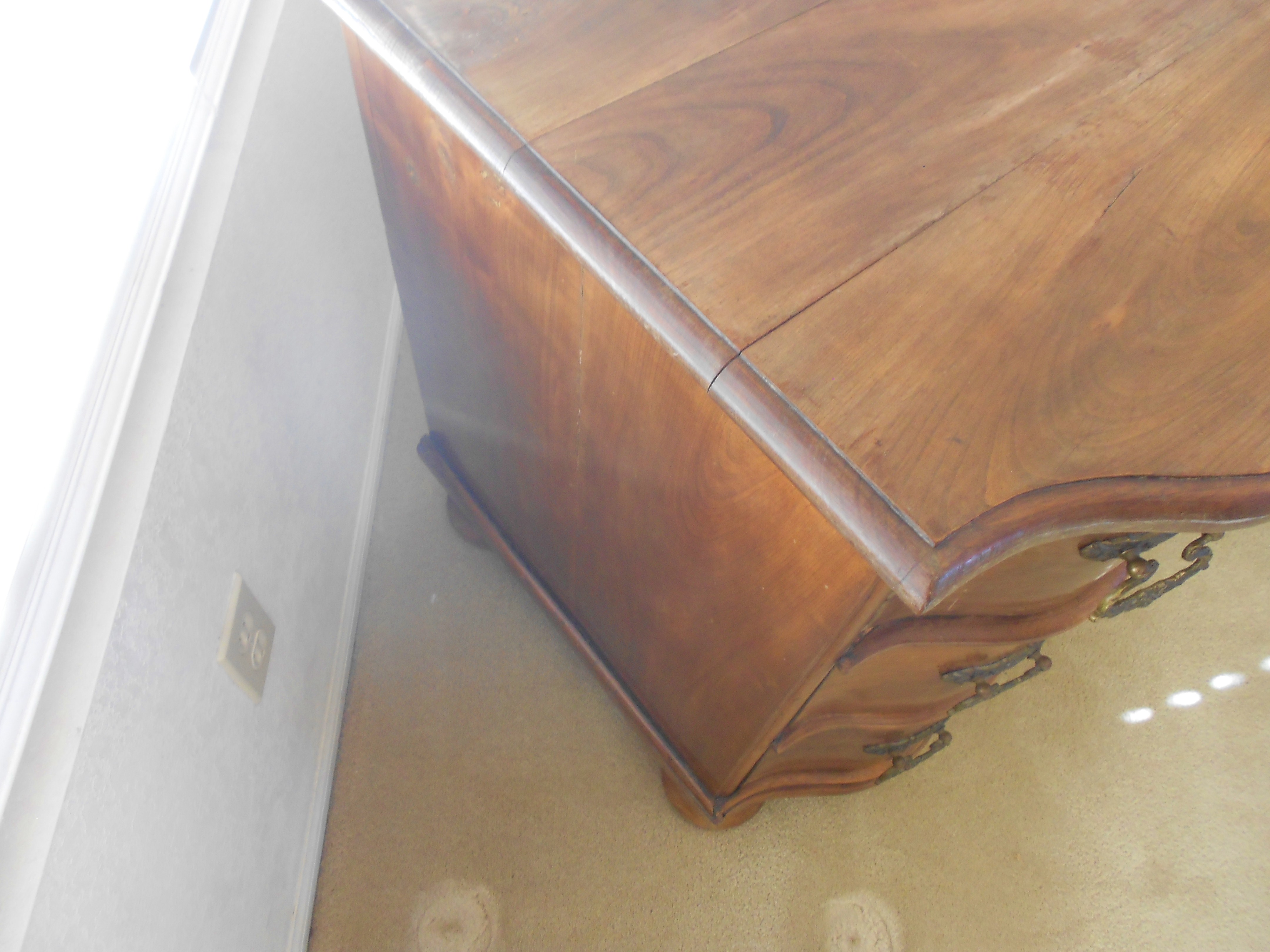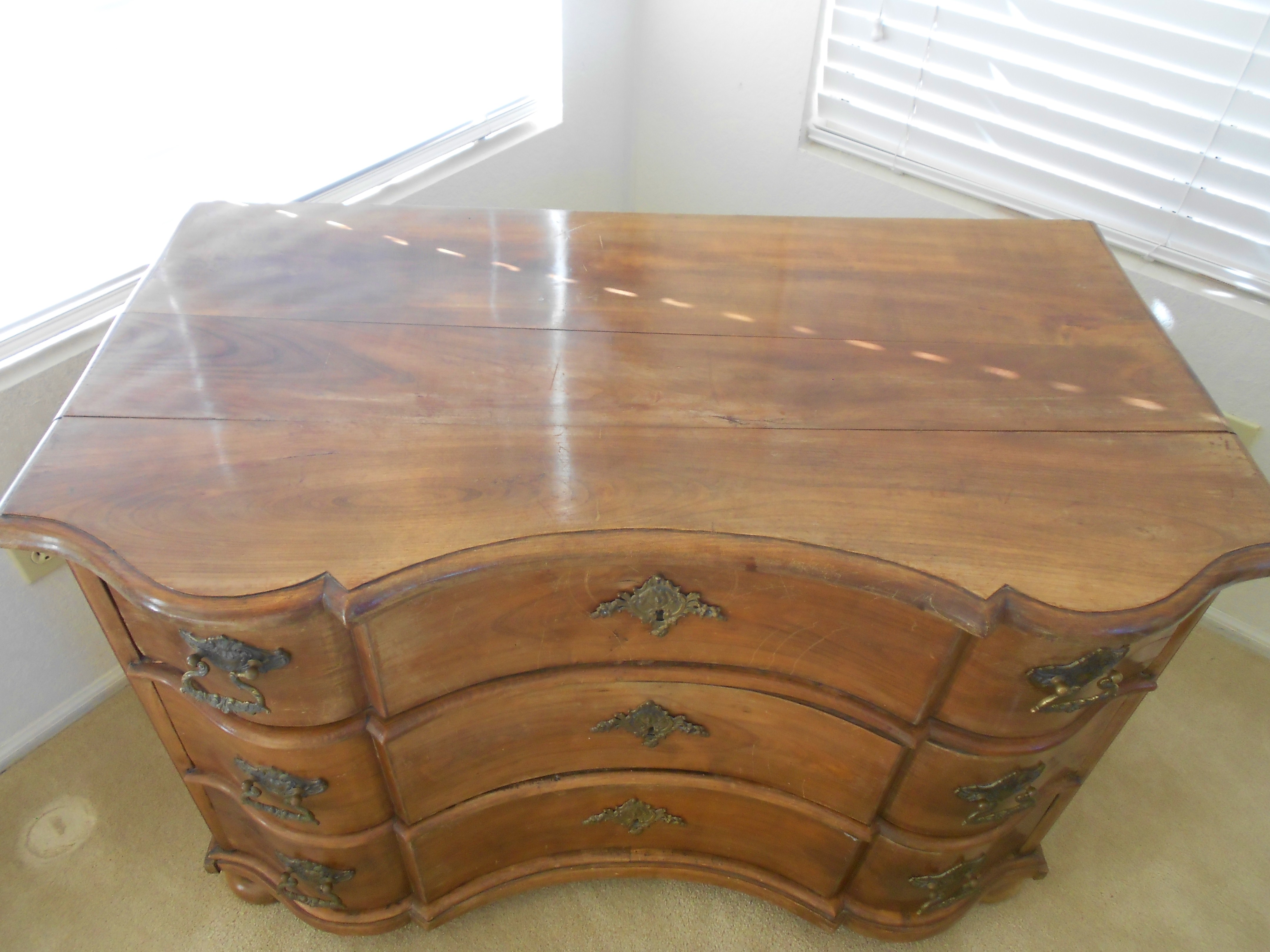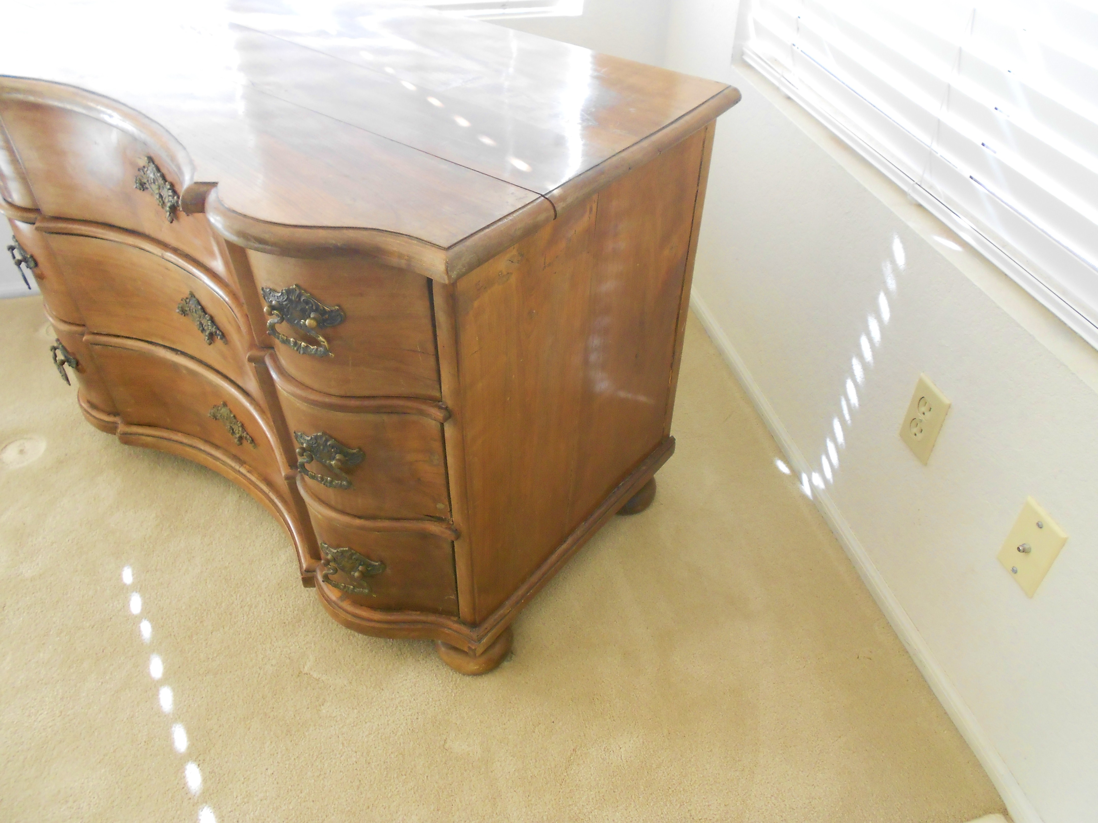 This German chest of drawers was purchased in an antique store in Germany in 1962. It is a very sturdy piece and quite attractive. It measures approximately 29 inches tall, 44 inches long, and 24 inches deep. It has been in my family since it's purchase in 1962.