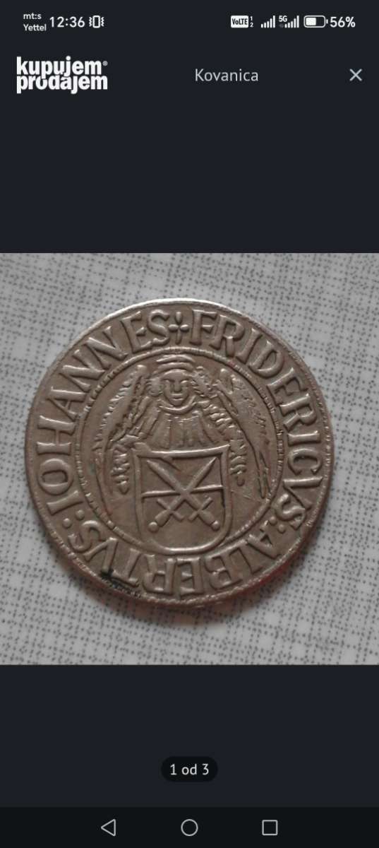 This item is a commemorative coin, likely made of silver or a silver alloy, featuring intricate designs on both sides. The coin measures approximately 3 cm in diameter and has a weight typical of similar coins from the period. The obverse side displays the name "Johannes Fridericus" along with a depiction of a figure holding a shield with crossed swords, while the reverse side features the inscription "Hannover Deutschlands" and the year "1936" along with a symbol resembling a hammer.