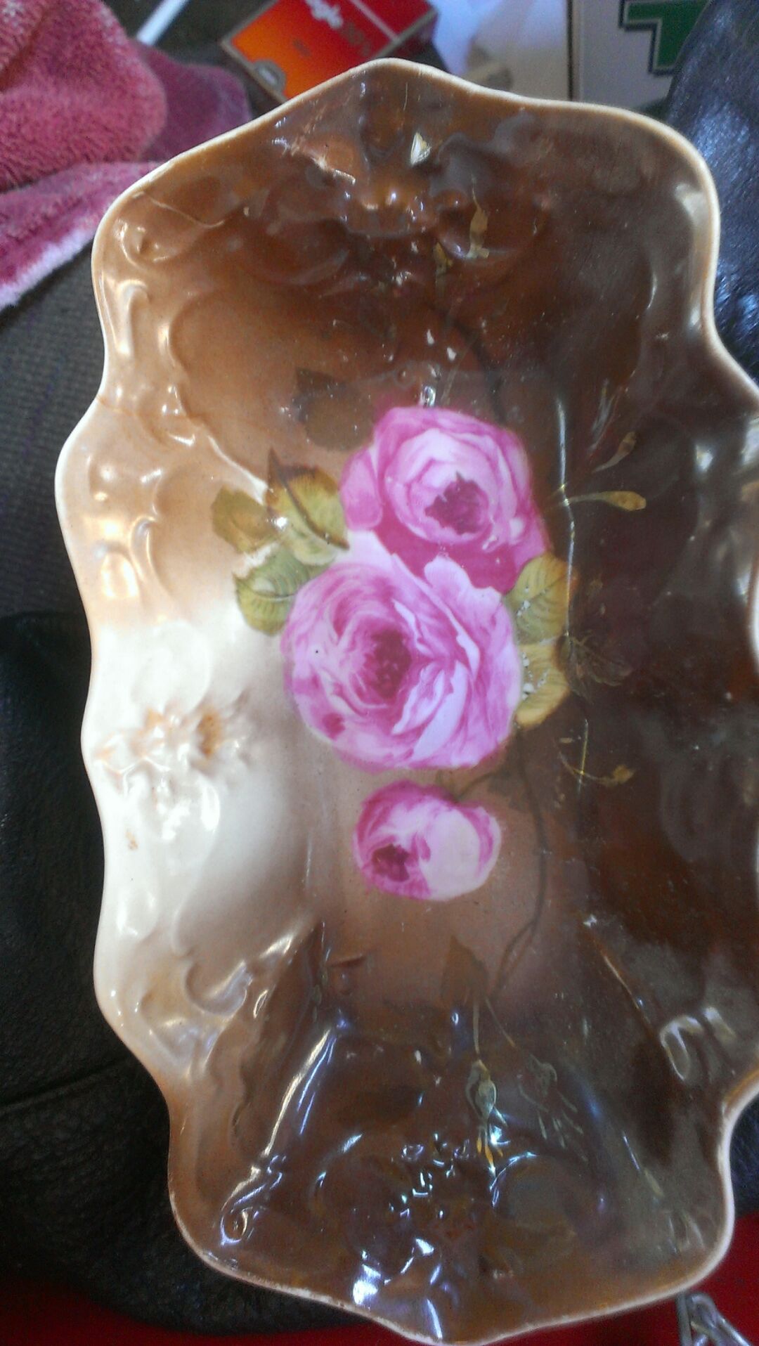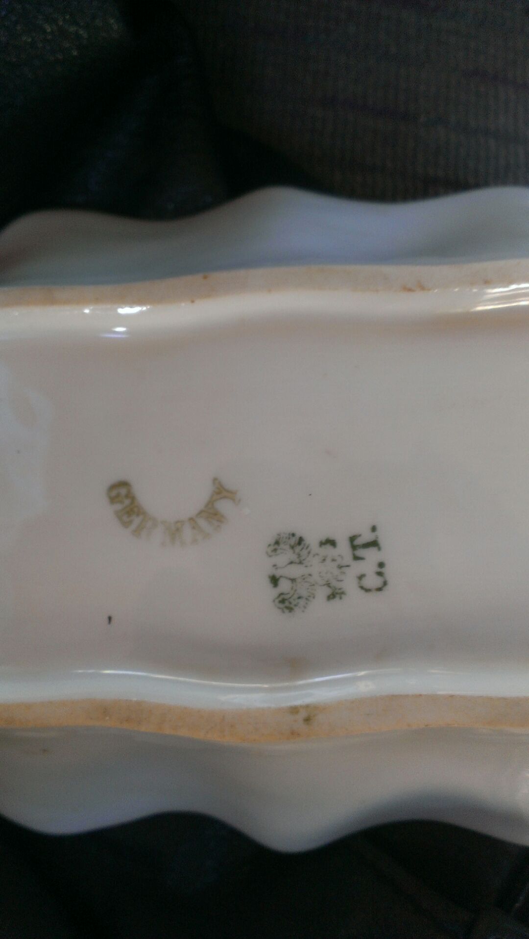 I was recently cleaning out my grandparents home as my grandfather passed away and my grandmother has recently been placed in a nursing facility and I came across an interesting piece. The item has pink roses in the bottom and I am not quite sure what it was used for but it has a stamp on the bottom. The Word Germany Arched on the bottom with an Eagle and the letters C.T. stamped next to the word Germany.