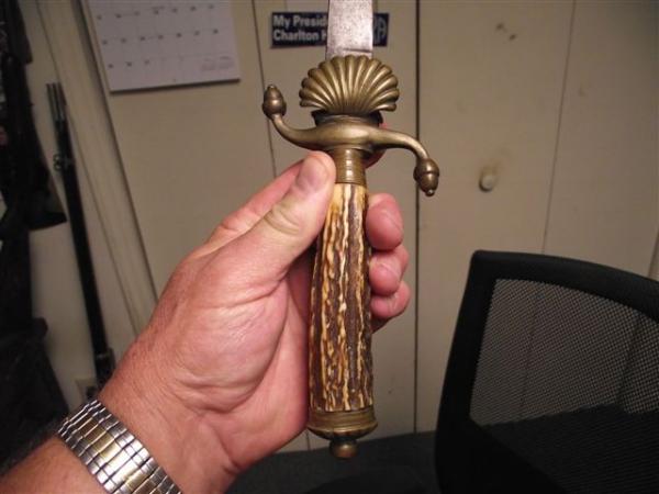Engraved blade w/Mitt Gott Fur Kaiser und Reich written on it. Helmet sitting on a drum. #56 is on the blade near the handlle guard. The dagger and sheath are in good condition.Possibly a hunter's or gentleman's hanger/dagger? Have any idea of value?