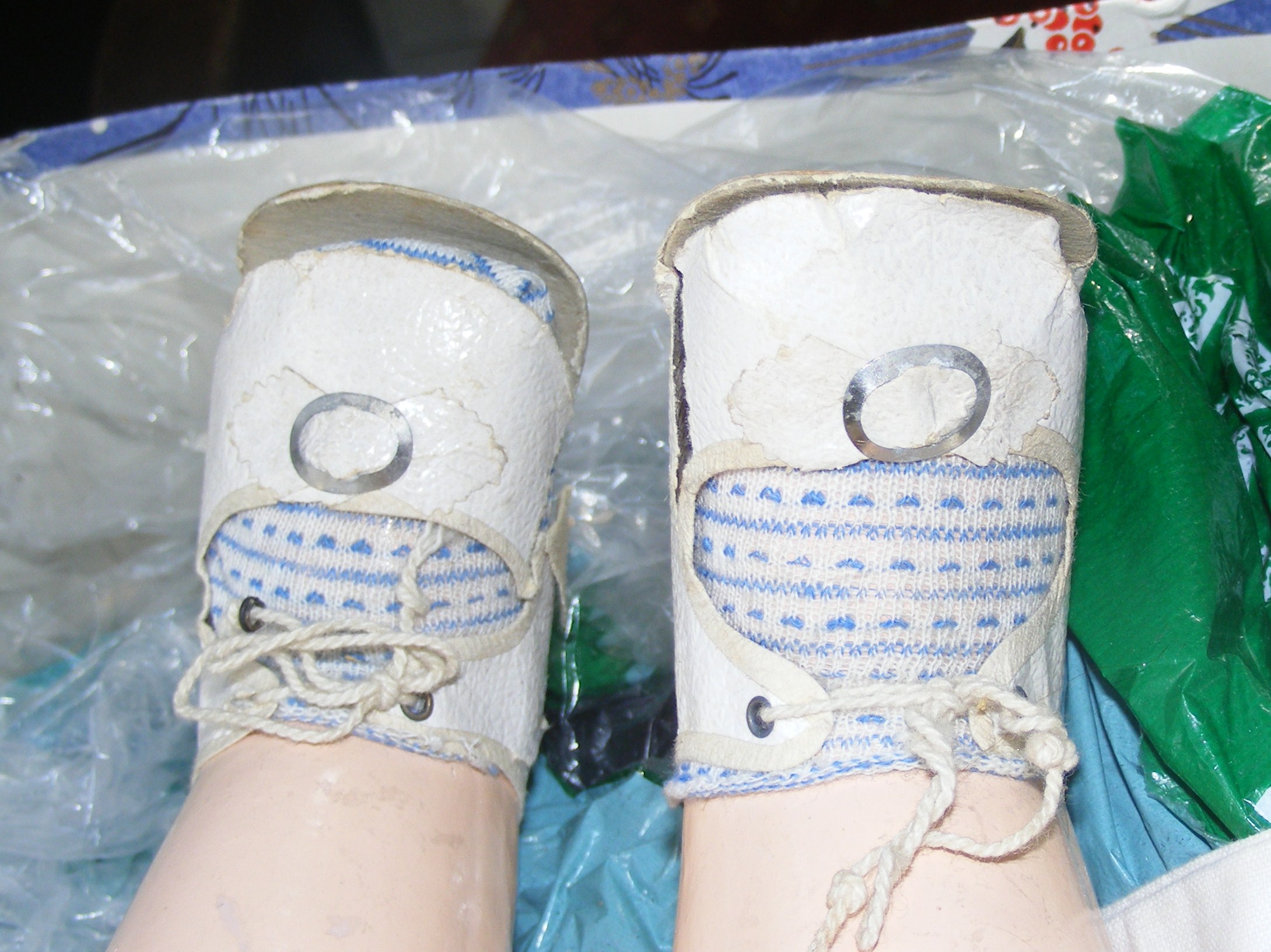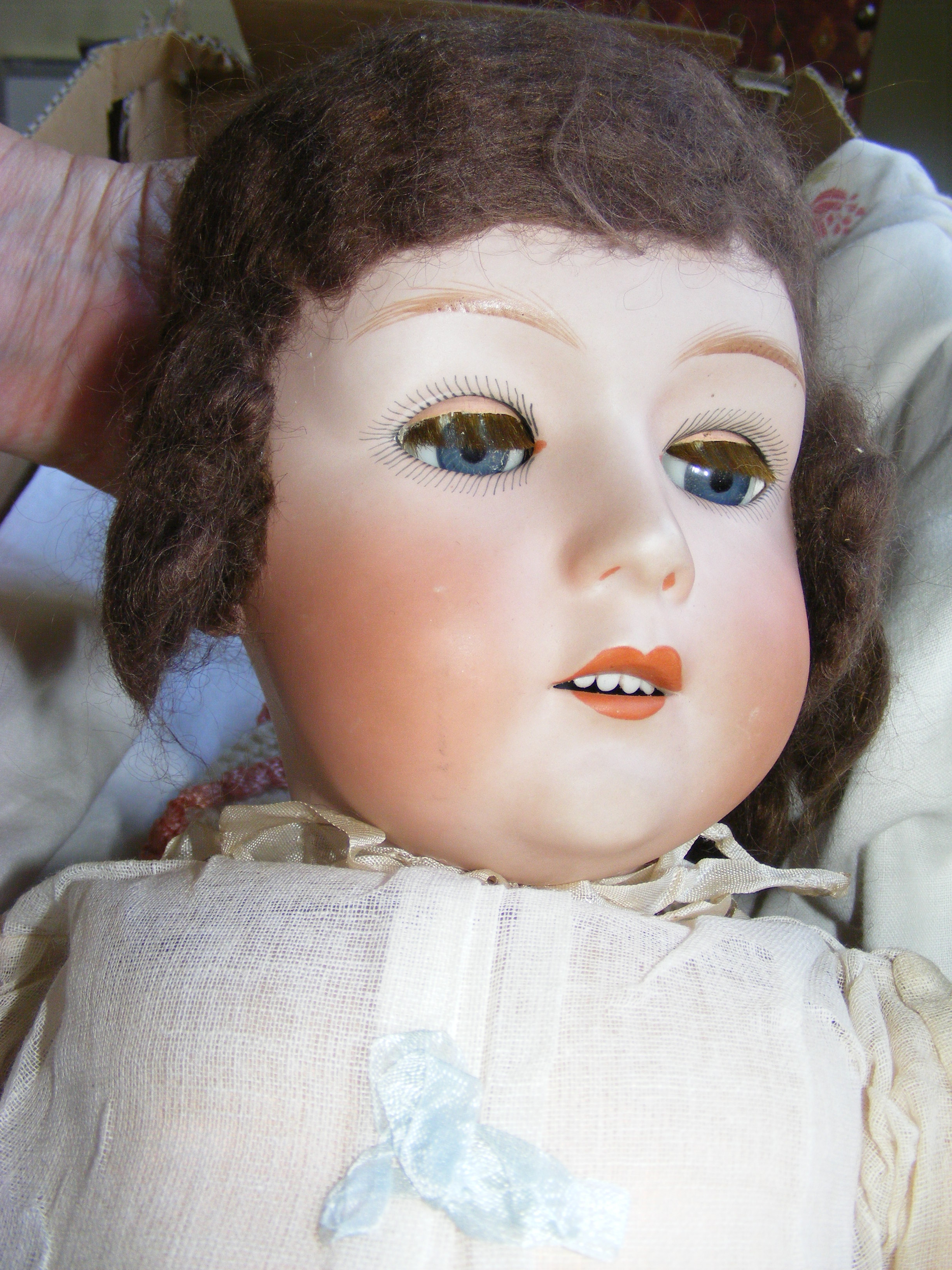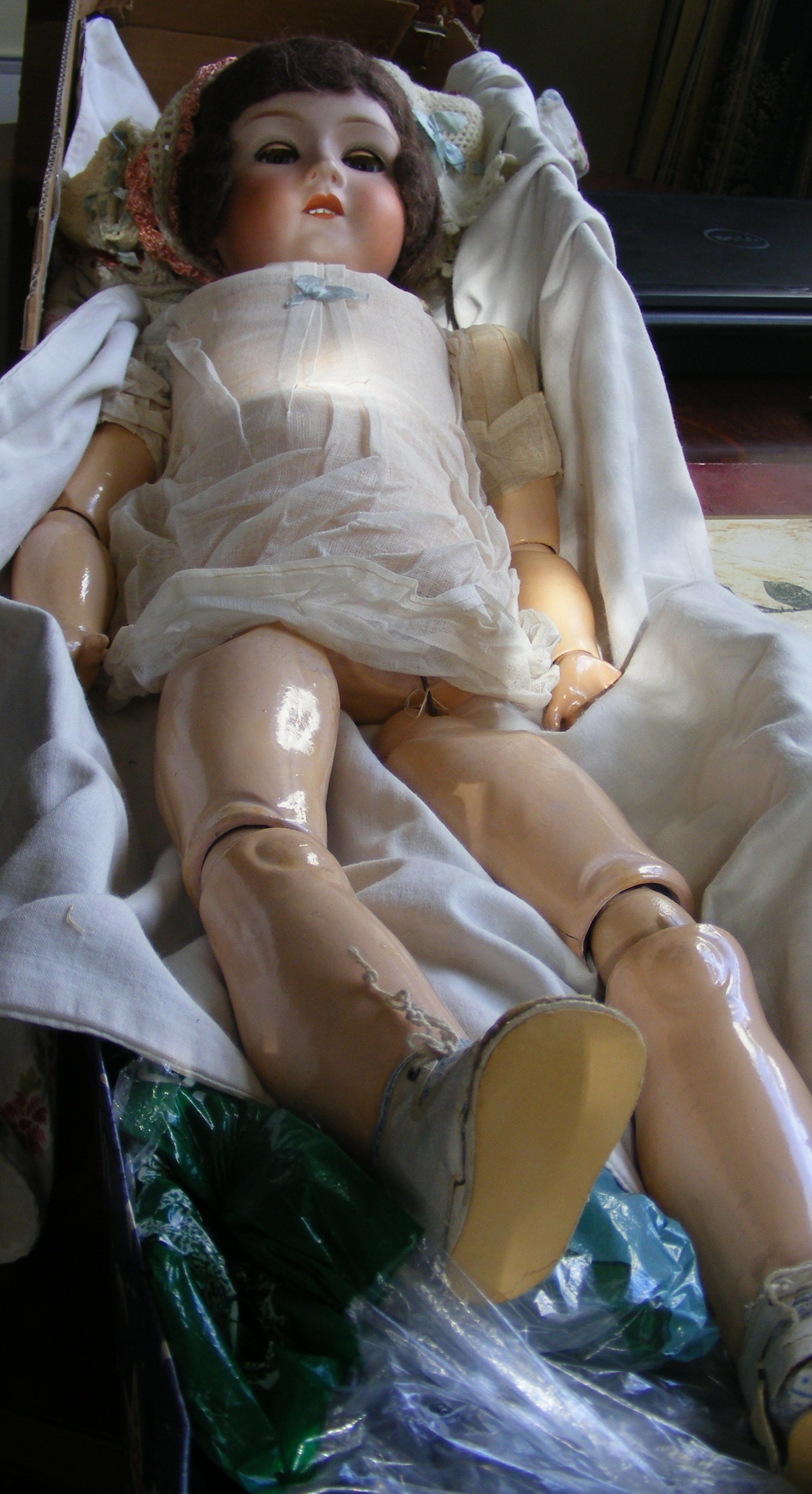 SHE HAS WHAT LOOKS LIKE G.M.H.ON THE BACK OF HER HEAD AND GERMANY.   HAS OLD CLOTHES AND SHOES, THE SHOES AND SOCKS ARE VERY WORN AND ONE OF HER LEGS NEEDS FIXING.  HER FACE IS PRETTY AND HER EYES OPEN ONCE HEAD IS UP.