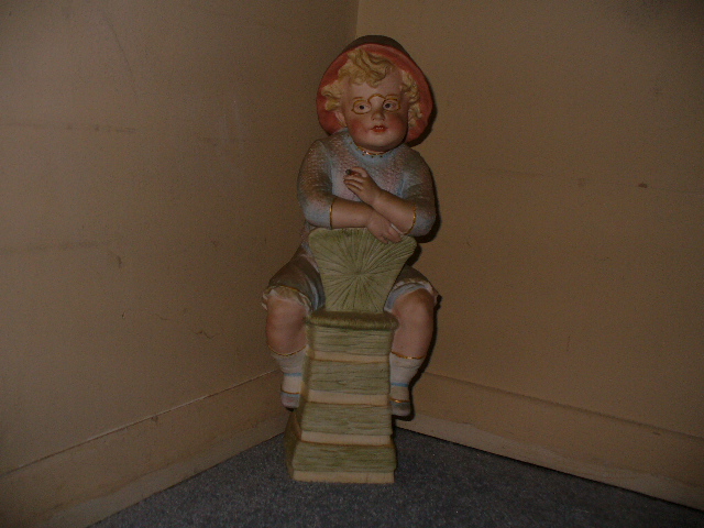 This piece is a Heubach painted porcelain bisque . The young boy is smoking a cigar or stogy. He has wonderful eyes that seem to follow one around the room!