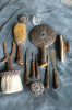 This is a set of knives and forks to be used when eating steaks. The entire set has antler handles and is made of stainless steel. It is housed in a green leather looking case with green satin inside. There are places within the box for six of the forks and six of the knives, but there are an extra two forks and two knives that are included with the set making it a service for eight. The knives blades are stainless steel with gold laid over it and etchings done along the blade. Every fork and knife have stamped on them
