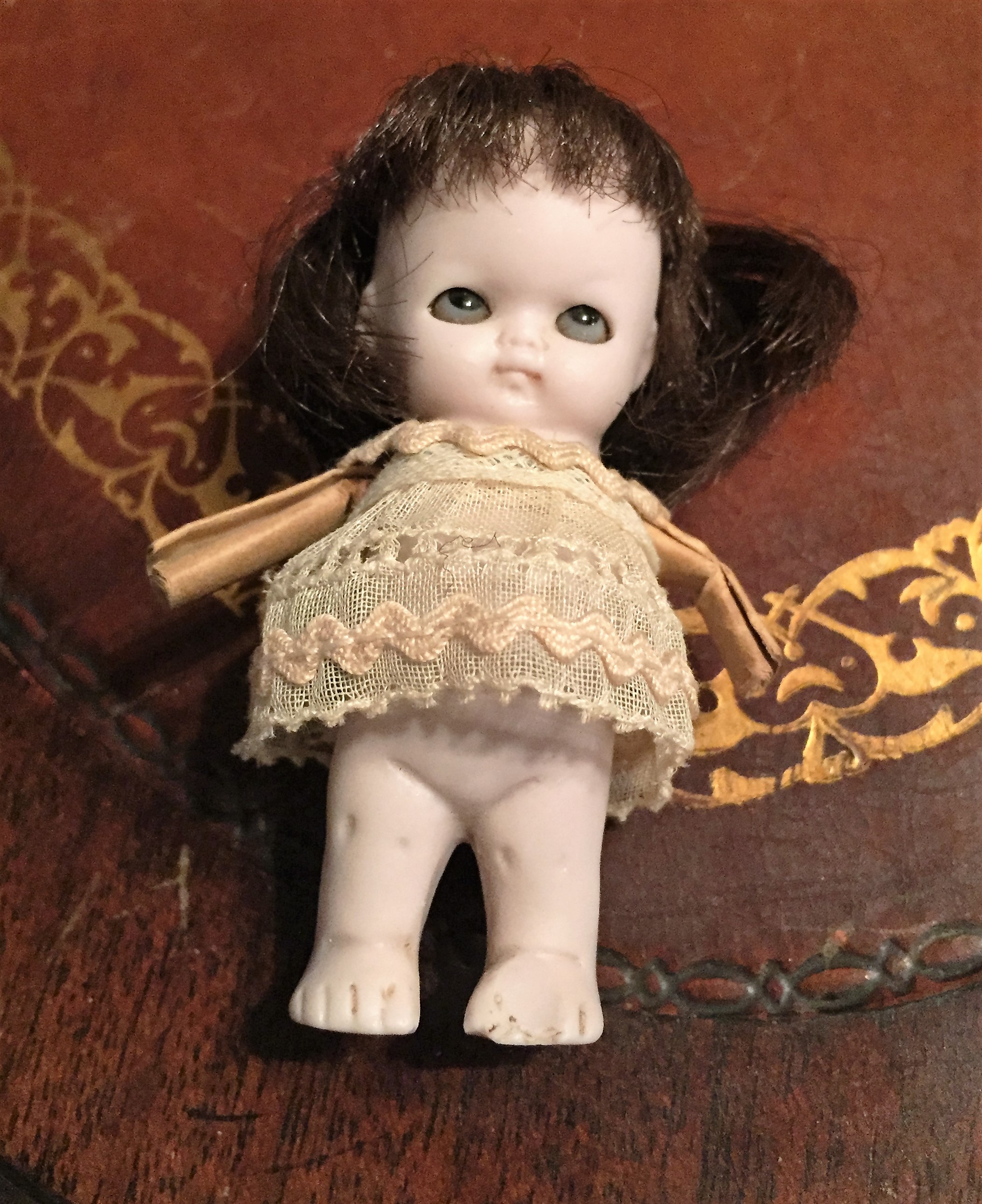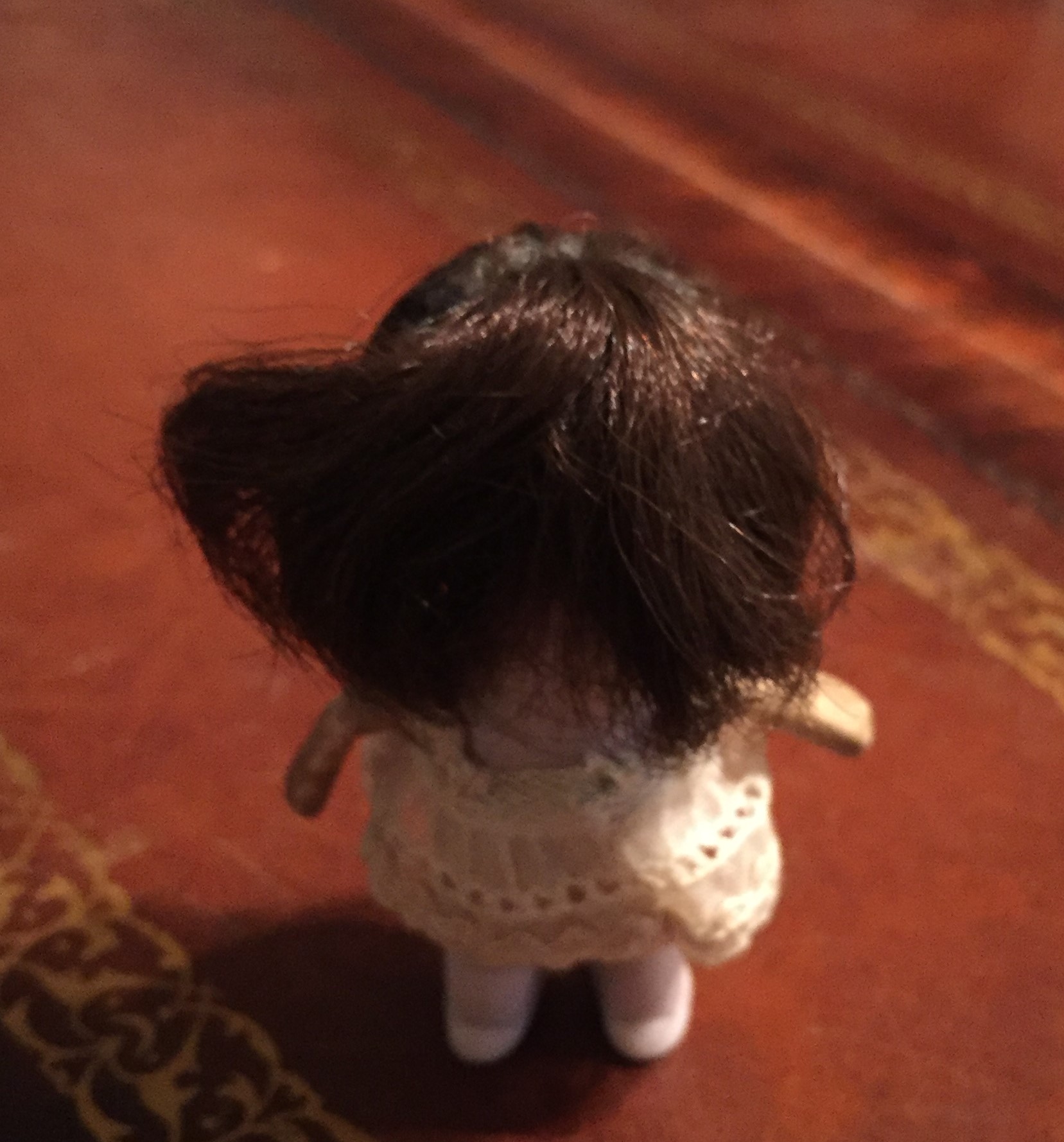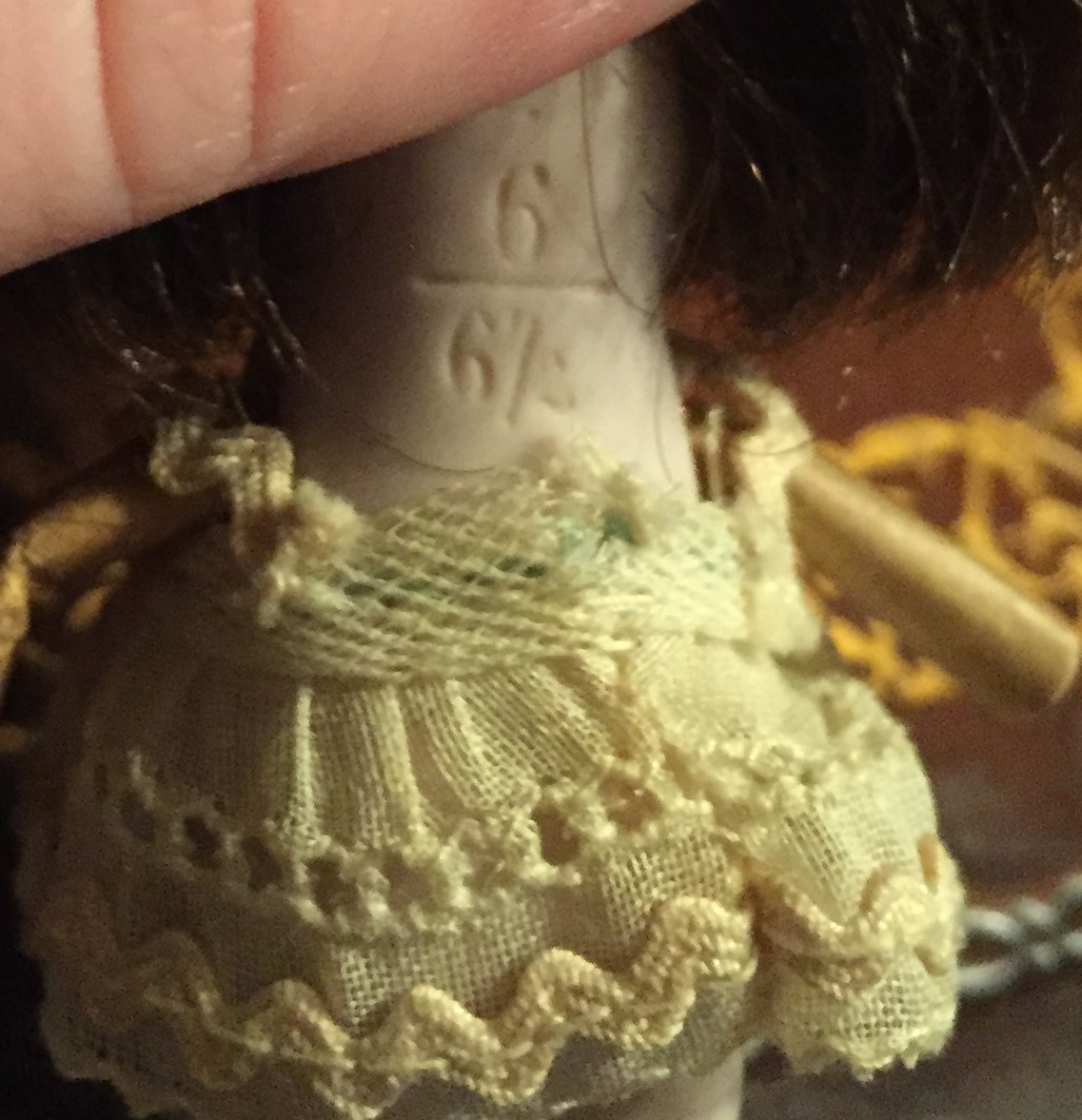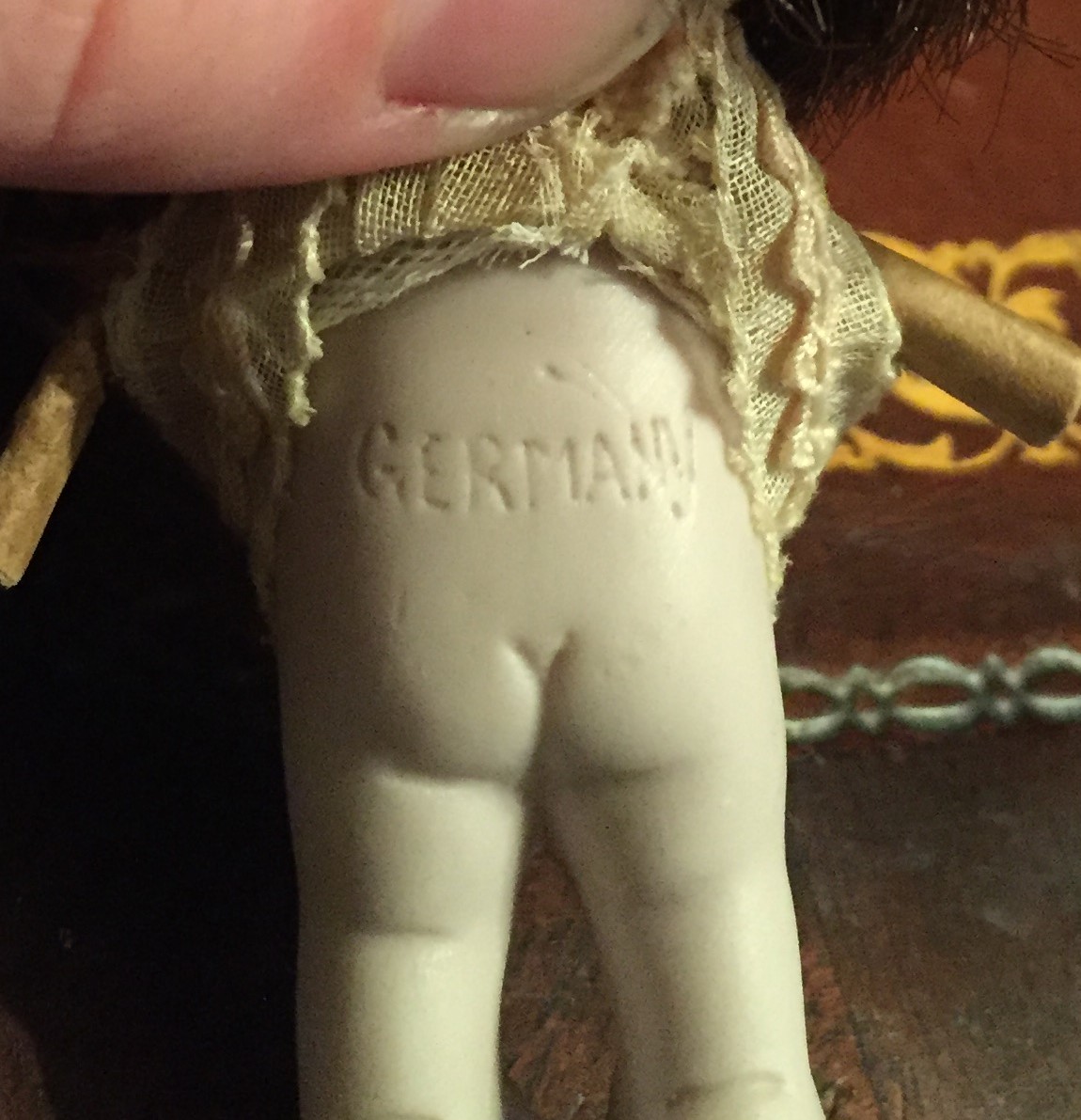 This is a baby made of bisque. She has synethitic hair and glass eyes that are stationary. They are looking up and she is either mean or mad. She has germany on her back and 6 underlined with 6 1/2 on the back of her neck. She is about 2 1/2 inches tall. Her arms are missing, but were replaced with a piece of paper years ago. She had an odd bob hair cut with bangs. I uploaded tons of pictures for everyone. I would appreciate any help. Thank you!