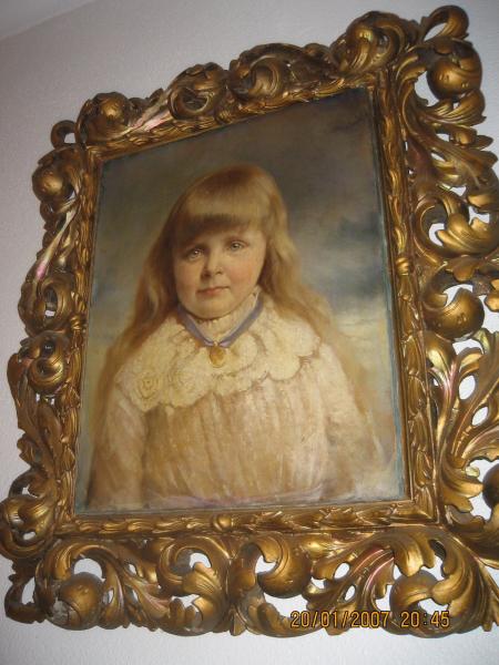 German family had just come to Mafikeng (Africa) The family had their belongings stored at My grandparents place. The german family contracted a black water fever and past away. Mother, Father and 3 children. My Grandparents had their belongings shipped back to Germany. While growing up in 1950s there were scetchings of european stags in this frame... The frames where handed down to my parents from my granparents and my father wanted to clean the glass in the frame and under the scetching of the stags was the picture of this little girl. We cant but help think that she was some sort of Nobility with the blue ribbon around her neck. There is no signature on the painting, it was said that back then in THOSE times when painters were commissioned to paint portrates they did not put their signature on them... but on the right hand corner of the painting it seems as is the signature were blotted out.