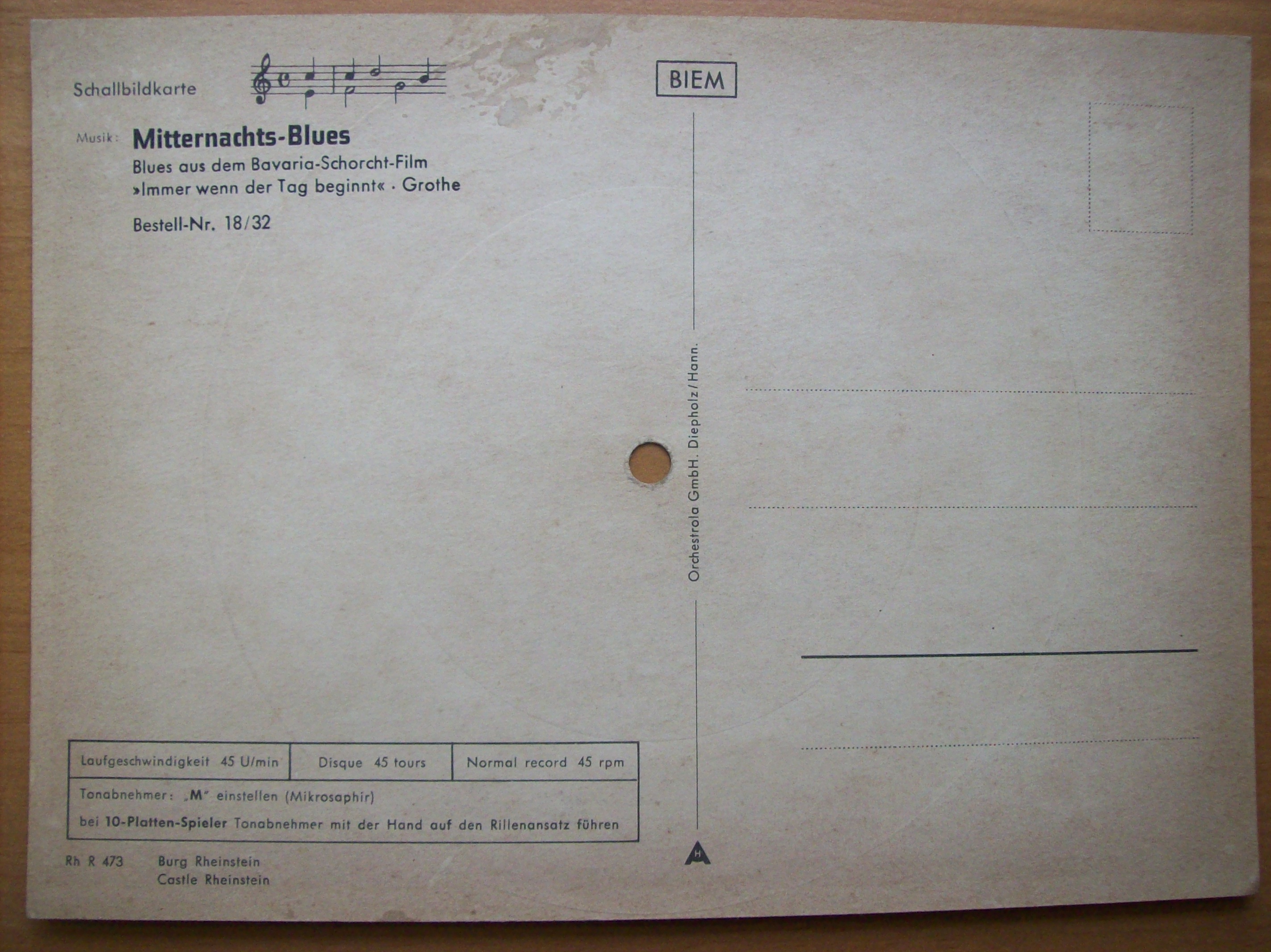 1. The first one is of Burg Rheinstein ( Castle Rheinstein). It plays Mitternachts-Blues. It also says Bestell-Nr. 18/32