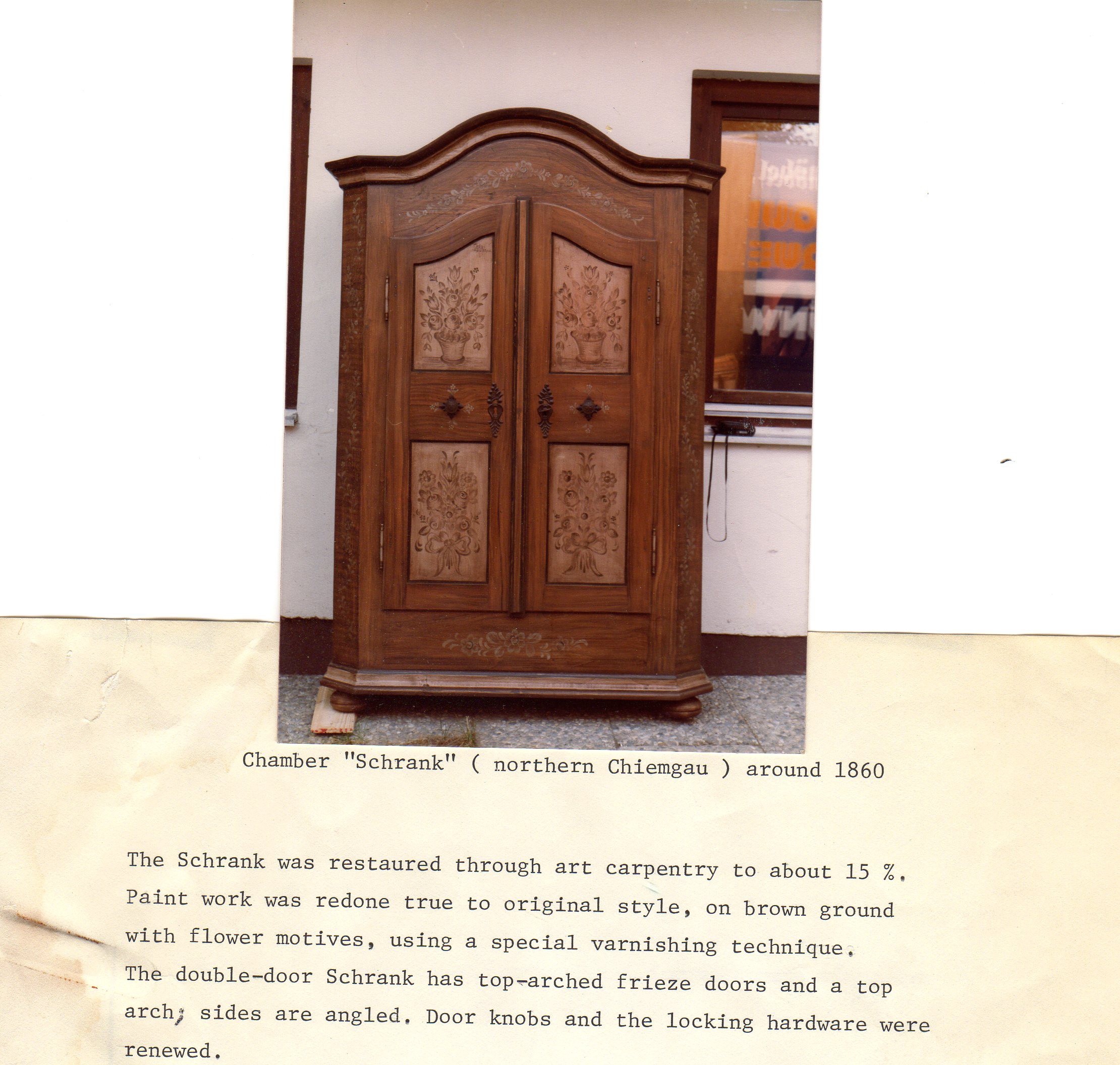 Double-door Chamber Schrank was restored through art carpentry. Paint work was redone true to original style, on brown ground with flower motives, using special varnishing technique. The double-door Schrank has top-arched frieze doors and a top arch: sides are angled. Door knobs and the locking hardware were renewed. The schrank was purchased in Germany and shipped to US in the late 1980's. This was an inherited item and the paperwork indicates age to be around 1890. But it was refinished in the original style.
