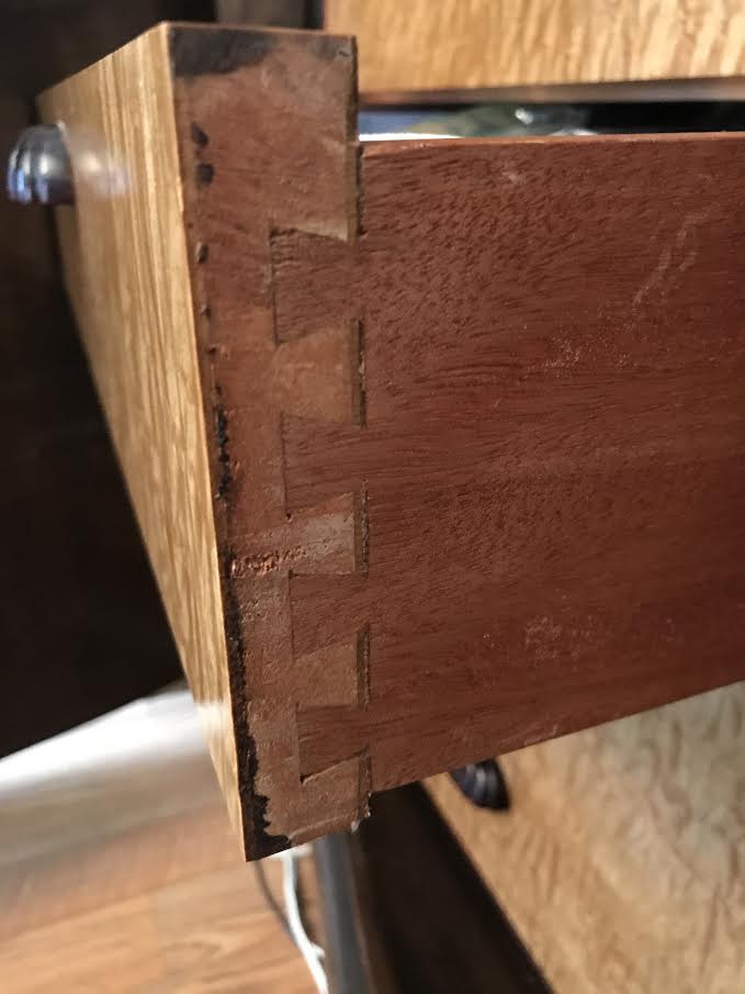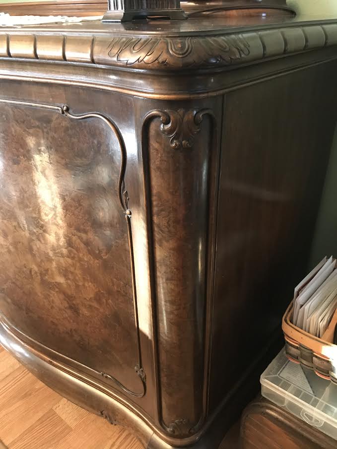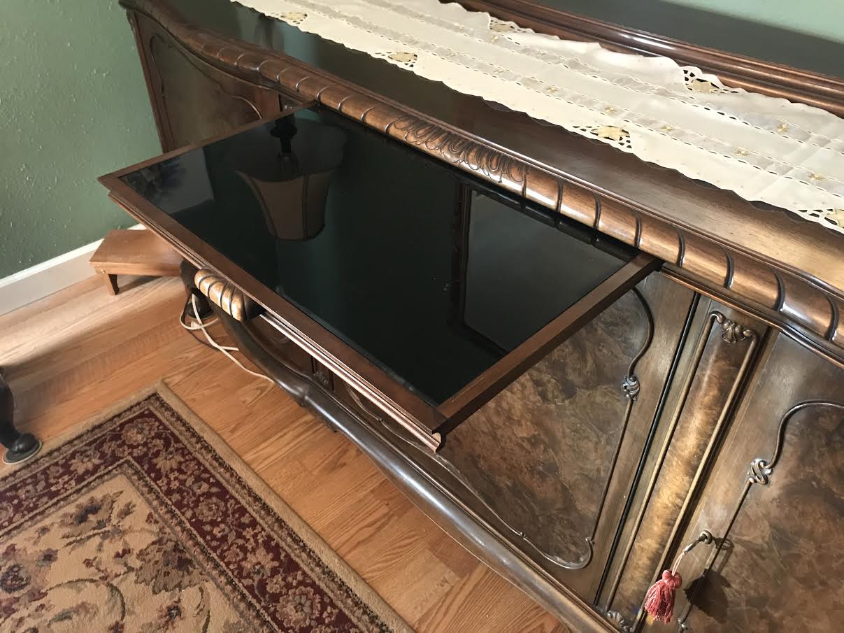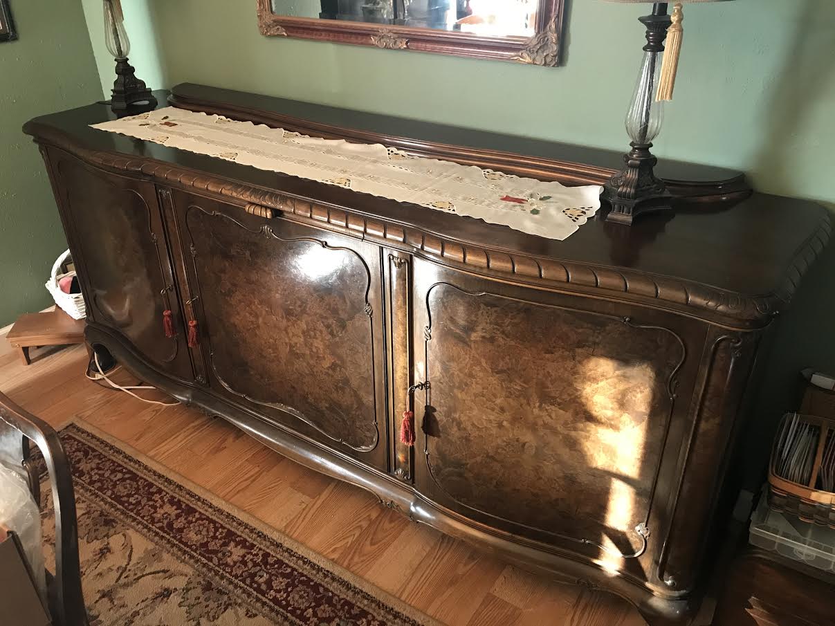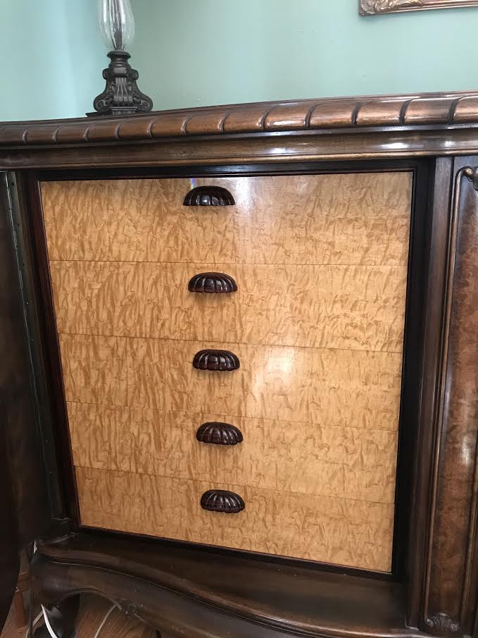 This Sideboard belonged to my Grandparents since the end of WW2. It was brought here to the USA from Heidelberg Germany around 15 years ago. I distinclty remember this furniture while visiting Germany in the 1970's and 80's, and have seen family photos much older with the furniture in them. From appraisals on another piece (China Buffet) of the same manufacturer, it pre-dates WW2 in it's making. It is in very good condition for it's age. It has 3 large doors, 2 with shelves, and one with drawers. Has a black glass slide out board for cutting? Very heavy piece, that appears to be designed to be taken apart by the looks of some of the hardware. I am looking for what would be it's current market value, as well as the possible Makers of these pieces, which I have been unable to find. I believe the Makers mark is on the backside of all 5 of the drawers (shown in one of the pictures).