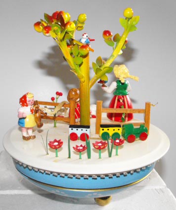 This was acquired through an estate. THe key is missing to wind the music box and there is a separate piece of a boy on a swing that should probably be hung on one of the trees. There are a few berries missing but not noticeable.