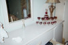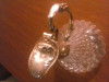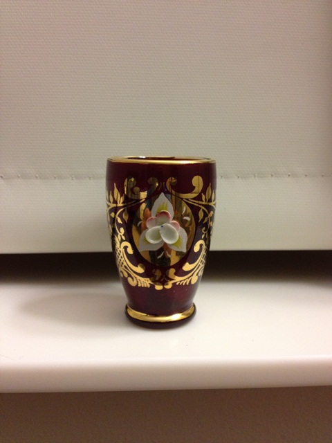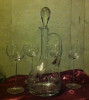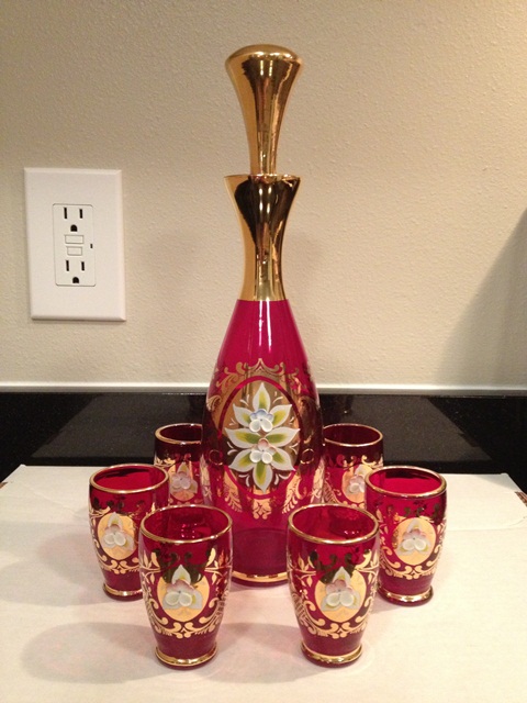 This is a decanter set that was owned by my great aunt. She worked for a dentist for a long time, and the dentist brought this set back from Germany as a gift in the 1950's or 1960's. I'm not sure if it was purchased new or as an antique at the time. It doesn't have a maker's mark that I can find. Everything looks hand made with painted gold and flowers that are raised. Looking for a value to sell or trade for .999 silver.
