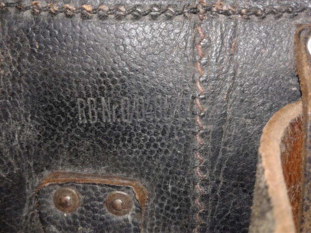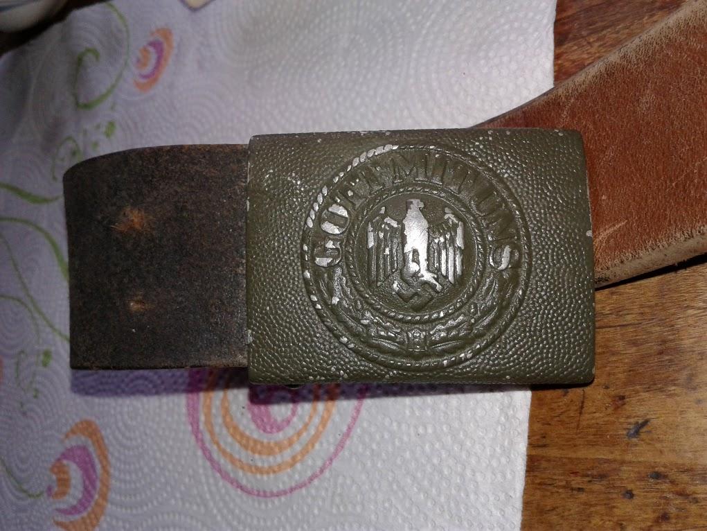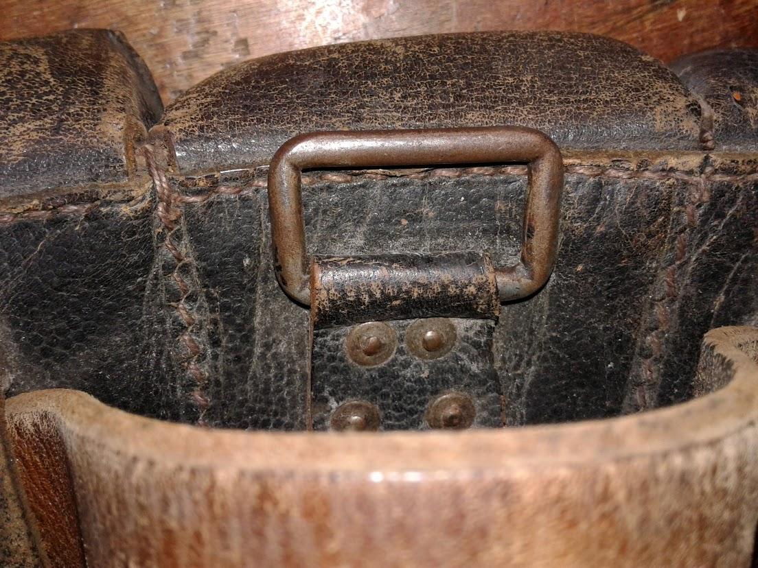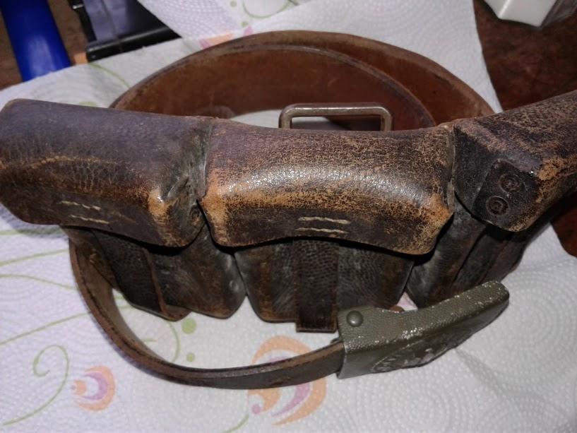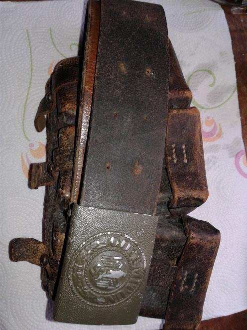 Green with wear German buckle beaded aluminum w/ black & brown on other side Leather belt w/ ammo pouch.