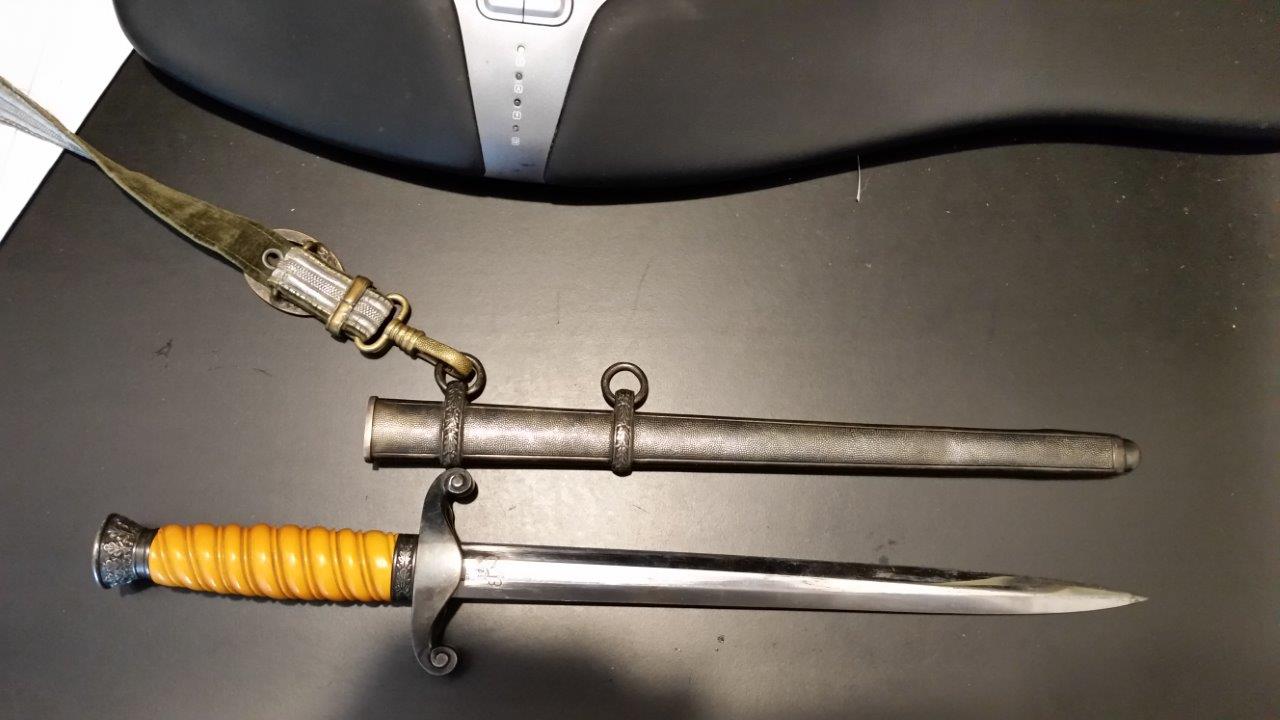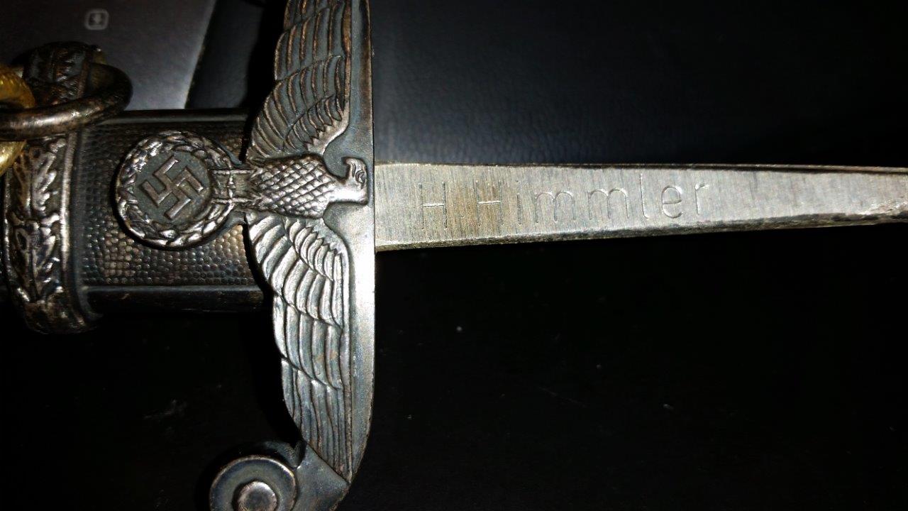 German WWll Dagger. 14.5" long unsheathed. Blade inscribed " Original Eickhorn". Under the handle inscribed "H HIMMLER".