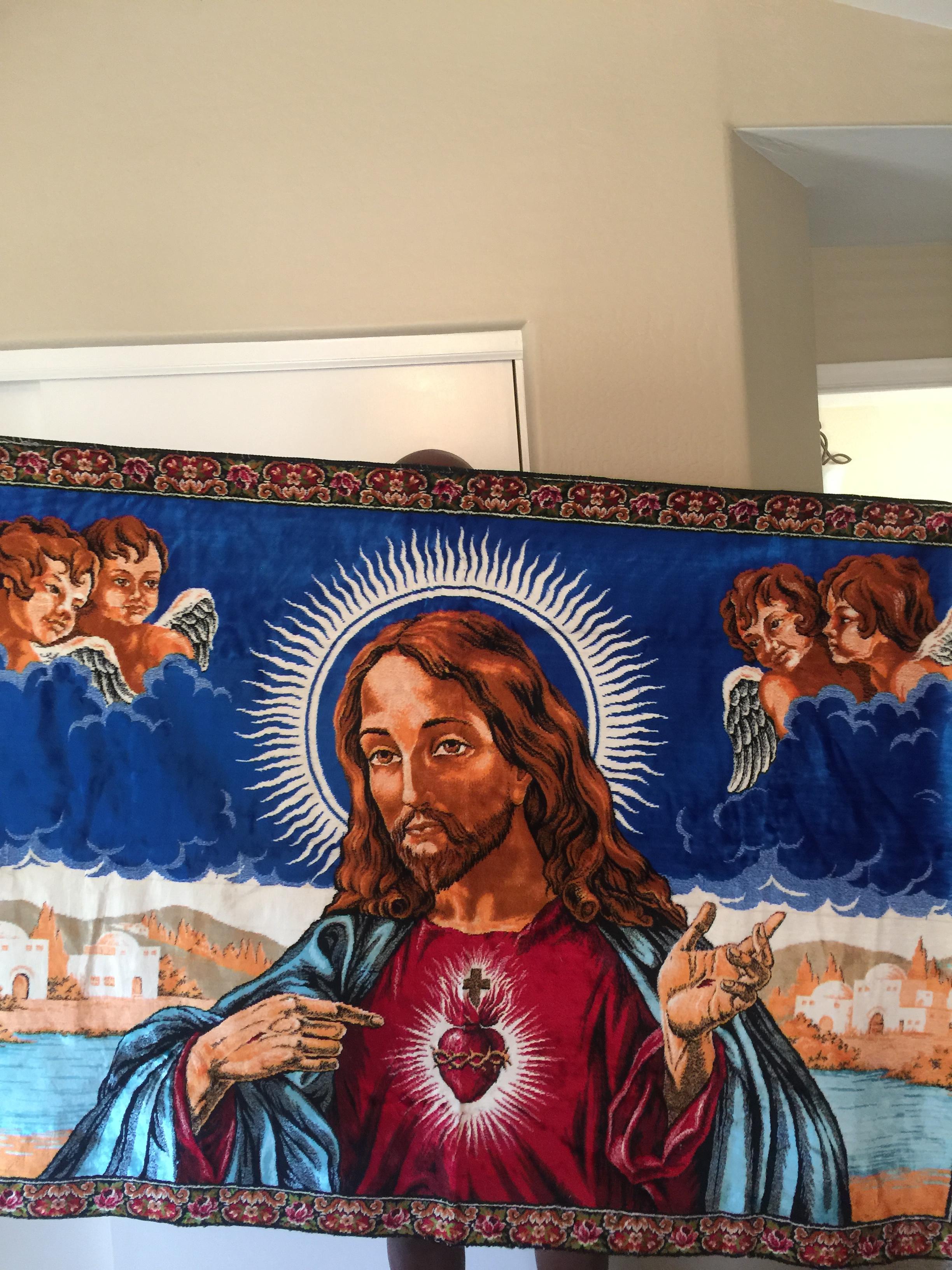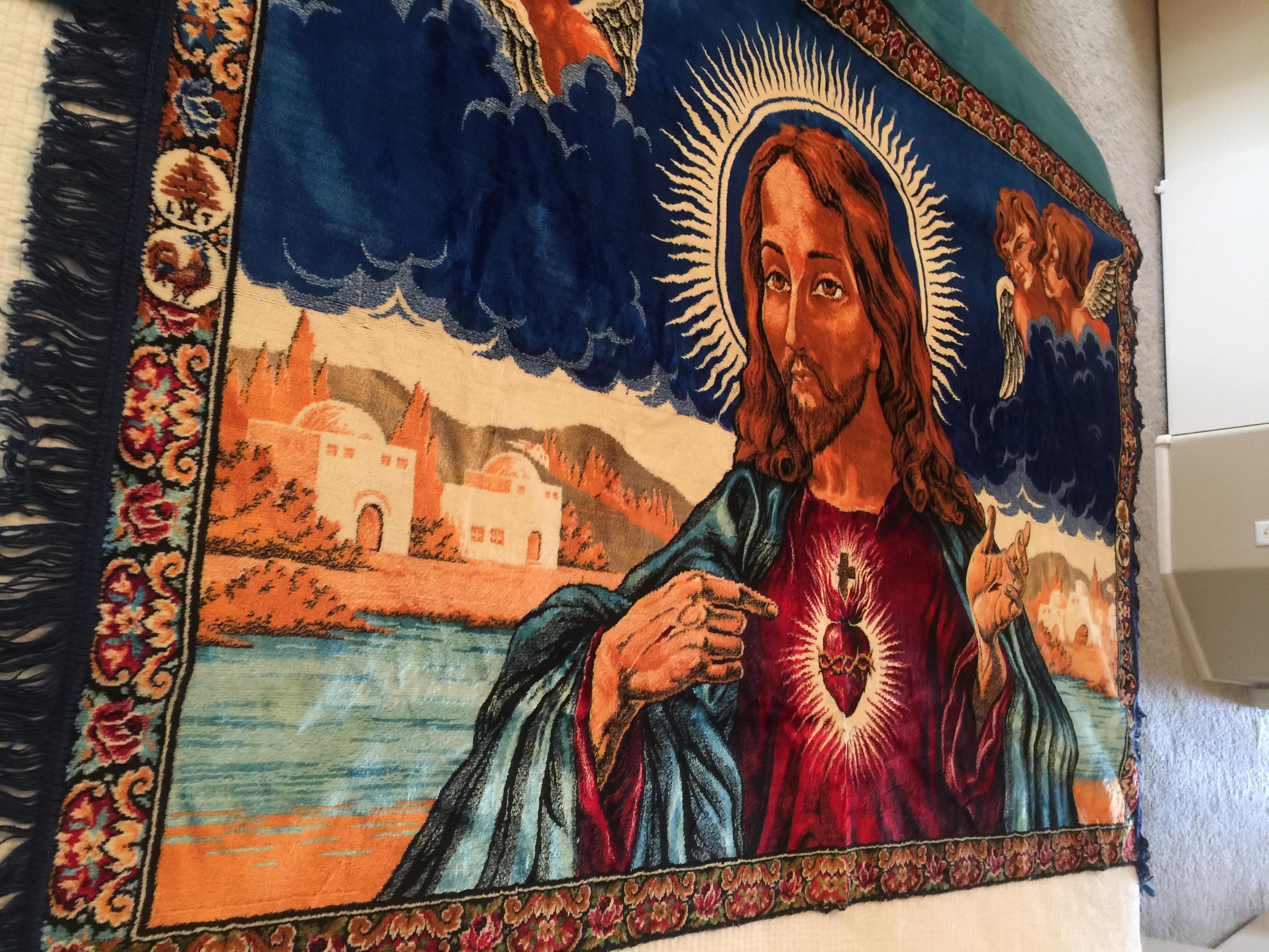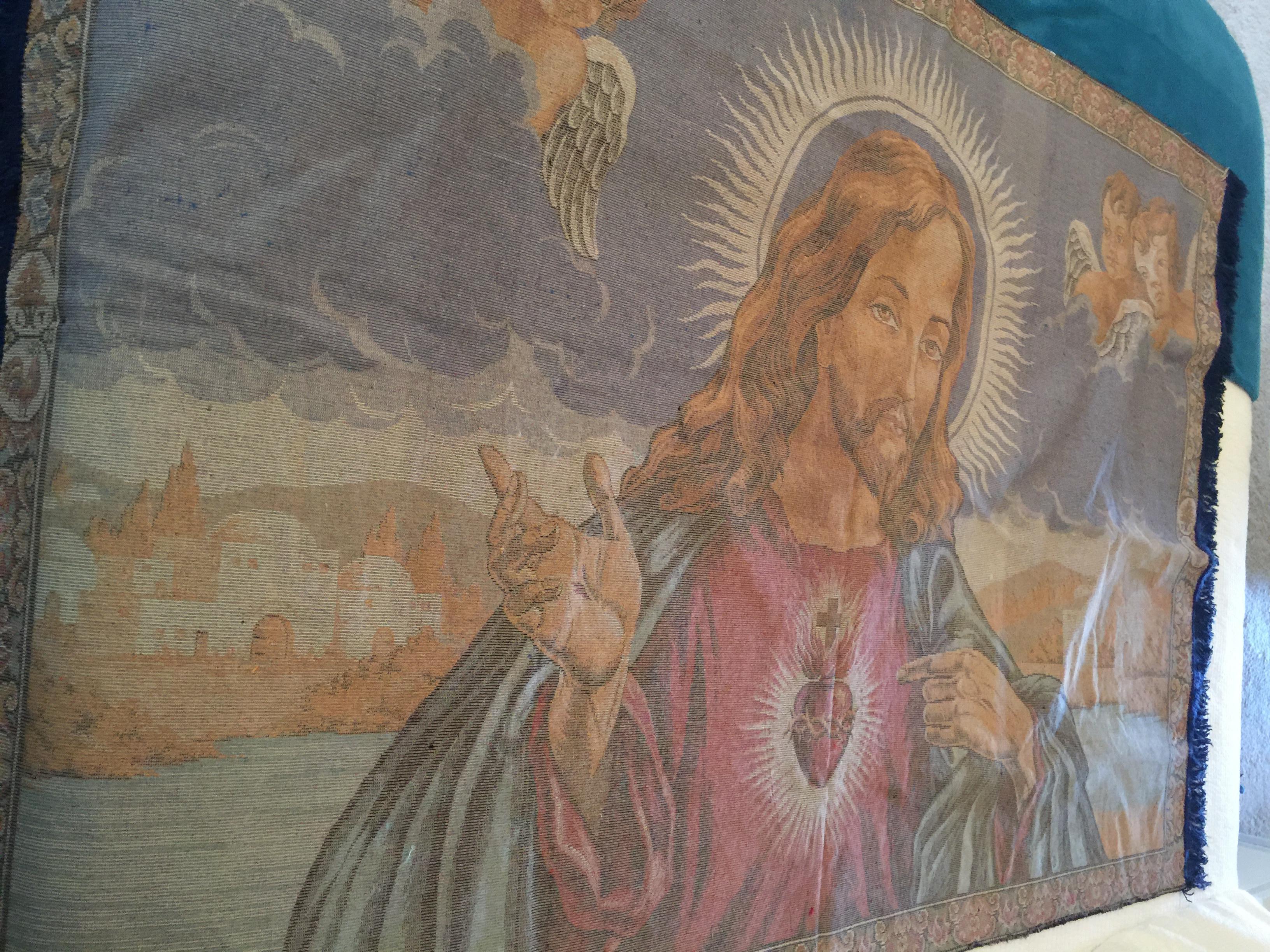 My husband was in the US Army 45 years ago and went to Germany he bought it from a man who made this handmade. It’s been stored all this years and it’s in a great shape. The tapestry has Jesus Christ in front surrounded by angels, water and a few buildings. Measurements are 72 by 46 in