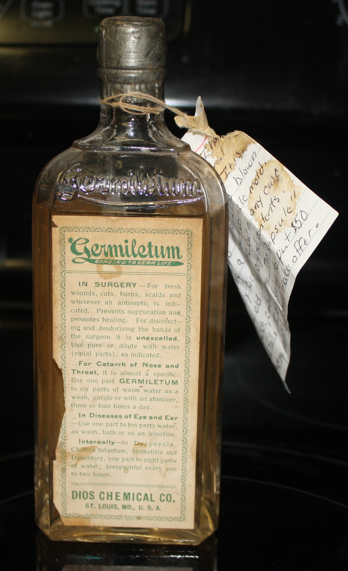 I picked this up from a flea market in West Virginia. The vendor said he couldnt find anything out about it and really didnt know what it was worth. He said he believed that the bottle had never been opened and that the lid is made of lead.